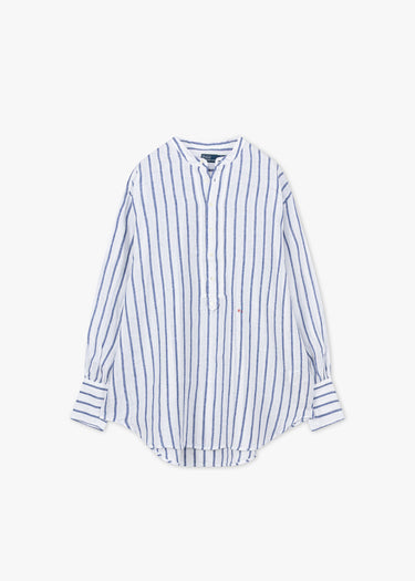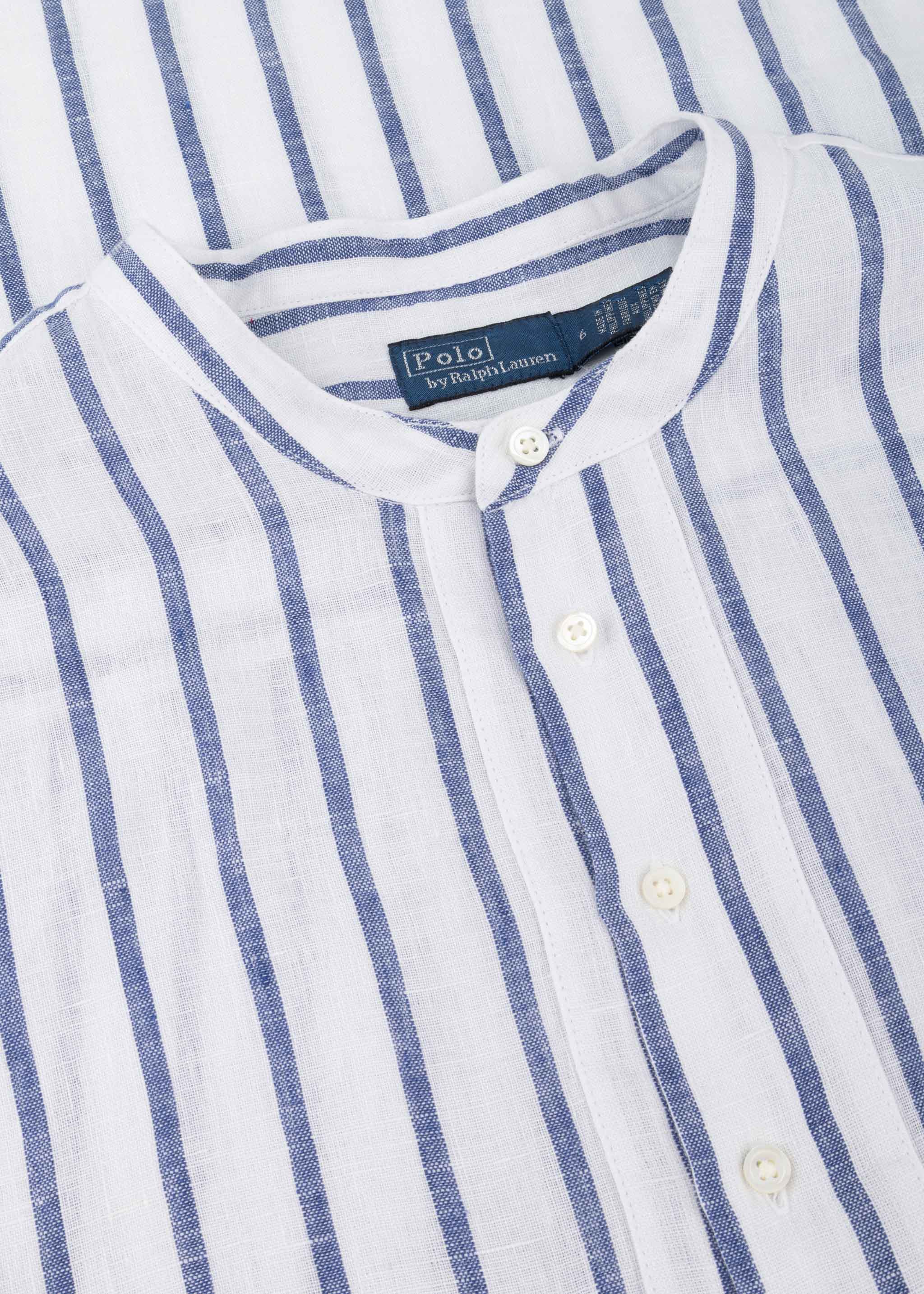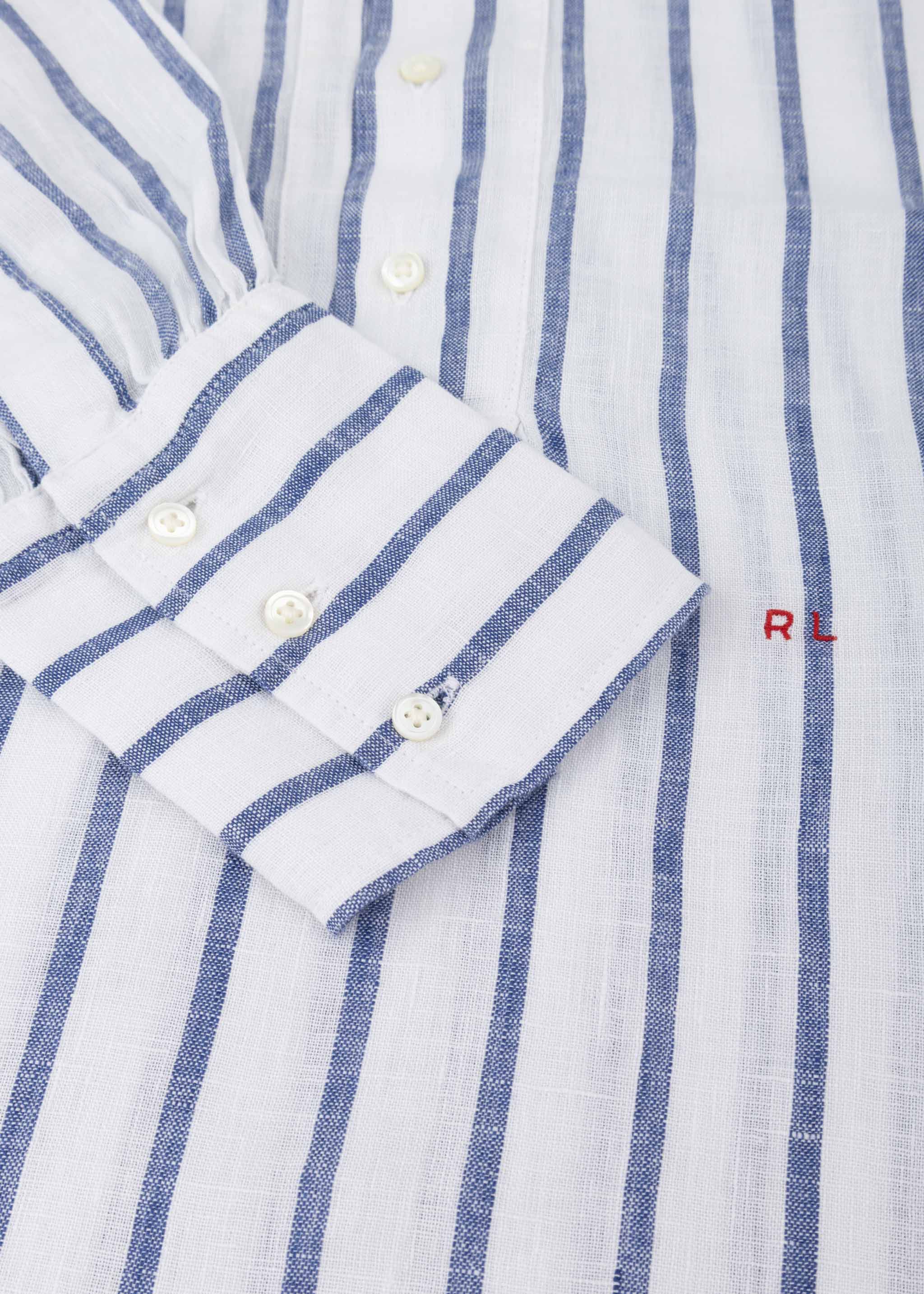Gestreifte Hemdbluse von Polo Ralph Lauren aus luftigem Leinen zum Schlupfen, Stehkragen mit kurzer Knopfleiste, Rückenpasse mit gelegten Falten, überschnittene Schultern, lange Ballonärmel mit verlängerten Knopfmanschetten, gesticktes Logo, Vokuhila-Saum, bewusst locker geschnitten.