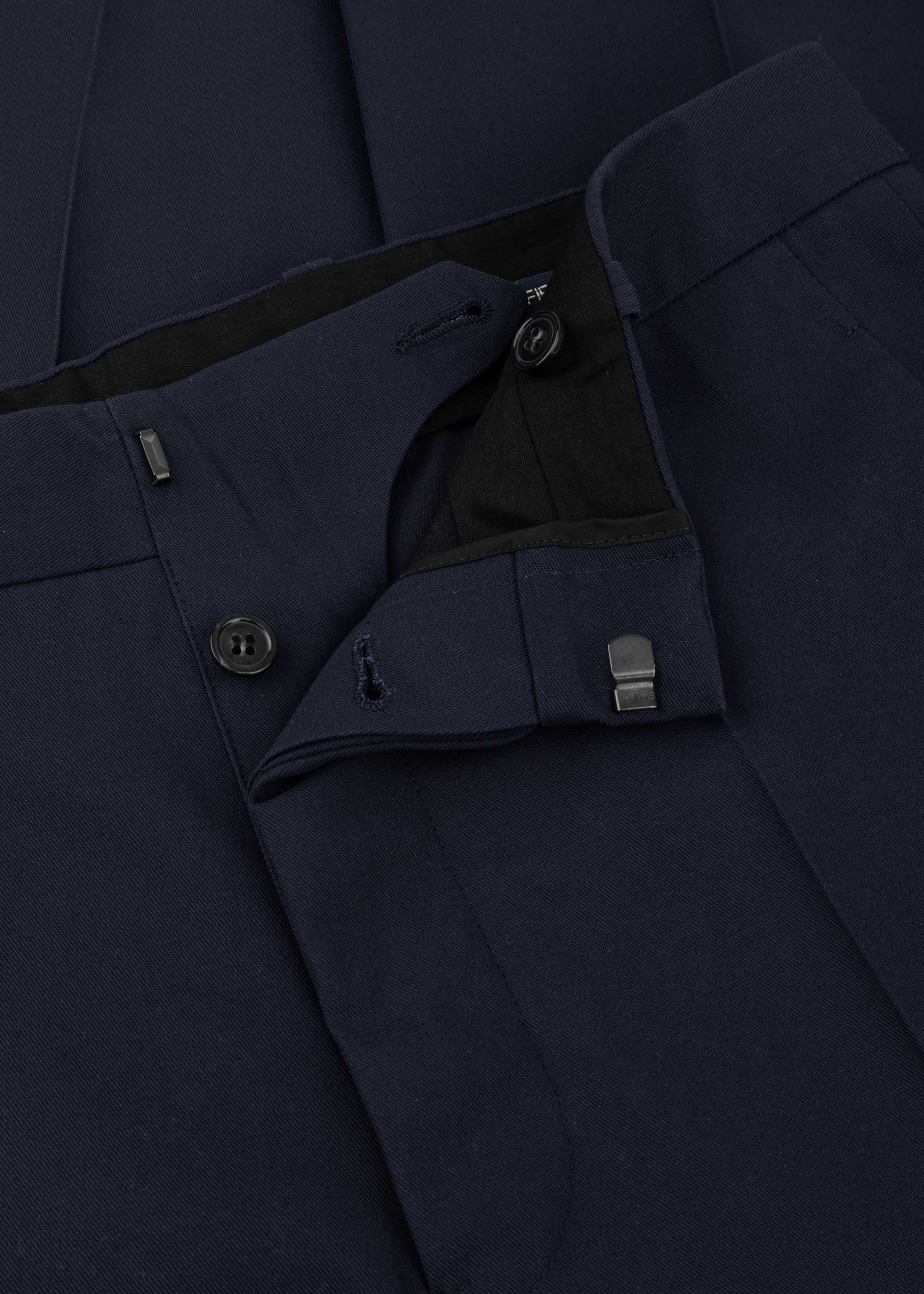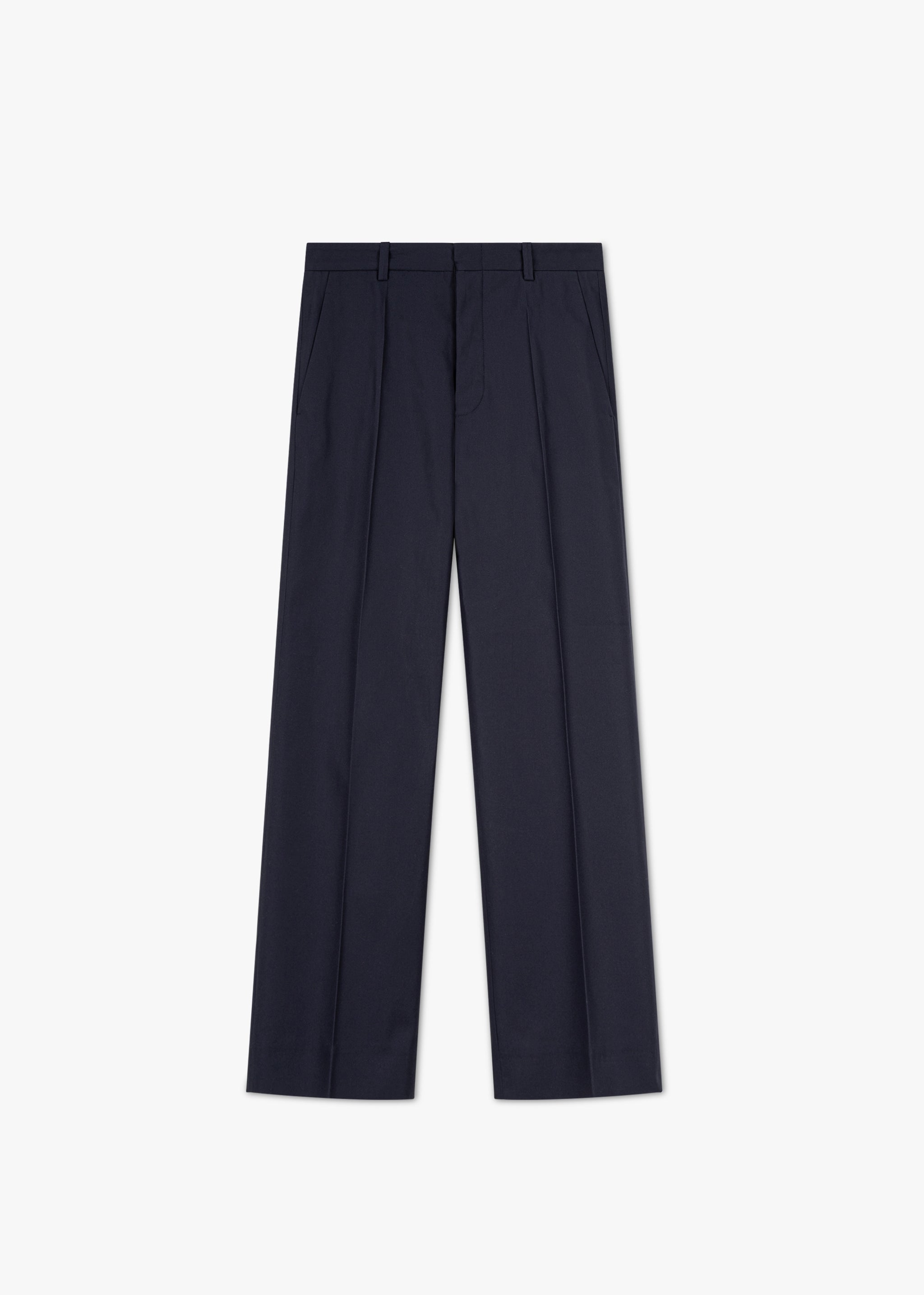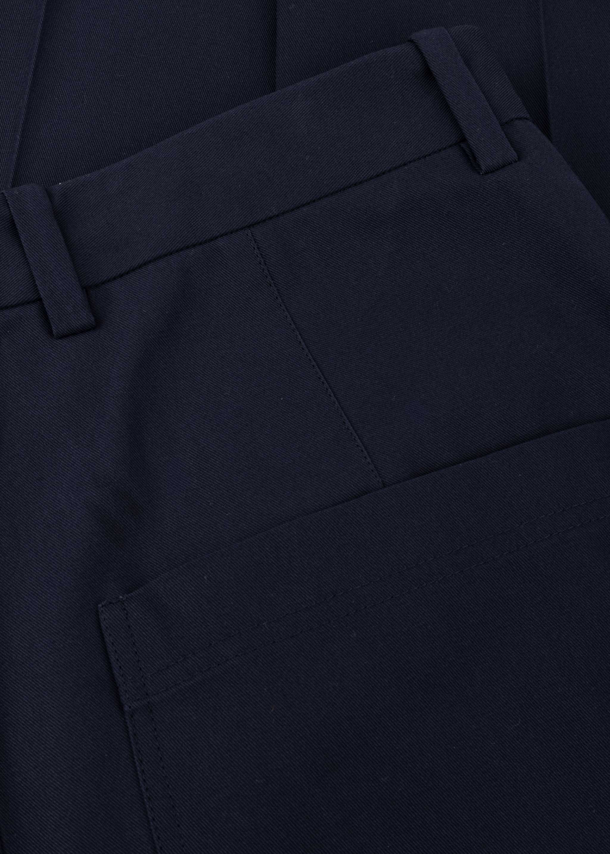 Knöchellange Hose 'Prae' von Sofie D’Hoore aus fester Baumwolle, Gürtelschlaufen, Bügelfalten, Haken-, Knopf- und Reißverschluss, seitliche Eingriffstaschen, eine aufgesetzte Gesäßtasche, niedrige Bundhöhe, sehr tiefer Schritt.