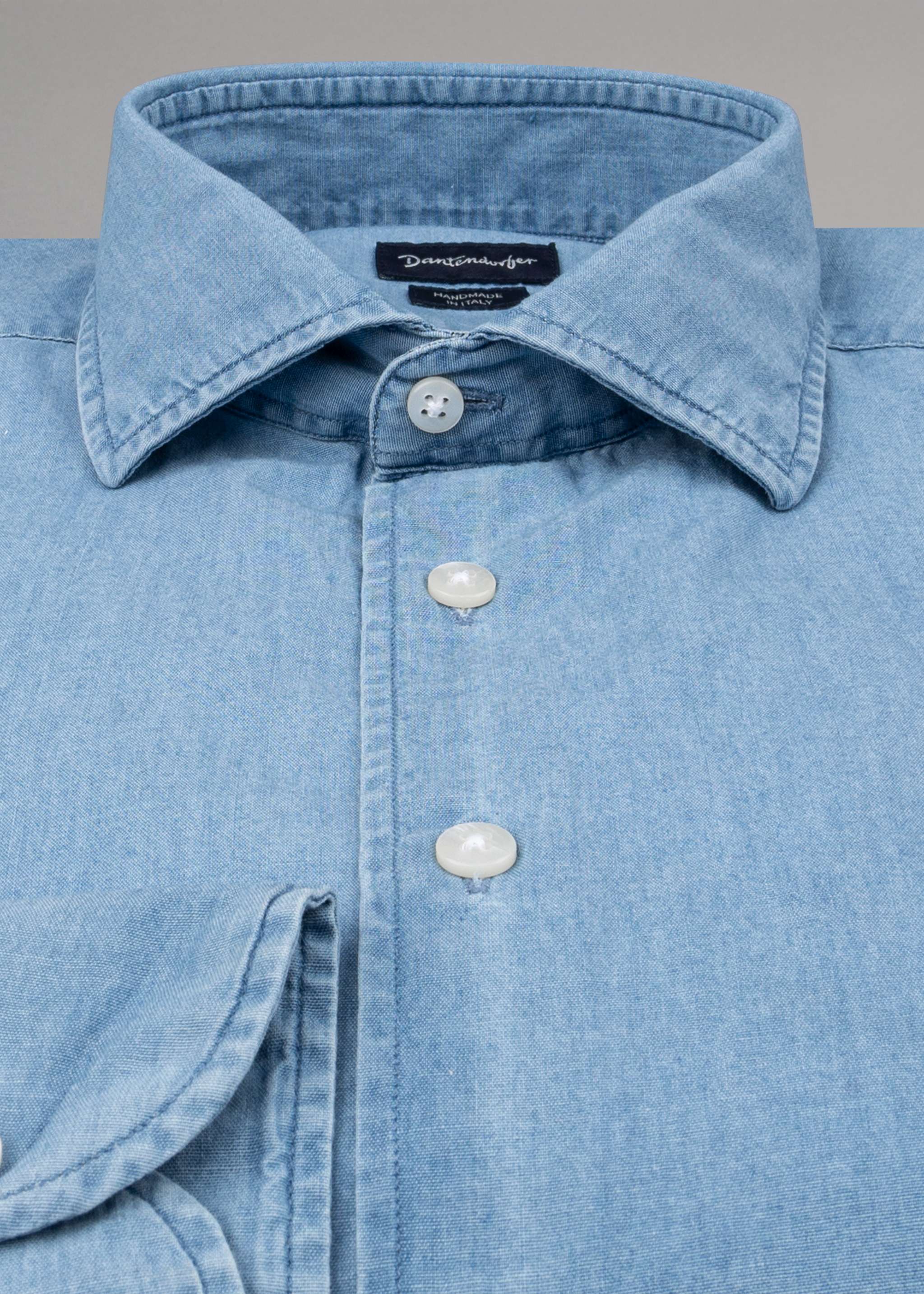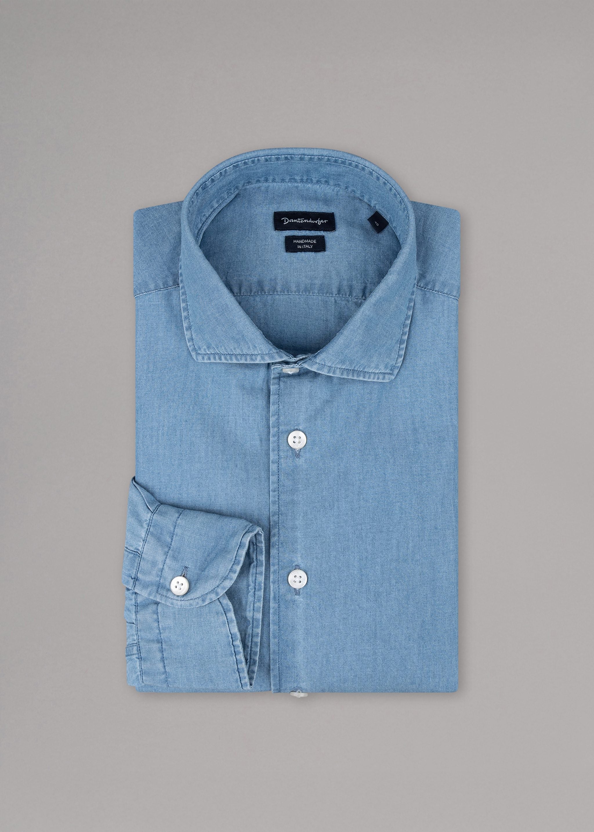 Handgefertigtes Hemd von Dantendorfer aus weicher Baumwolle, Haifischkragen, Rückenpasse, lange Ärmel mit Knopfmanschette, durchgehende Knopfleiste, abgerundeter Saum.