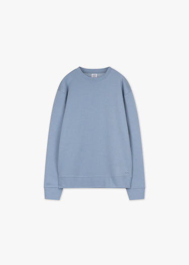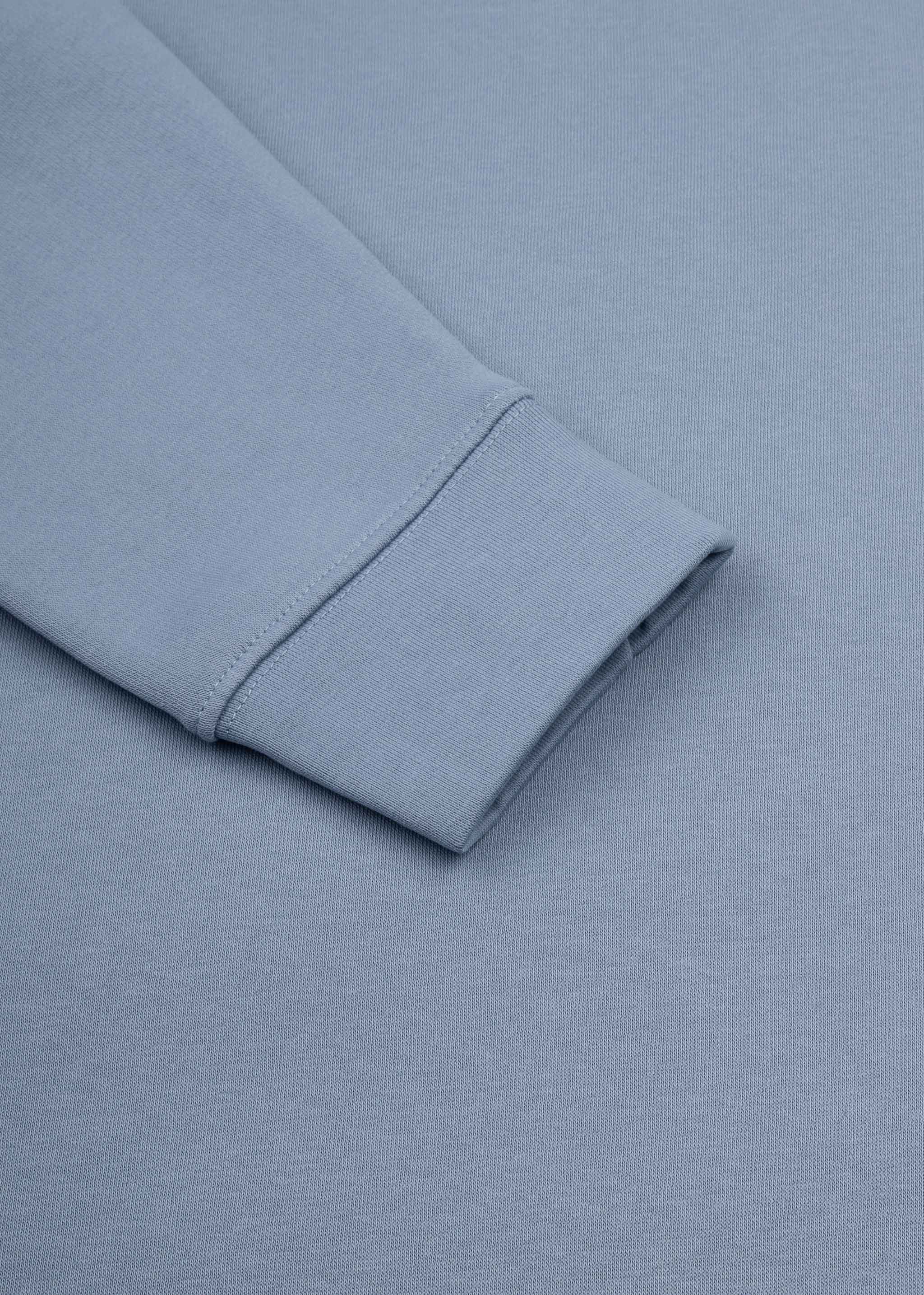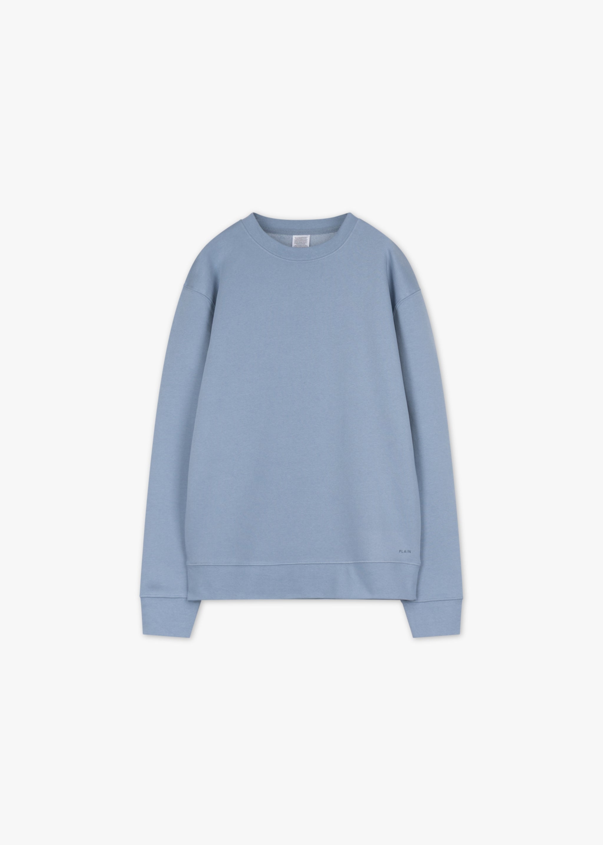 Unisex Pullover von PLAIN aus weicher Baumwolle, Rundhalsausschnitt, flauschige Innenseite, überschnittene Schultern, gerader Saum mit kleinem Logo-Druck gerippte Abschlüsse.