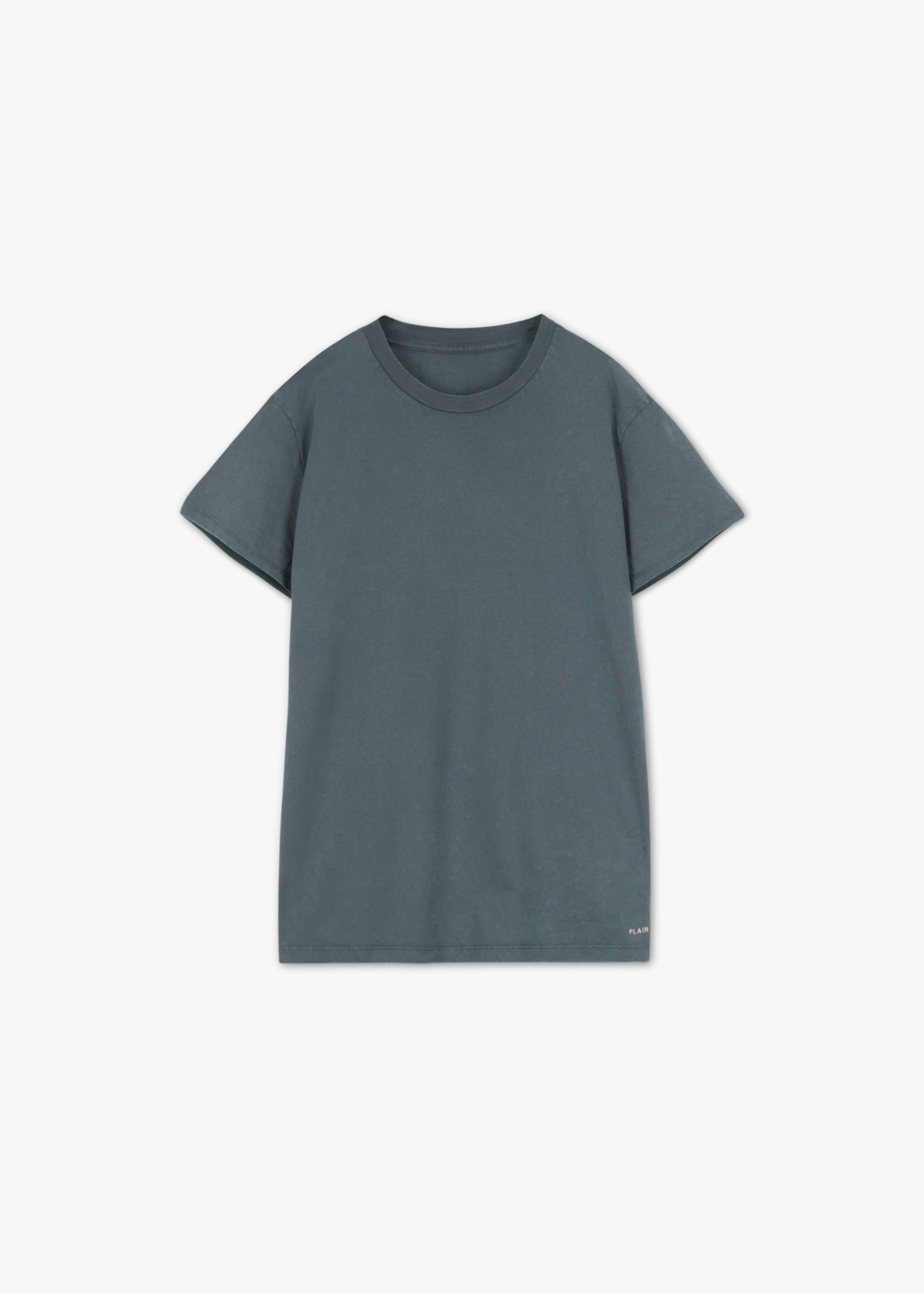Unisex T-Shirt von PLAIN aus weicher Bio-Baumwolle, gerippter Rundhalsausschnitt, kurze Ärmel, gerader Saum mit kleinem Logo-Druck.