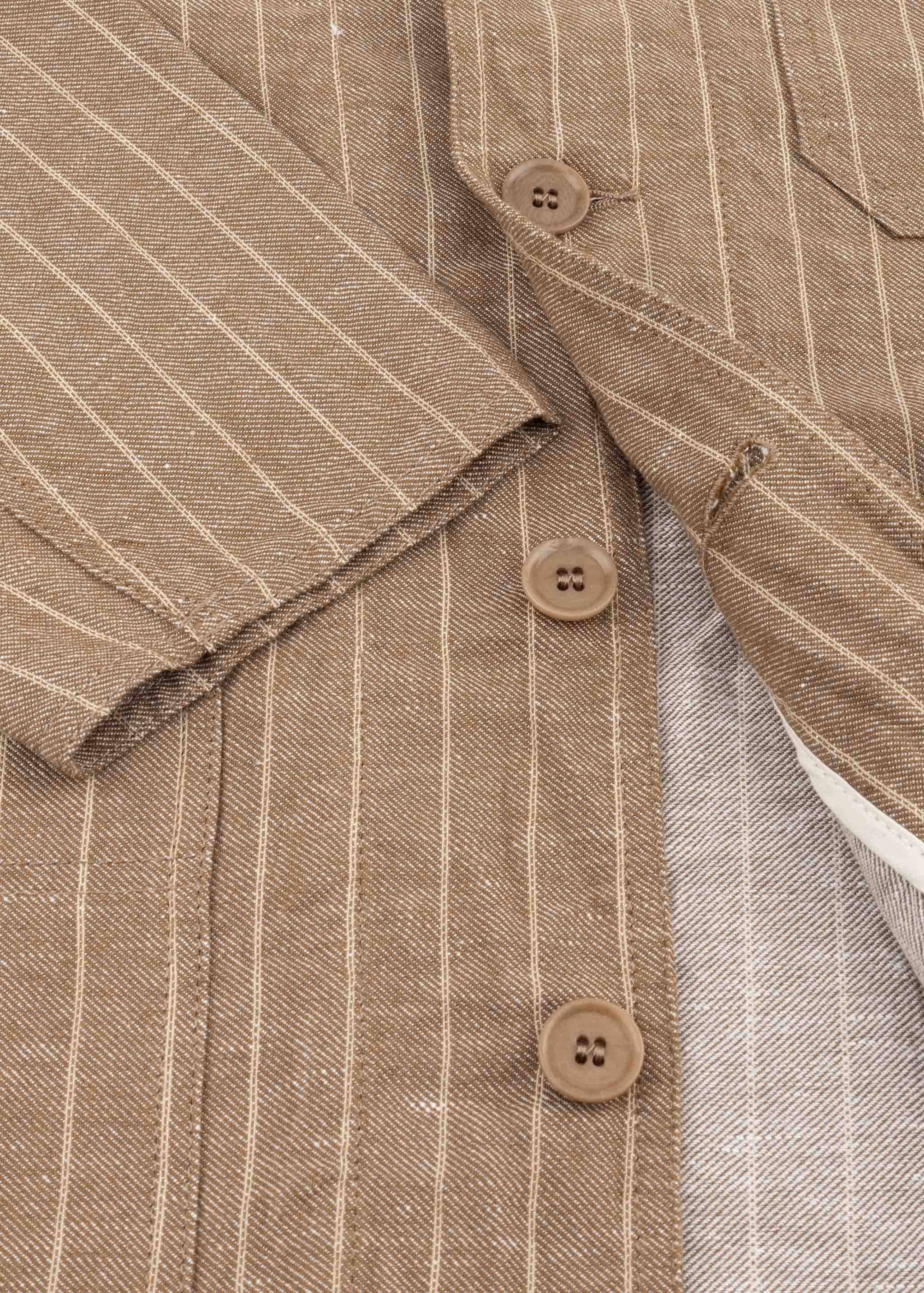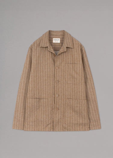 Gestreifte Jacke 'Creek' von East Harbour Surplus, klassischer Kragen, leicht überschnittene Schultern, lange Ärmel, Rückenpasse mit Quetschfalte, durchgehende Knopfleiste, drei aufgesetzte Taschen, gerader Saum, ungefütterte Verarbeitung.