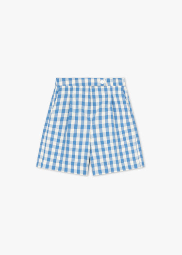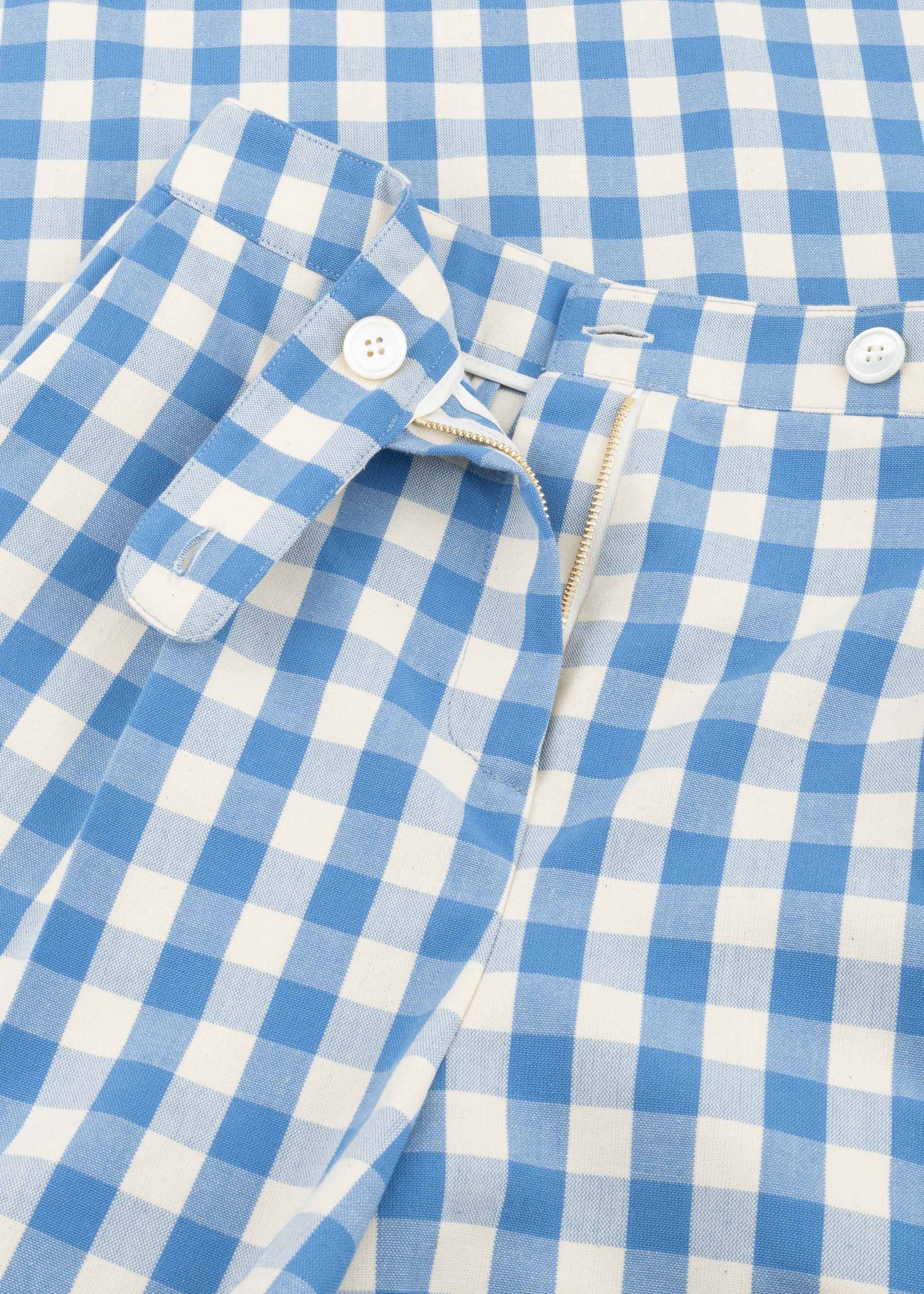 Karierte 'Bermudini' Shorts von Pialea, schließt mit Knopf und Reißverschluss, Bund- und Bügelfalten, Taillenabnäher am hinterem Bund, seitliche Eingriffstaschen, eine kleine Gesäßtasche, Hosensaum mit Umschlag.