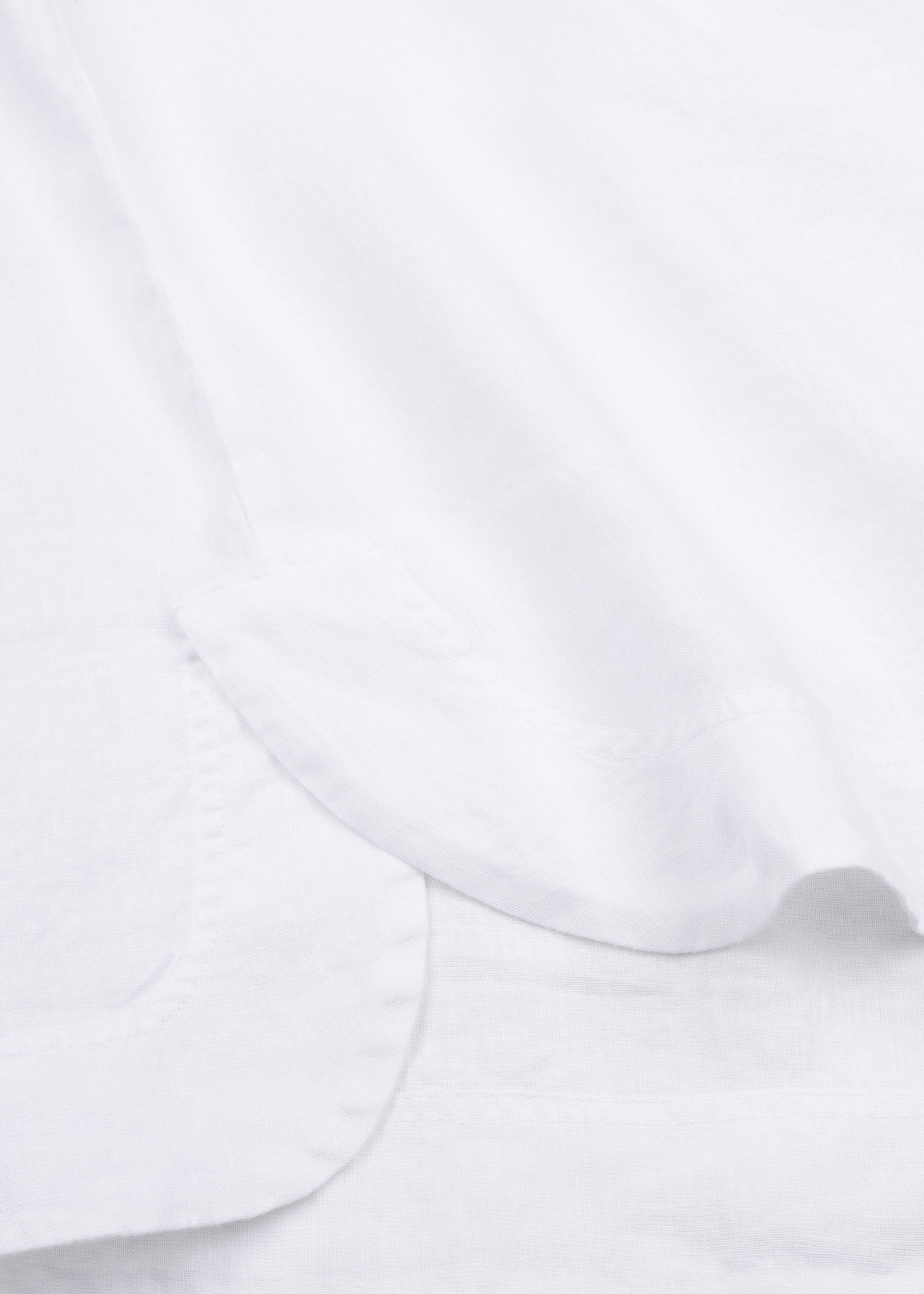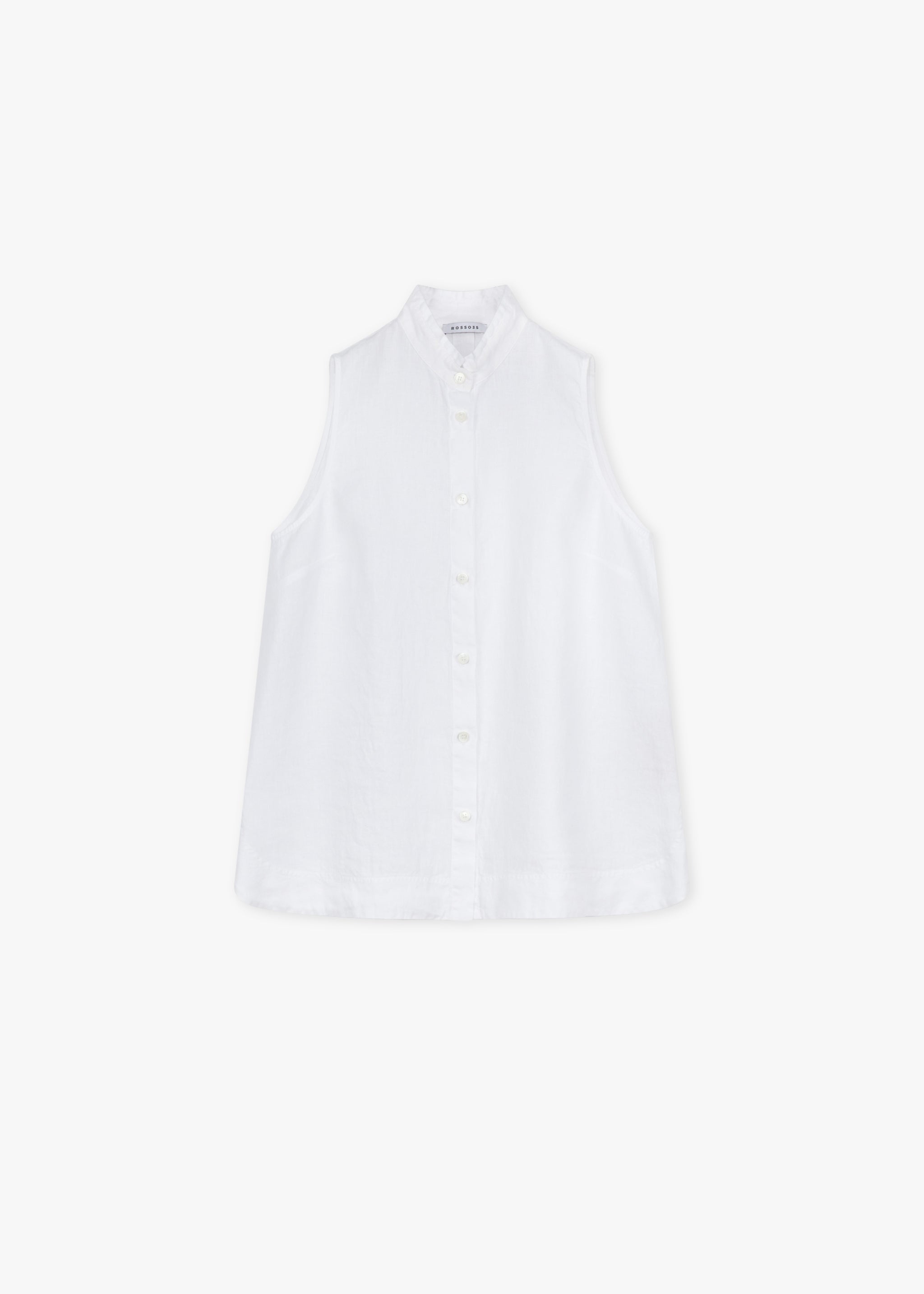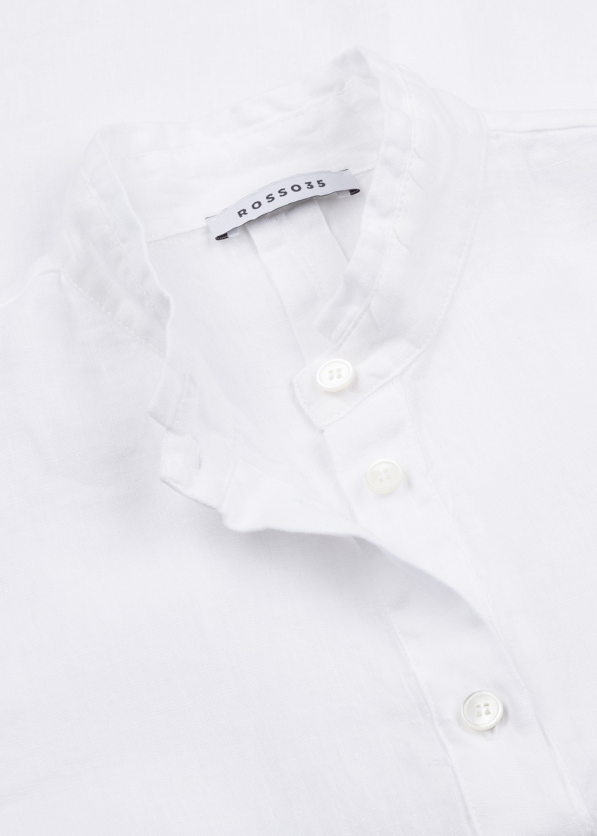 Bluse von Rosso35 aus weichem Leinen, Stehkragen, durchgehende Knopfleiste, Brustabnäher, Kellerfalte im Rückenteil, abgerundeter Saum, leicht transparent.