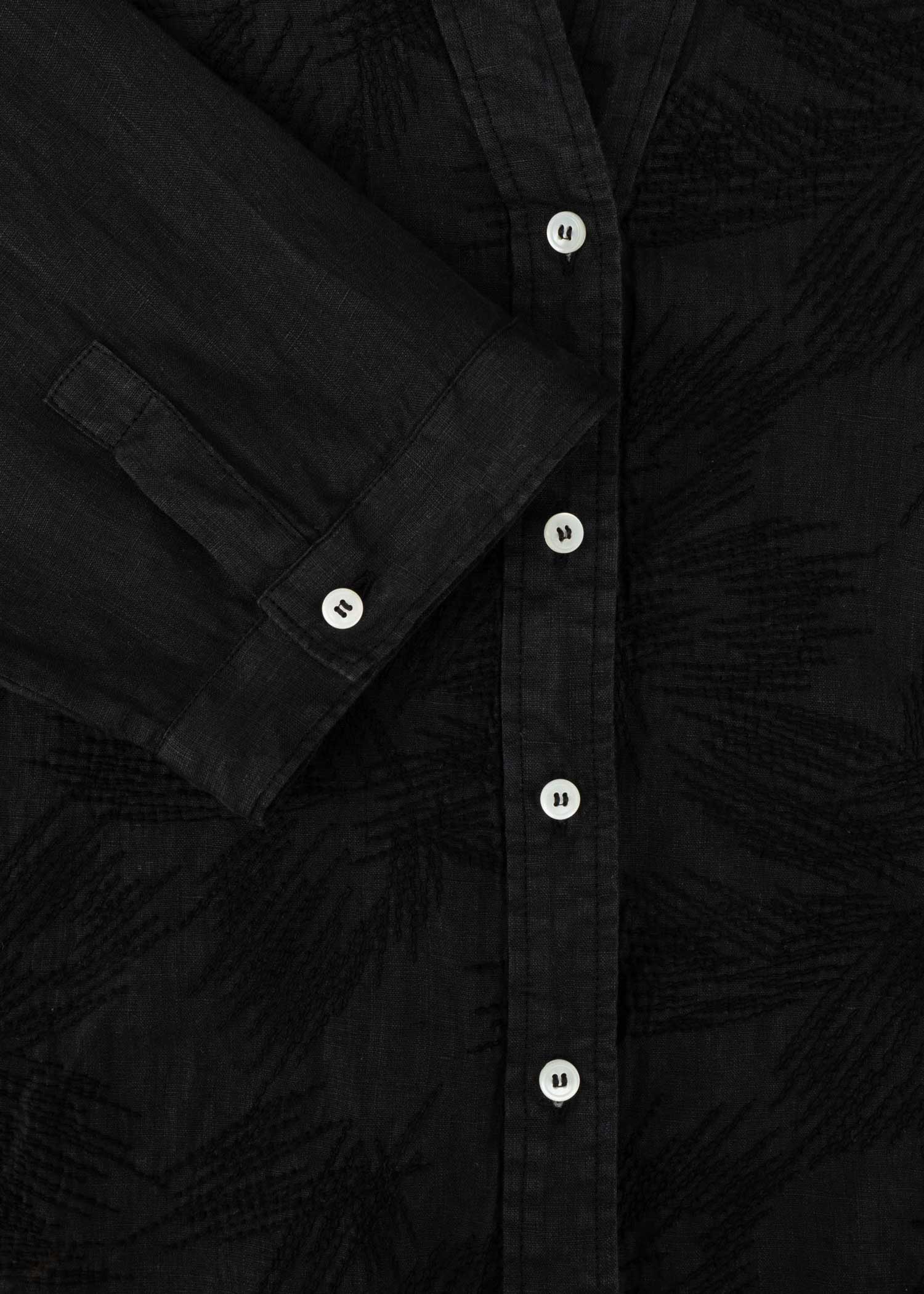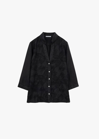 Bluse von Rosso35 aus Leinen mit Stickerei, Stehkragen mit V-Ausschnitt, durchgehende Knopfleiste, 3/4 Arm mit Knopfmanschette, Rückenpasse, Brustabnäher, gerader Saum.