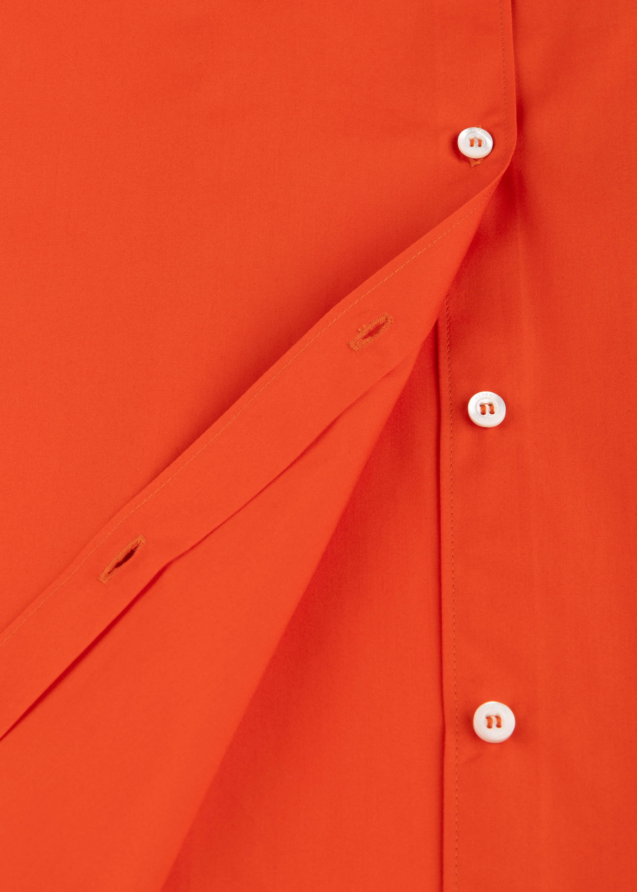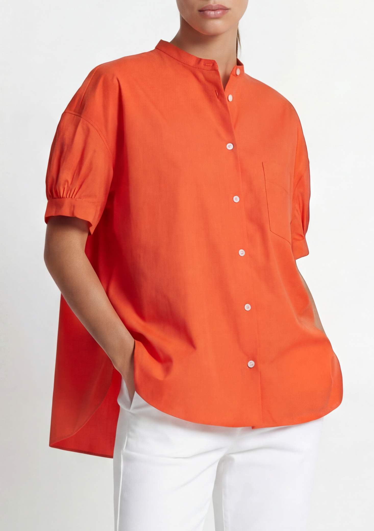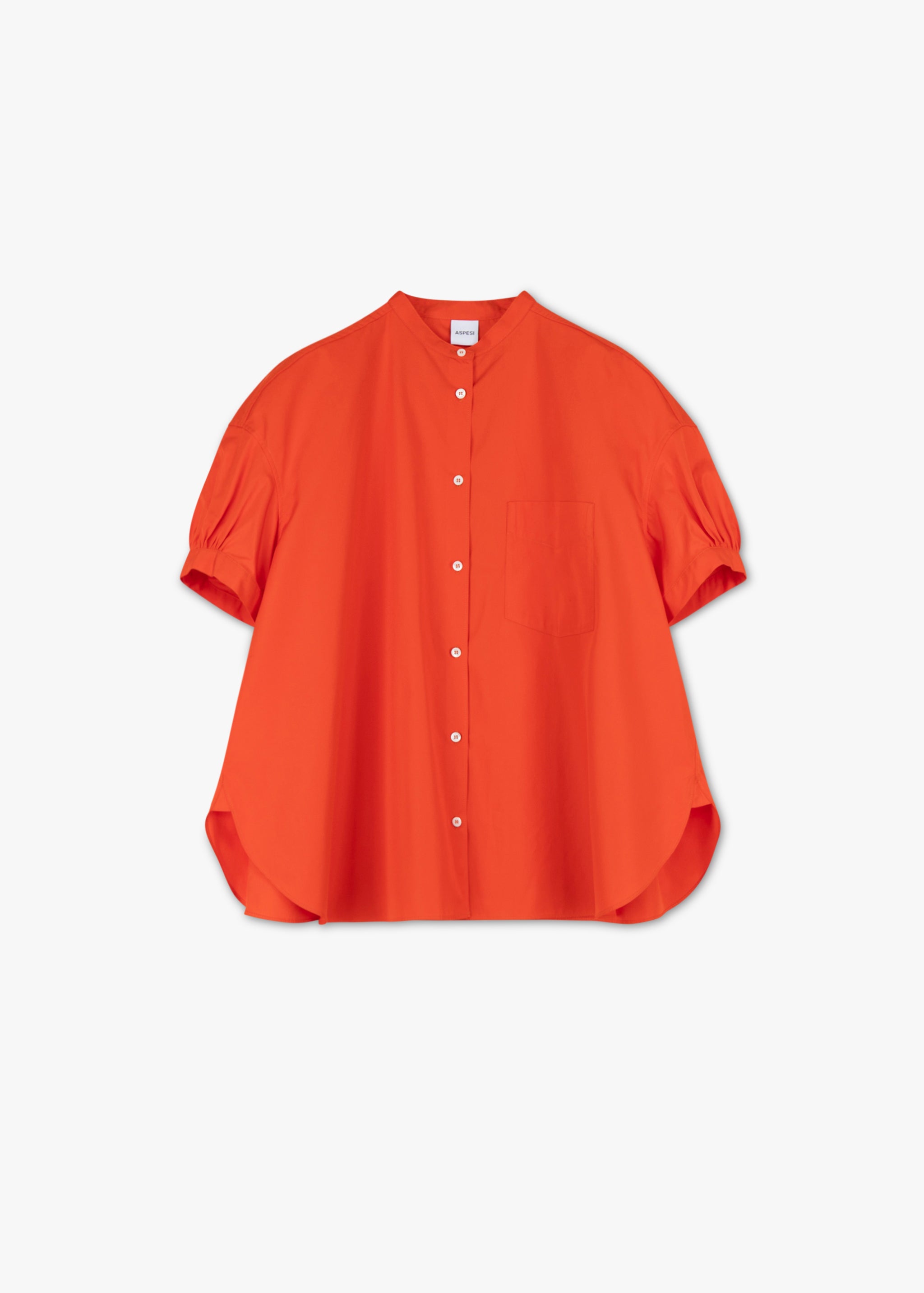 Oversized Bluse von Aspesi aus weicher Baumwolle, Stehkragen, überschnittene Schultern, kurze Puffärmel mit Knopfmanschetten, Kellerfalte im Rückenteil, Brusttasche, Knopfleiste, abgerundeter Saum, glatter Griff.