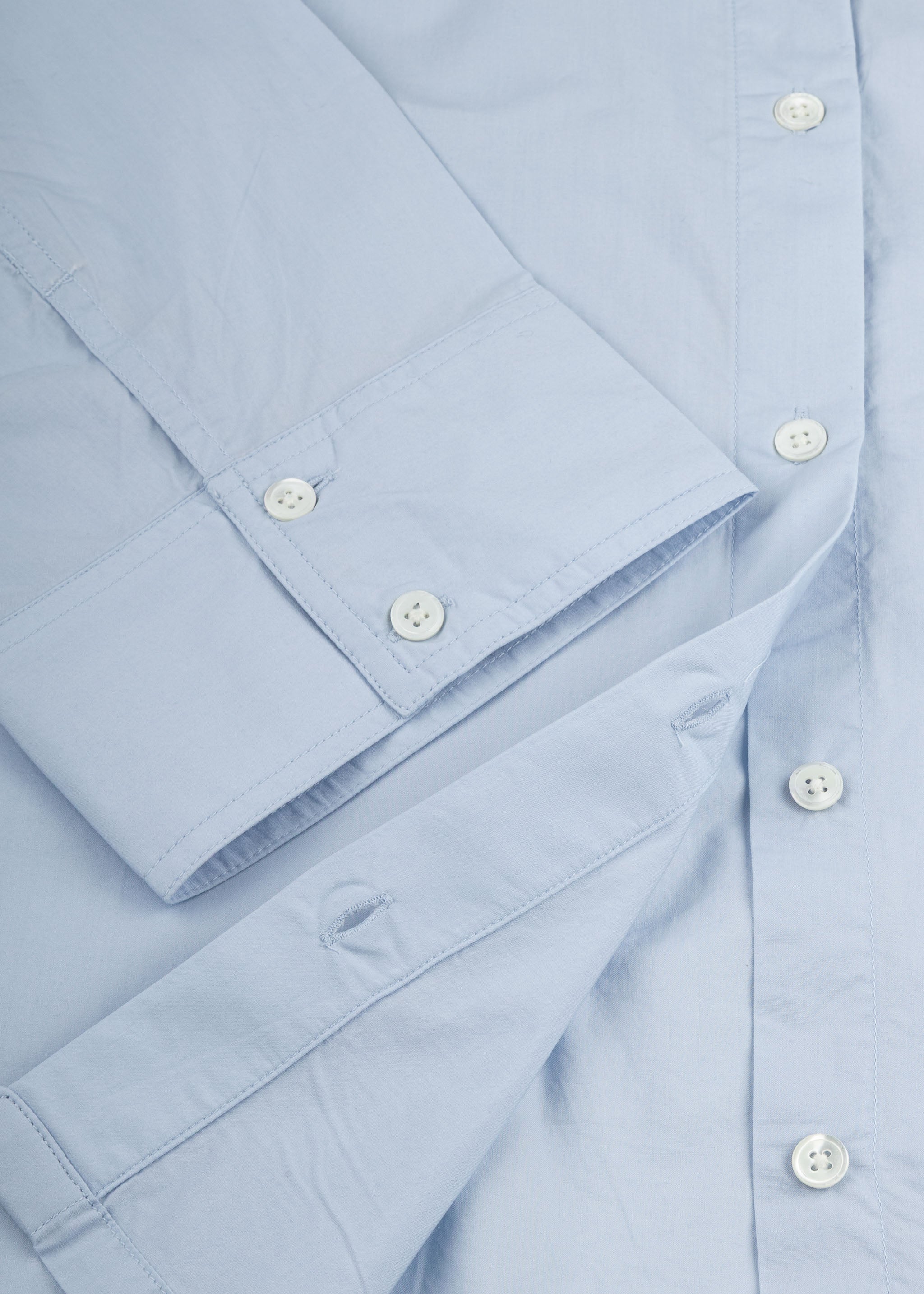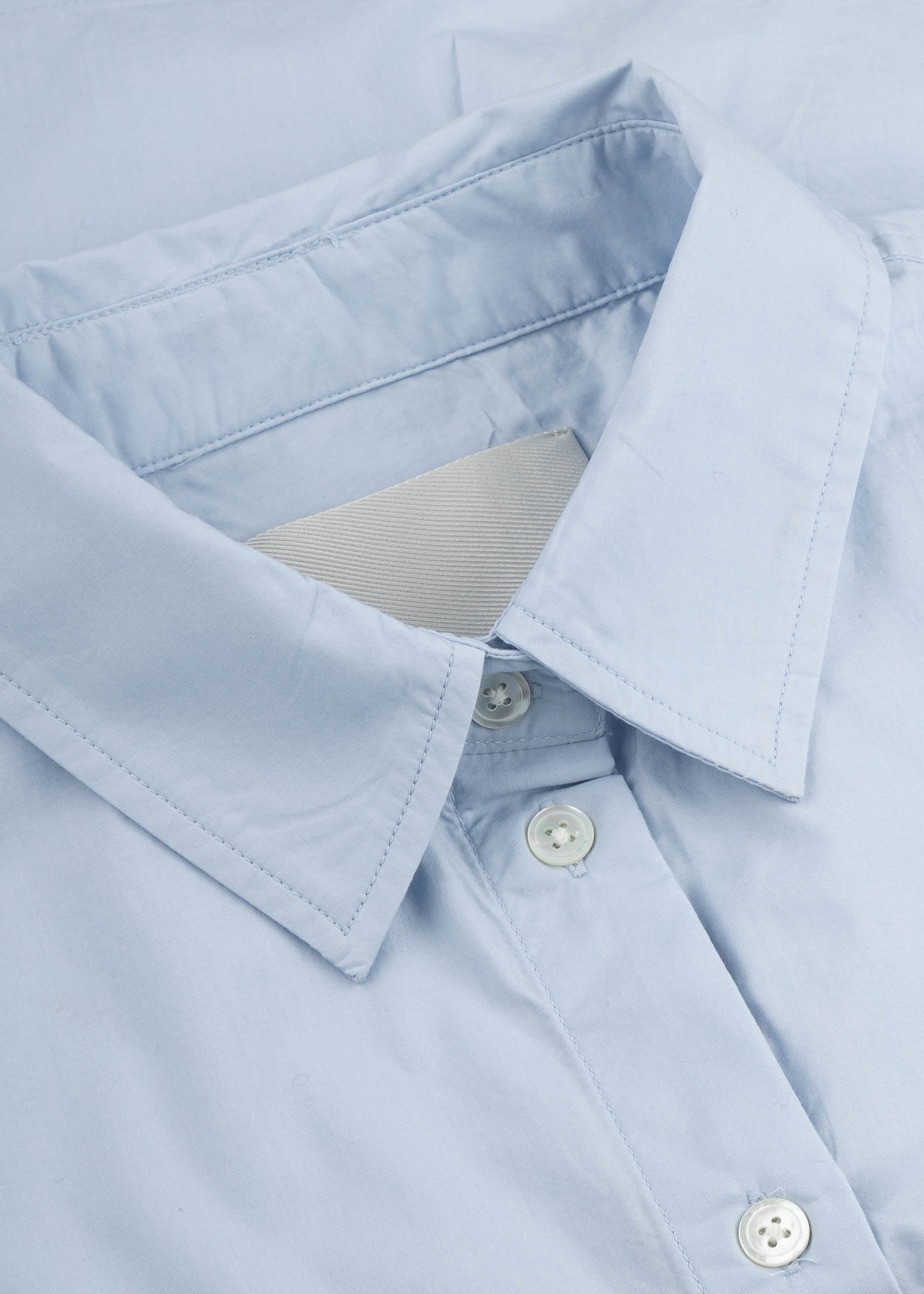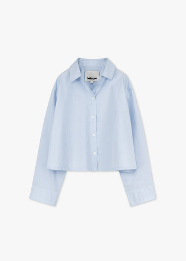 Kurze Bluse 'Capri' von Bellerose aus weicher Baumwolle, klassischer Kragen, überschnittene Schultern, lange Ärmel mit Knopfmanschetten, durchgehende Knopfleiste, kleine Logo-Stickerei, Rückenpasse mit Quetschfalte, gerader Saum.