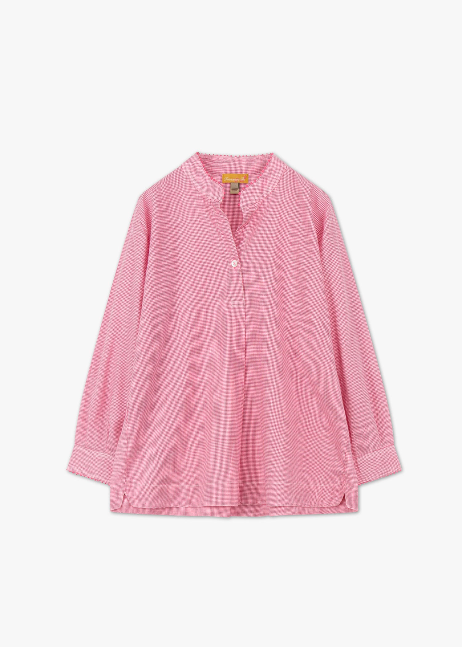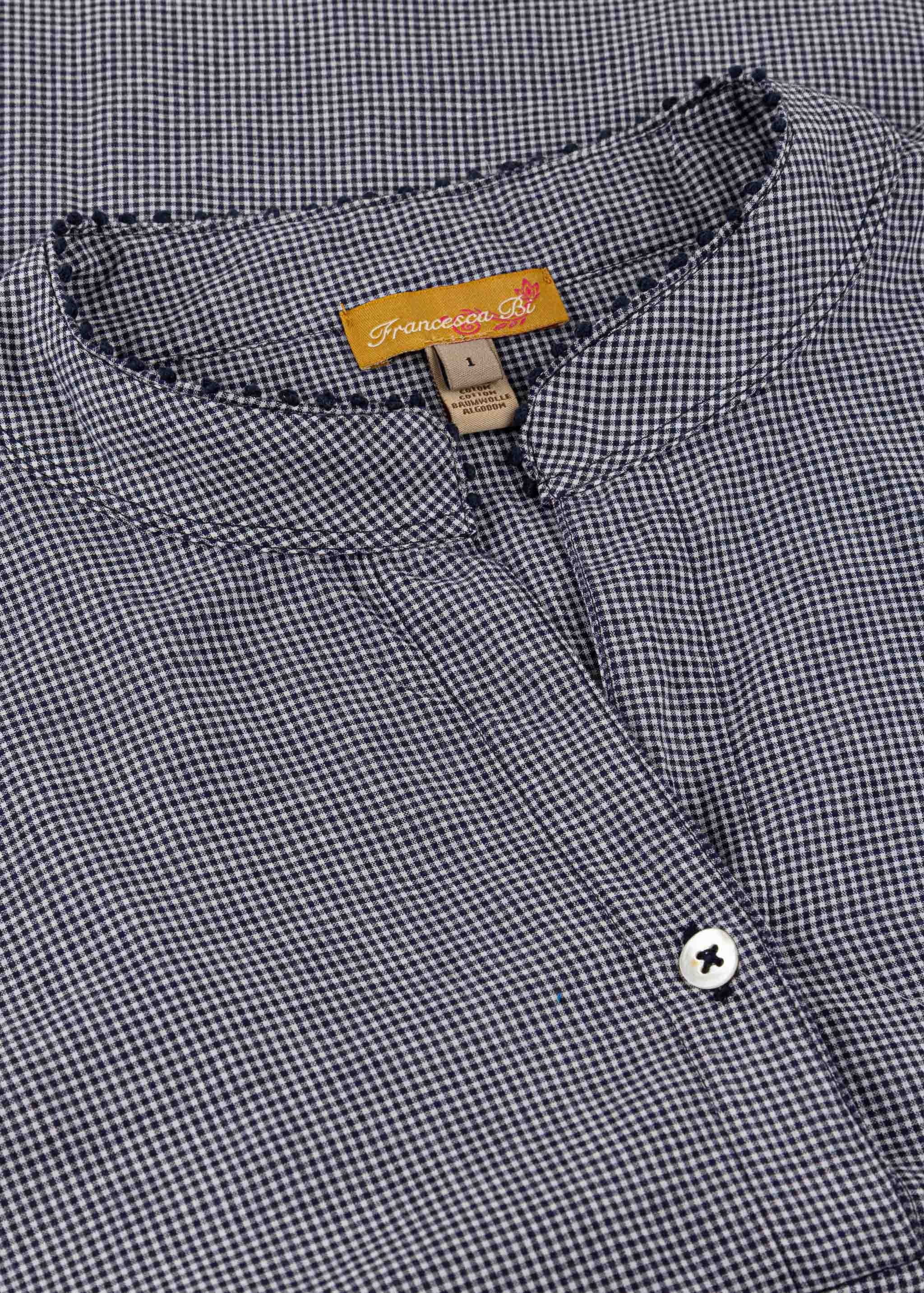 Handgefertigte Bluse von Francesca Bassi aus Baumwolle zum Schlupfen, Stehkragen mit kurzer Knopfleiste, passgenaue Schultern, verkürzte Ärmel mit Knopfmanschetten, Knötchenverzierung an Kragen und Manschetten, Vokuhila-Saum, weicher Griff.