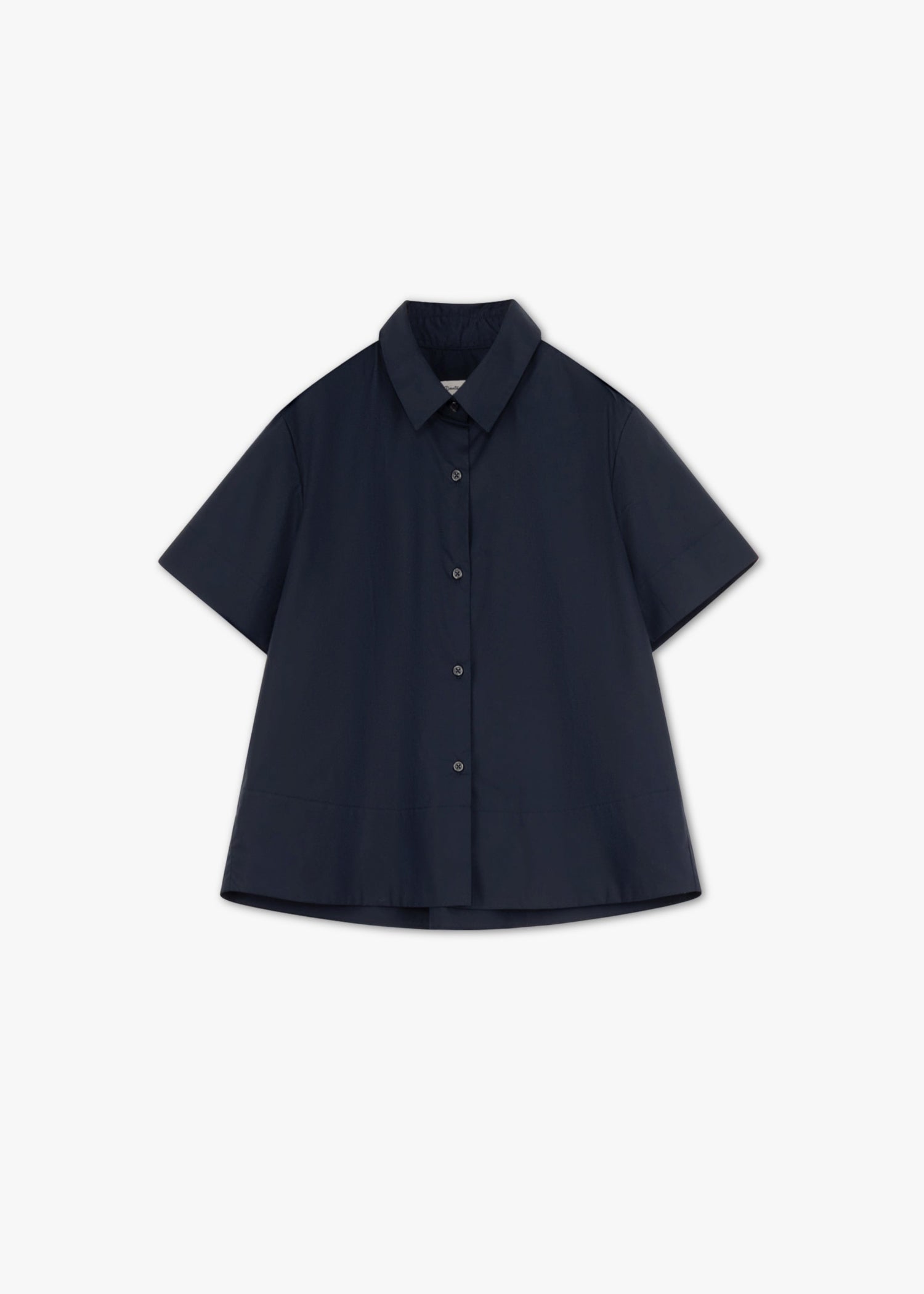 Hüftlange Bluse von Dantendorfer aus feiner Baumwolle, klassischer Kragen, durchgehende Knopfleiste, Rückenpasse mit Kellerfalte, abgerundeter Saum.