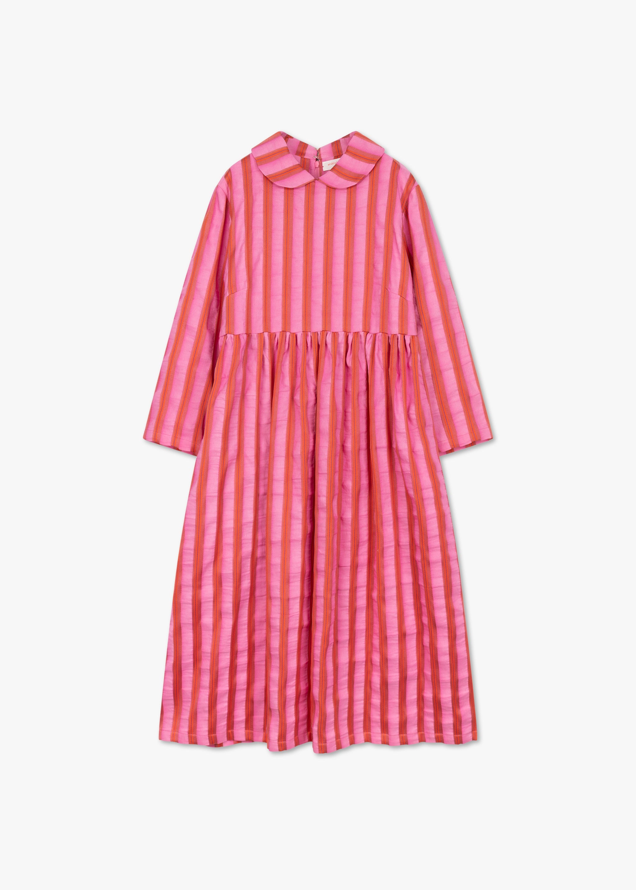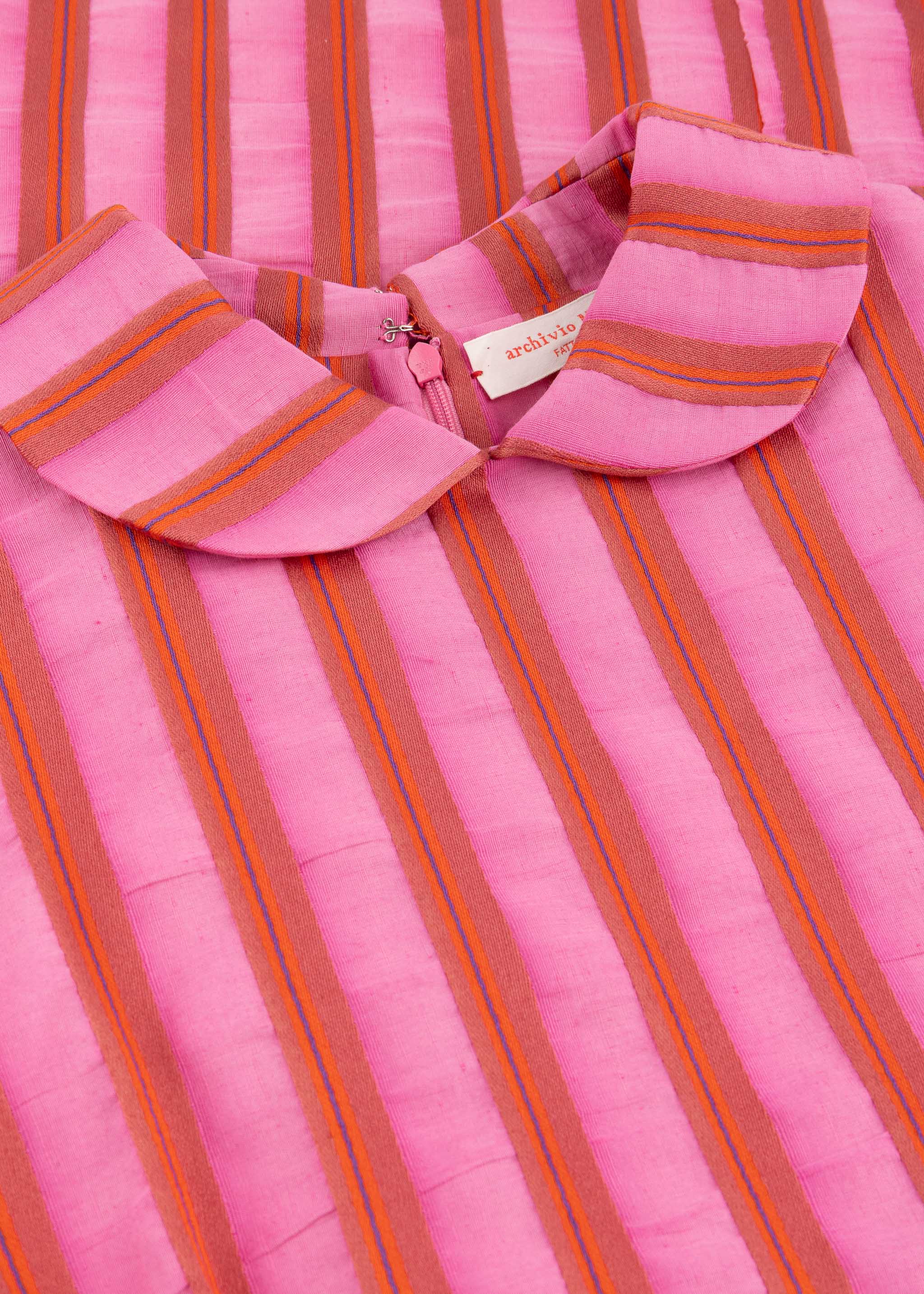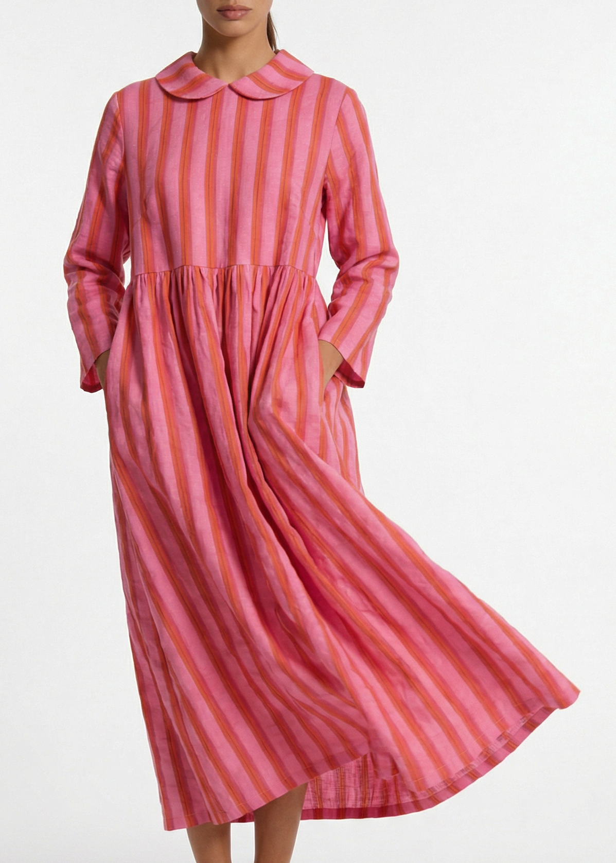 Lockeres Kleid von Archivo Miroglio aus einer Baumwoll-Leinen-Mischung, Bubikragen, Reißverschluss hinten, leicht überschnittenen Schulter, lange Ärmel, Rock mit gelegten Falten, Eingriffstaschen, gerader Saum, weicher Griff.
