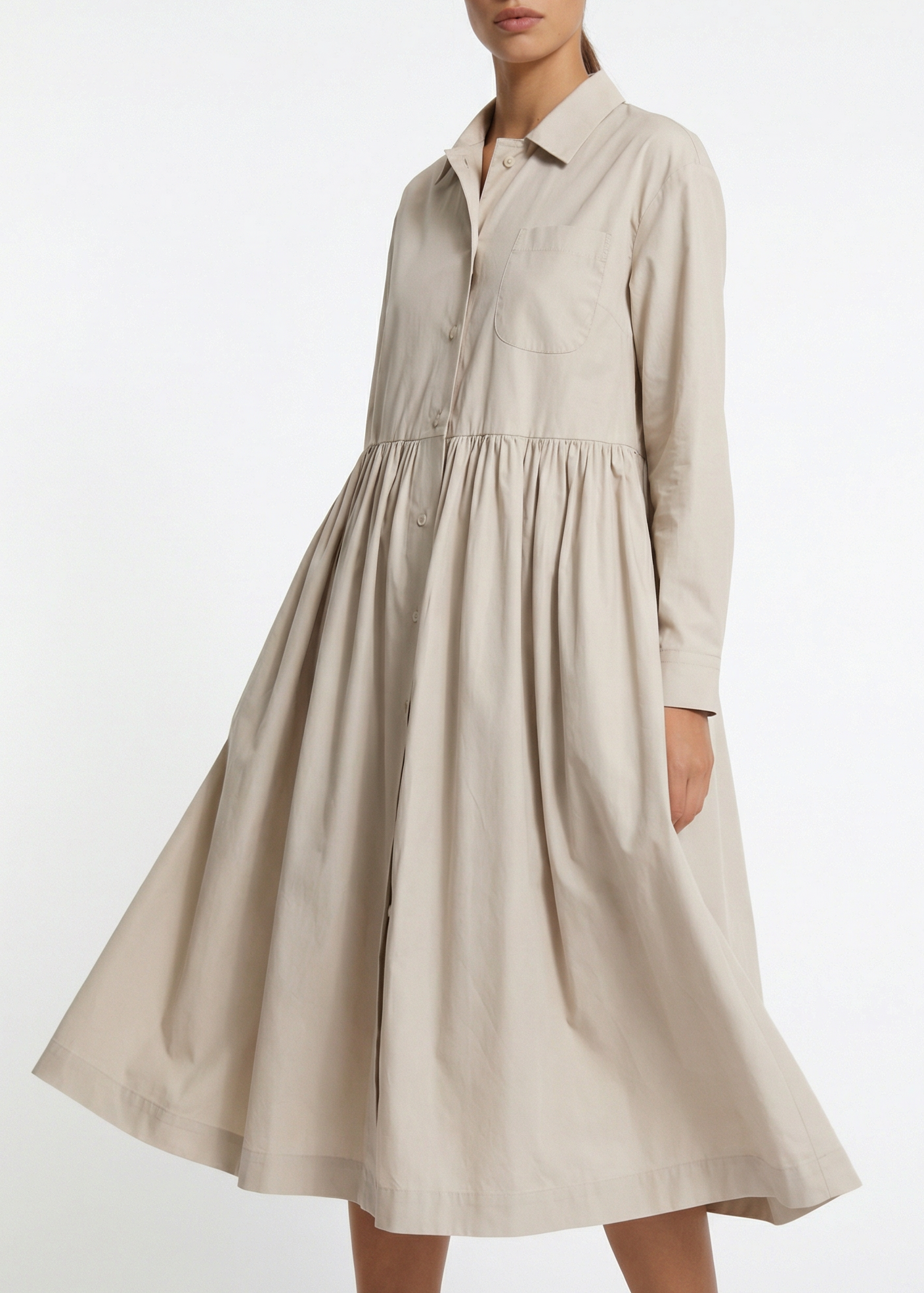 Lockeres Kleid 'Marta' von PiaLea, klassischer Kragen, leicht überschnittenen Schulter, verkürzte Ärmel mit Knopfmanschetten, durchgehende Knopfleiste, eine Brusttasche, Rock mit gelegten Falten, seitliche Eingriffstaschen, gerader Saum.