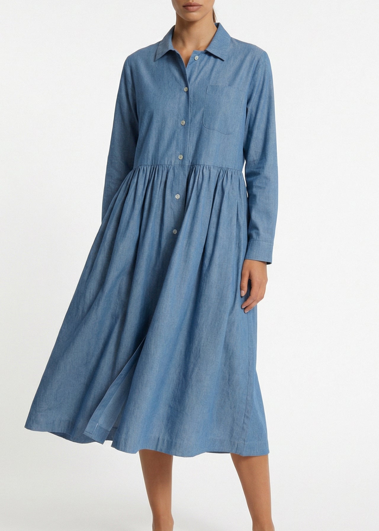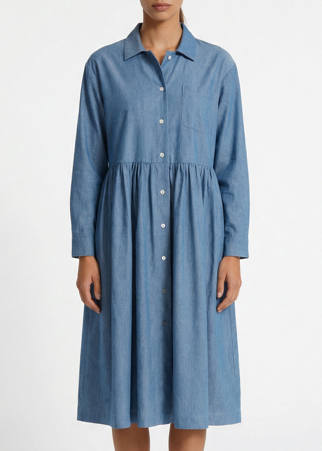 Lockeres Kleid 'Marta' von PiaLea aus feiner Baumwolle, klassischer Kragen, leicht überschnittenen Schulter, verkürzte Ärmel mit Knopfmanschetten, durchgehende Knopfleiste, eine Brusttasche, Rock mit gelegten Falten, seitliche Eingriffstaschen, gerader Saum.