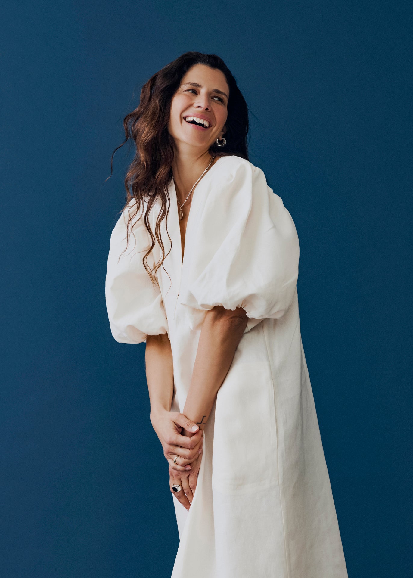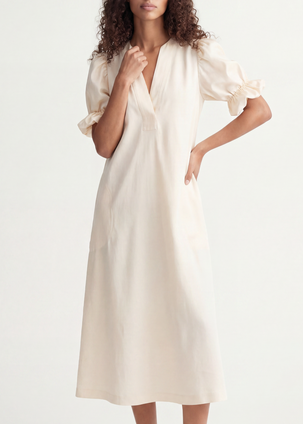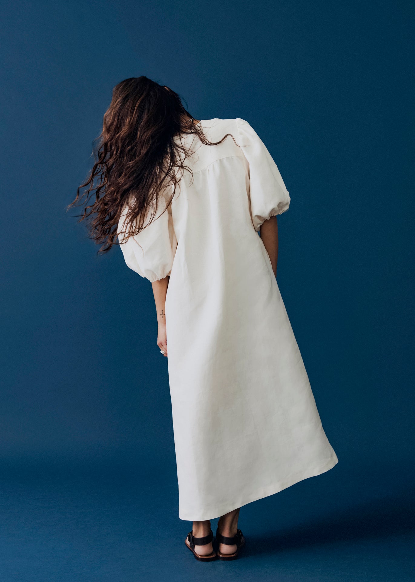 Kariertes 'Prinzessin' Dress mit Herzen von PiaLea aus Leinen, V-Ausschnitt, kurze Puffärmel mit Gummizug, Rückenpasse mit gelegten Falten, seitliche Eingriffstaschen, gerader Saum.