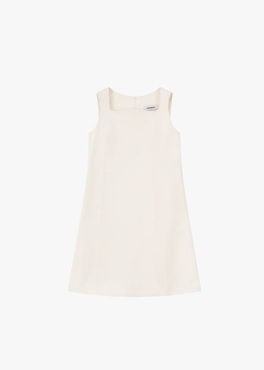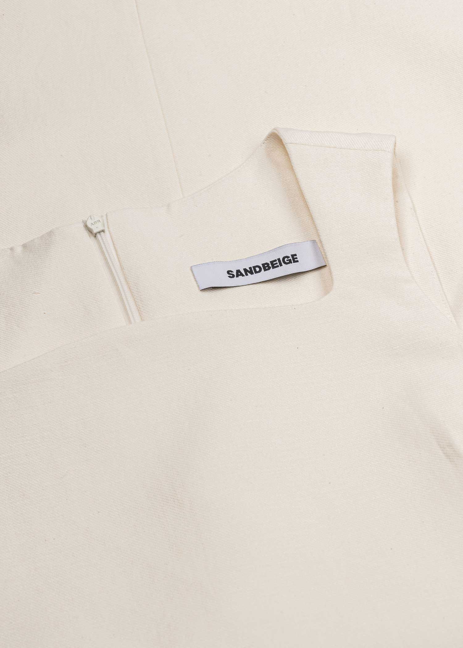 Mini-Kleid 'Pisa' von Sandbeige, kantiger Ausschnitt, kurzärmelig, verdeckter Reißverschluss in Rückenmitte, gefütterte Verarbeitung, gerader Saum.