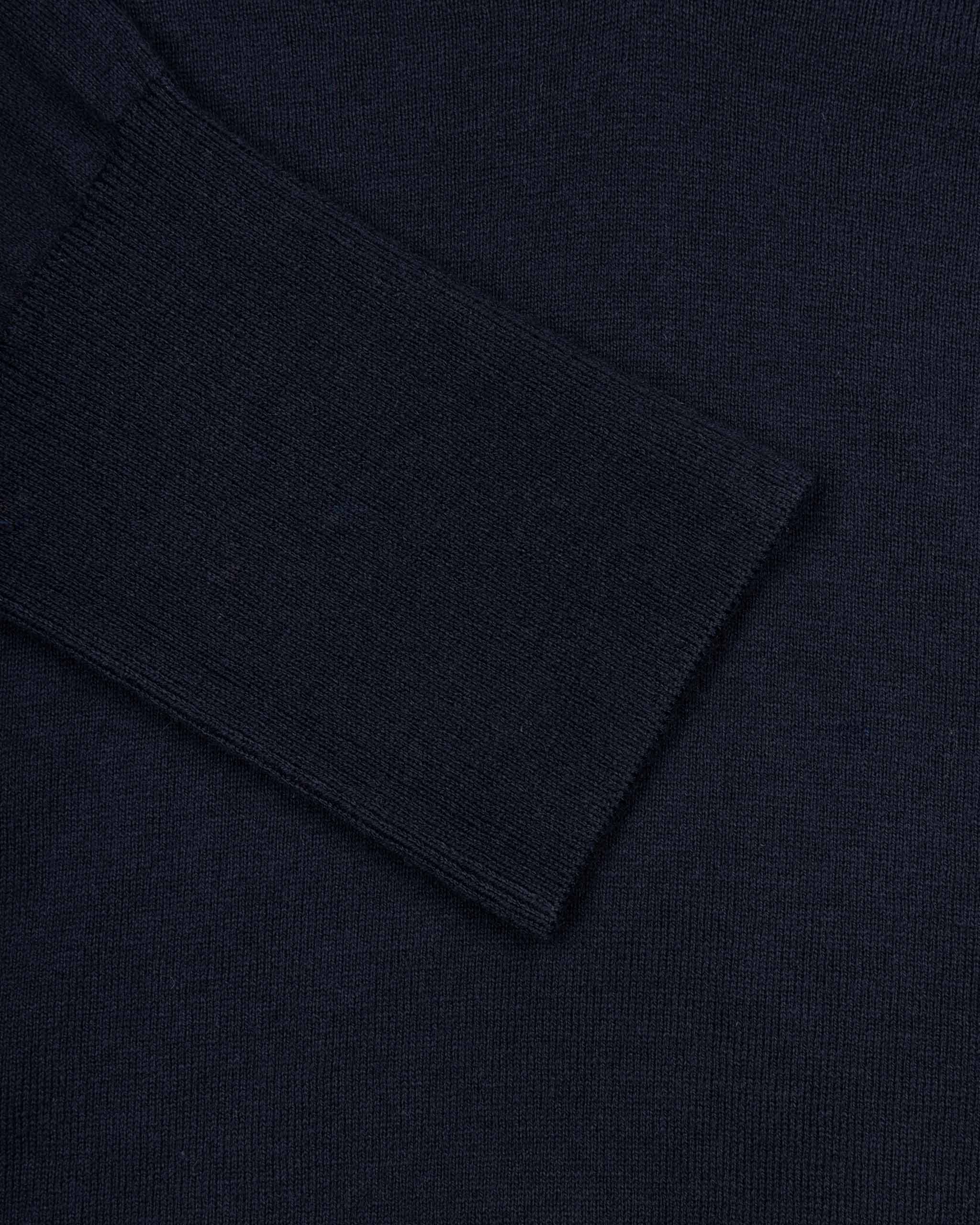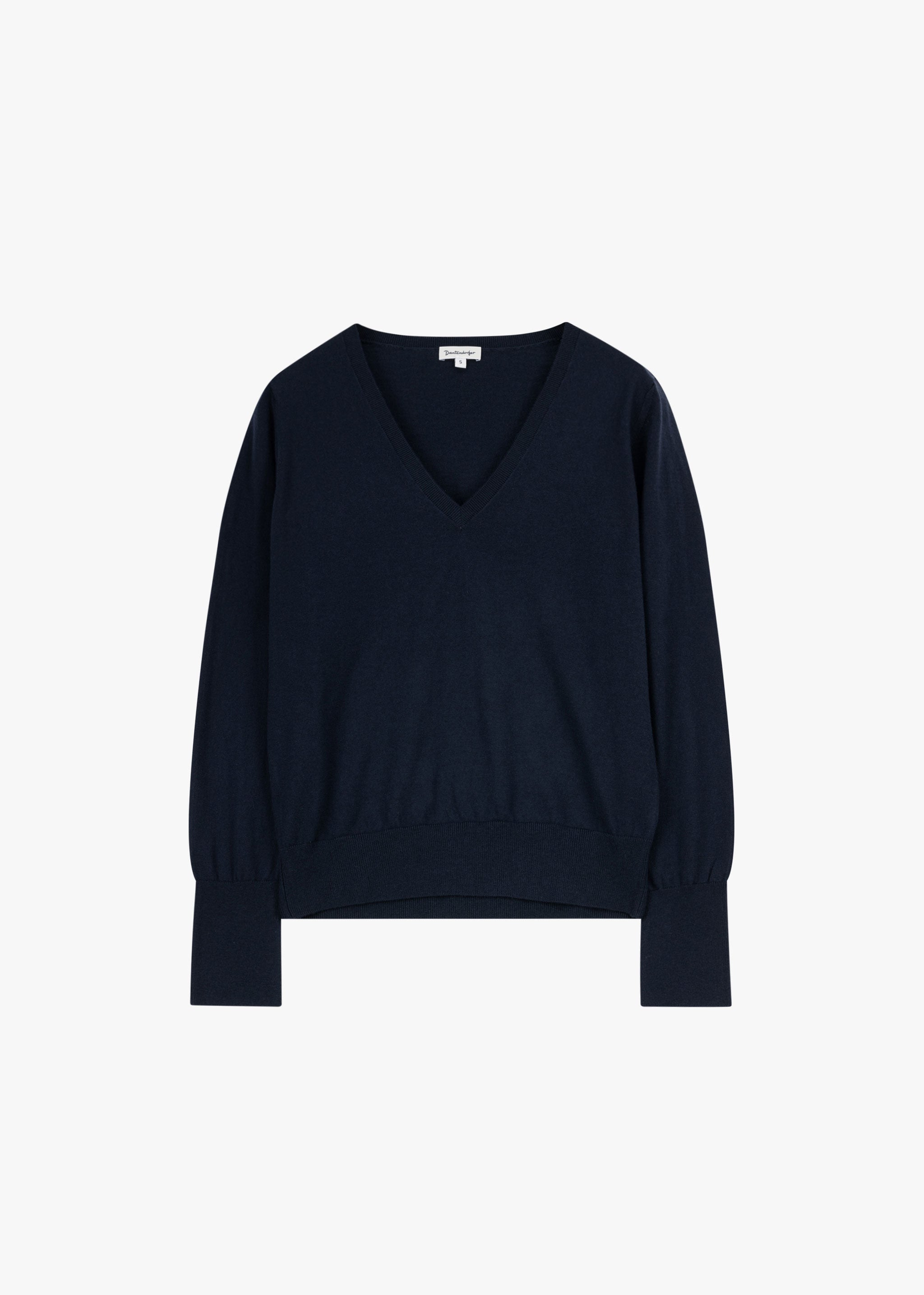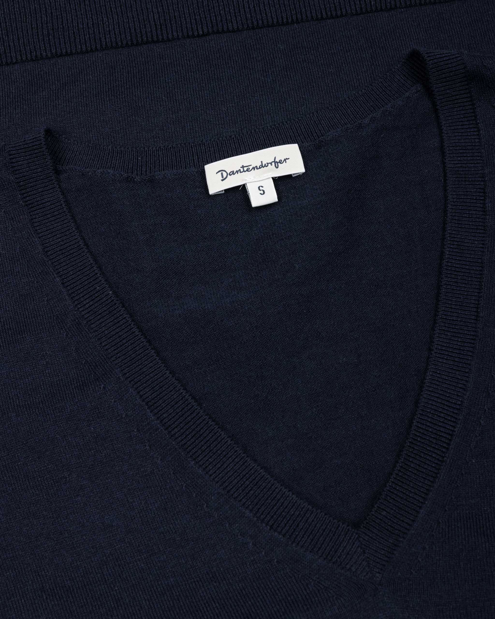 Dunkelblauer Pullover von Dantendorfer aus einer Baumwollkaschmir-Mischung, gerippter Kragen, Bündchen und Saum, V-Ausschnitt, lange Ärmel und ein gerader Schnitt.