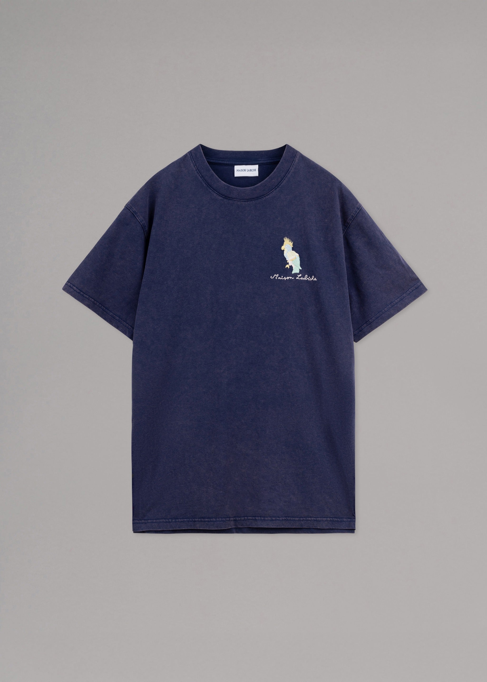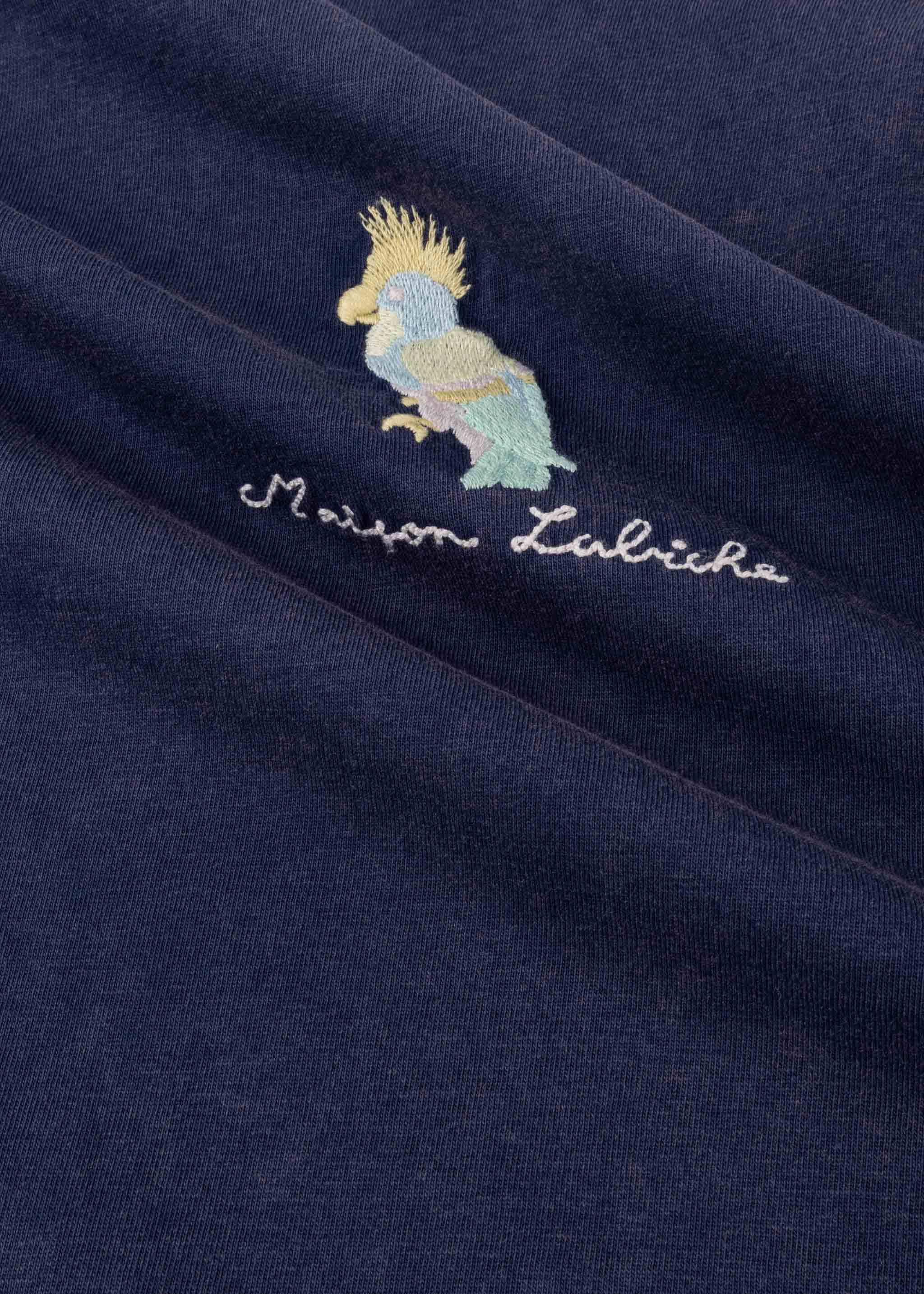 T-Shirt 'Popincourt' von Maison Labiche, gerippter Rundhalsausschnitt, 'Papagei' Stickerei, gerader Saum, used-Effekt.