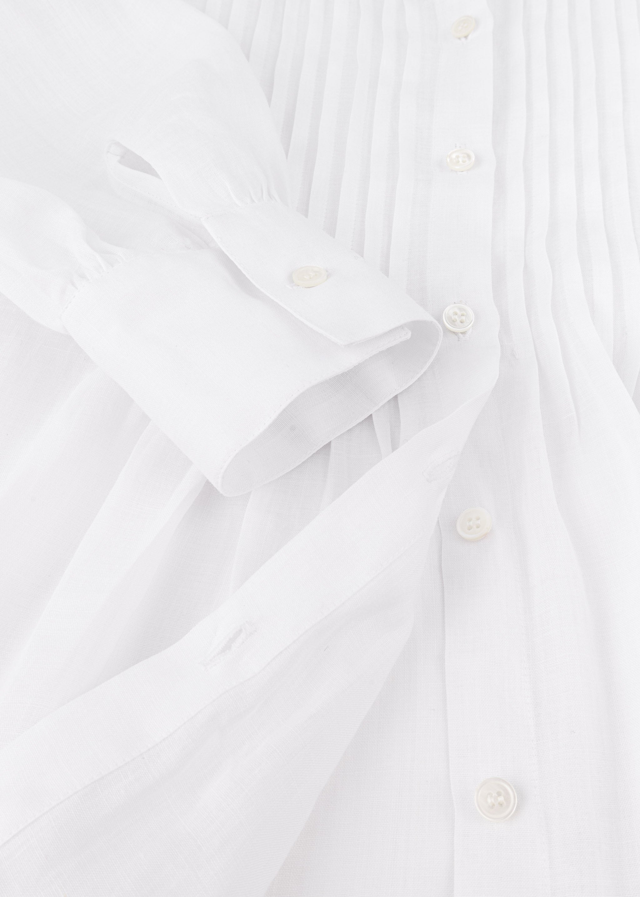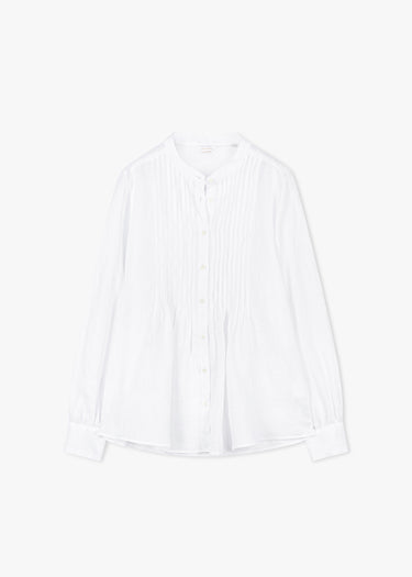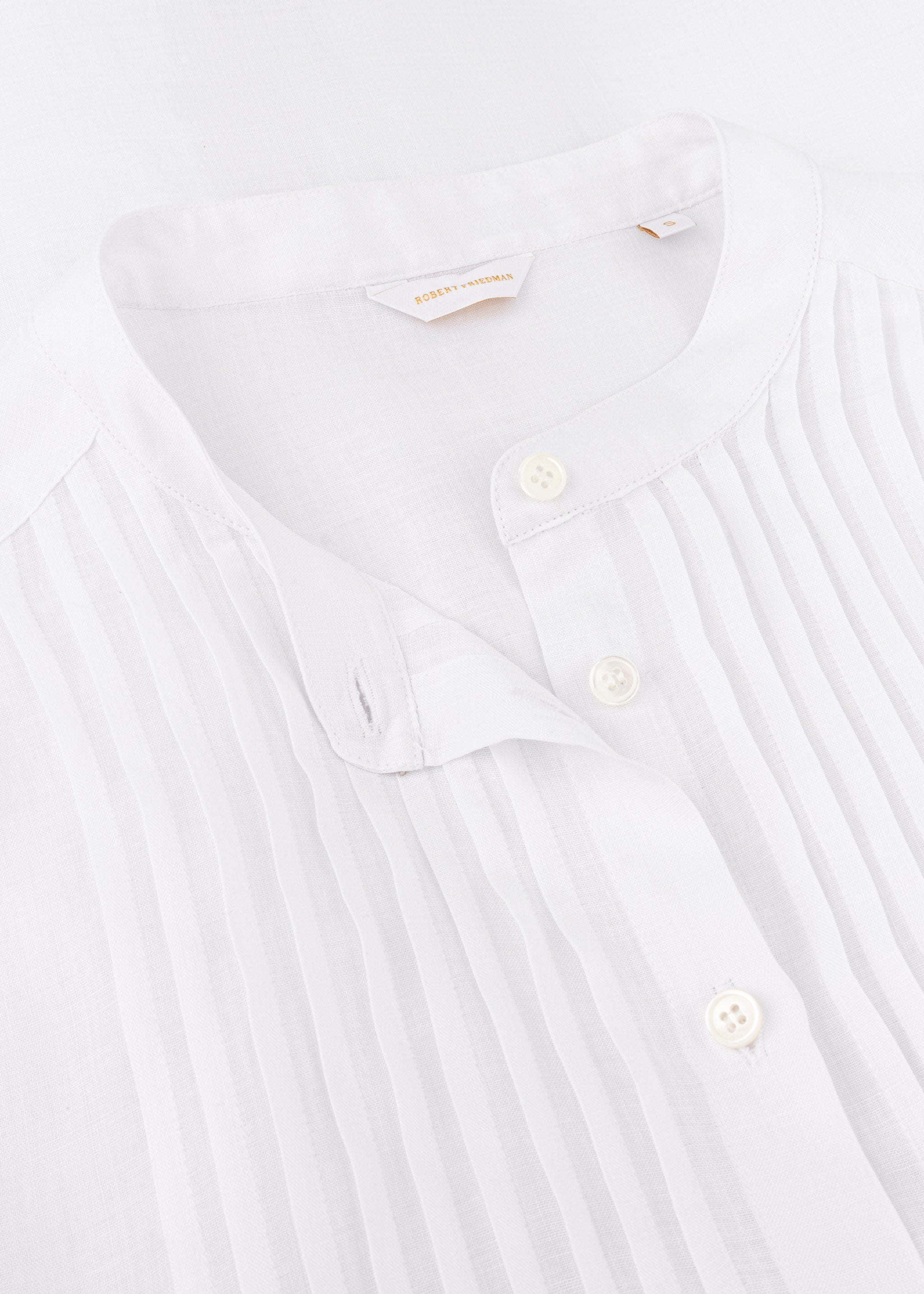Bluse 'Mirta' von Robert Friedman aus feinem Ramie, Stehkragen, Knopfleiste, passgenaue Schultern, lange Ärmel mit Knopfmanschetten, fein gelegte Falten, leichte A-Linie, abgerundeter Saum, leicht transparent, weicher Griff.