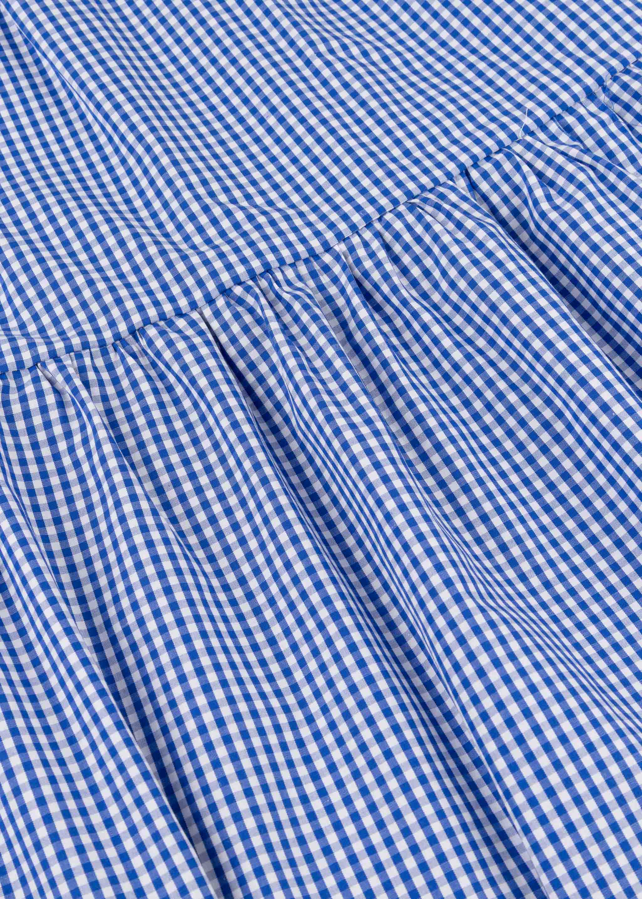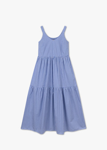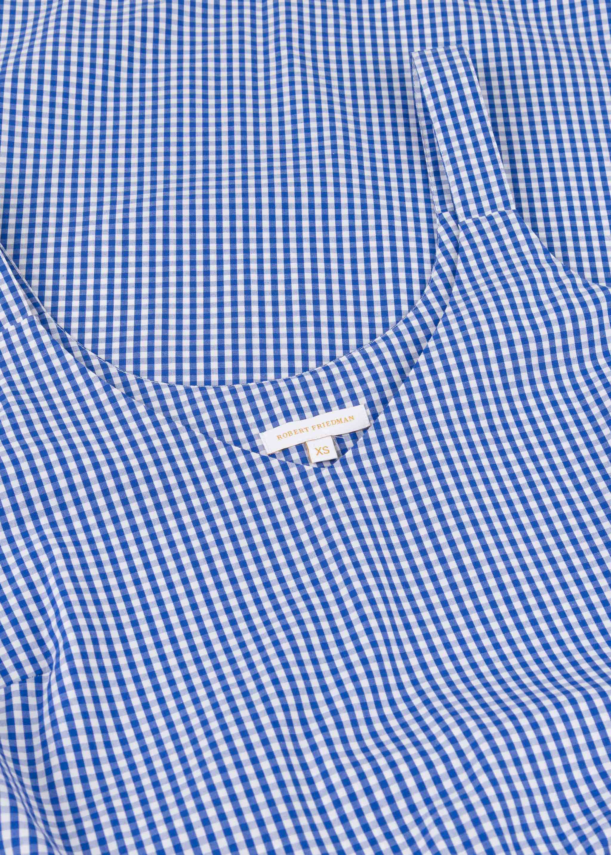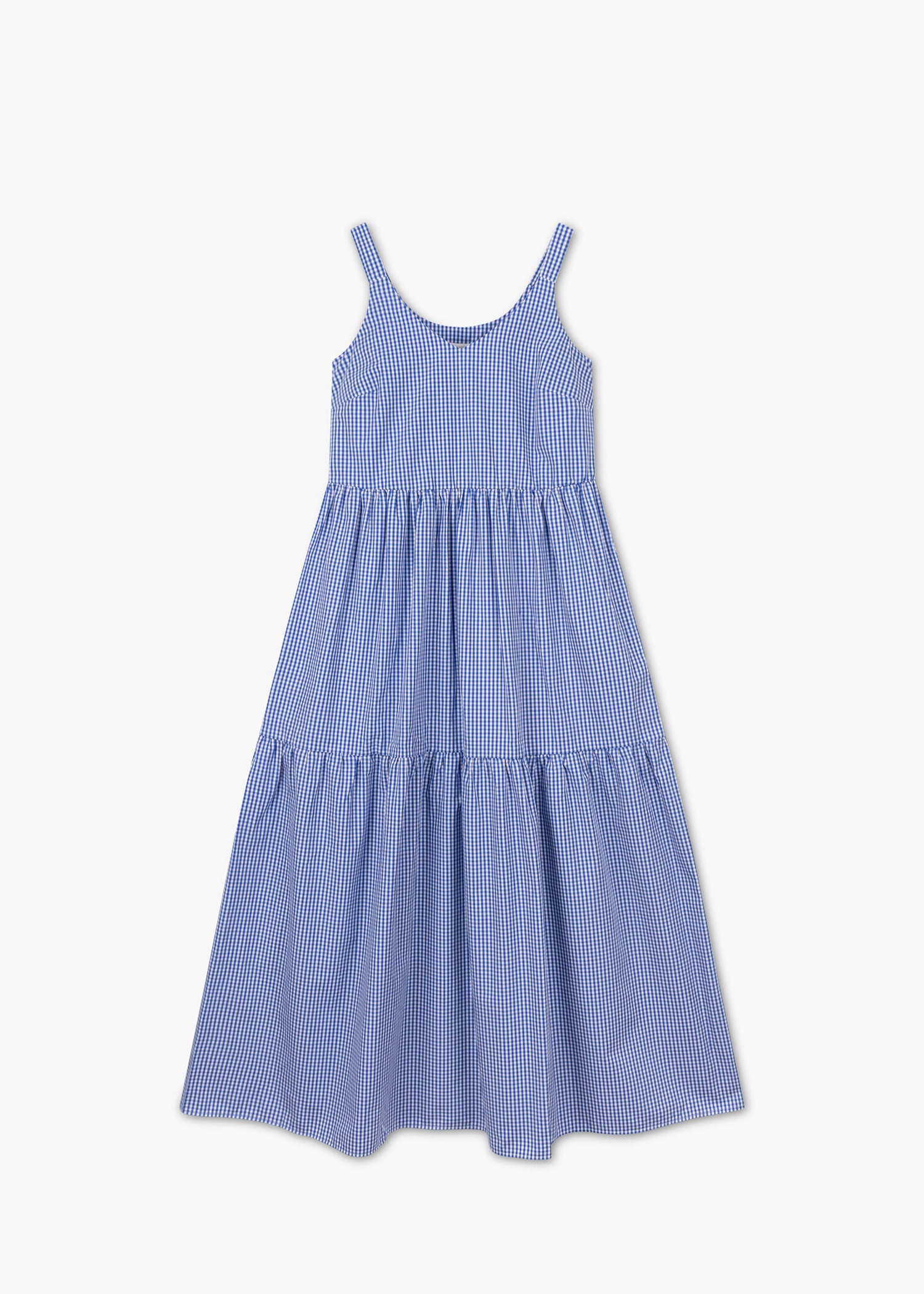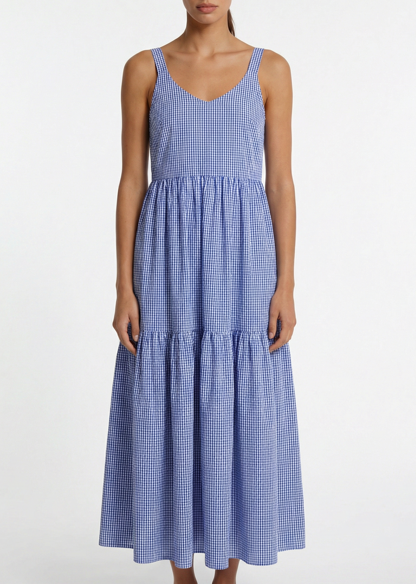 Ärmelloses Vichy-Karo Maxi-Kleid 'Amira' von Robert Friedman aus feiner Baumwolle, V-Ausschnitt, schmaler Brustbereich, Abnäher auf Brusthöhe, Stufen im Rockteil, seitliche Eingriffstaschen, A-Linie, gerader Saum, weicher Griff.