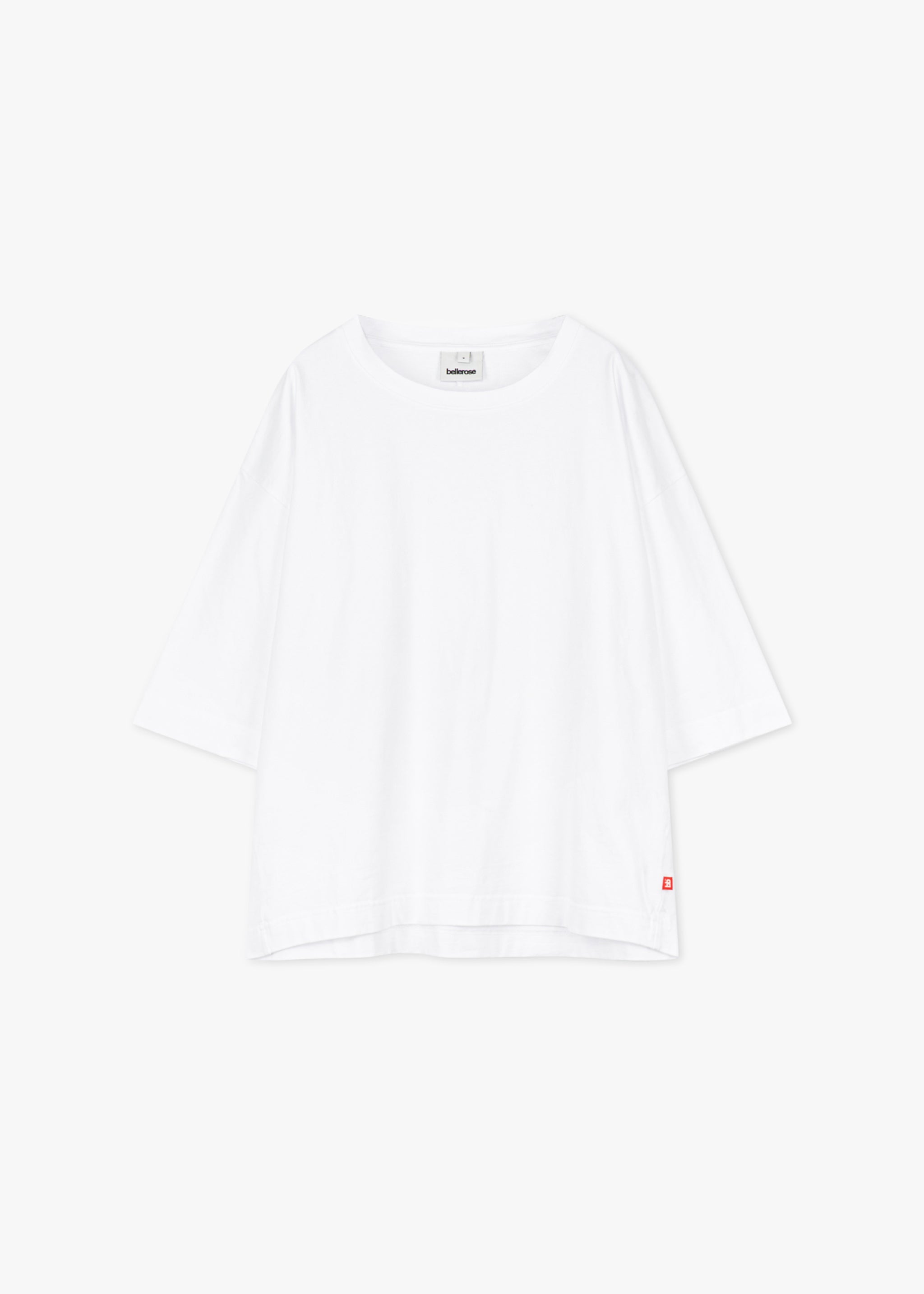 Relaxed-Fit T-Shirt 'Fiore' von Bellerose aus mittelschwerer Baumwolle, gerippter Rundhalsausschnitt, Rückenpasse, überschnittene Schultern, Logo-Badge, gerader Saum, weicher Griff.