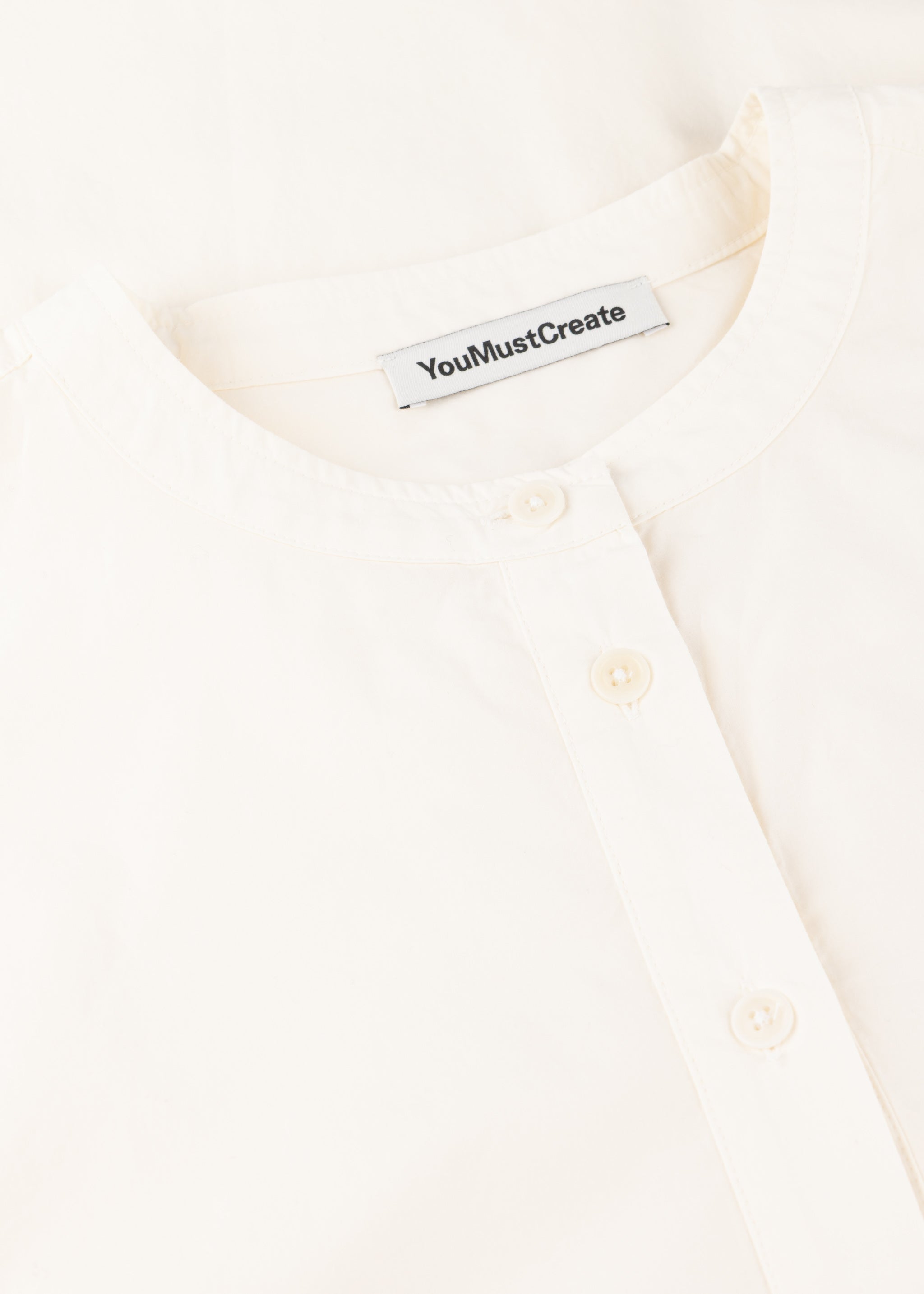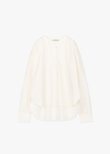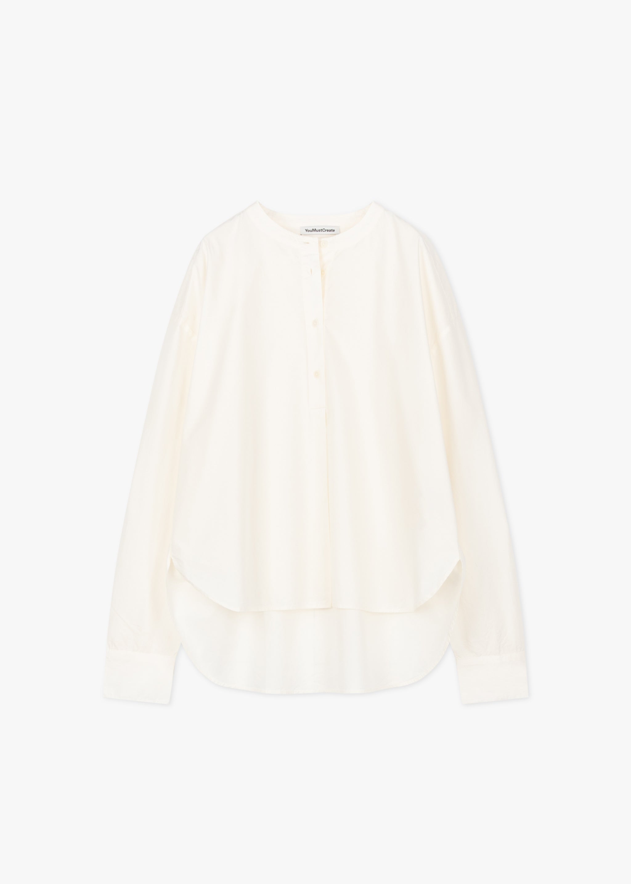 Lockere Bluse von YMC zum Schlupfen aus feiner Baumwolle, Rundhalsausschnitt, kurze Knopfleiste mit gelegter Falte, Rückenpasse mit Quetschfalte, überschnittene Schultern, lange Ärmel mit Knopfmanschetten, Vokuhila-Saum, leicht transparent, weicher Griff.