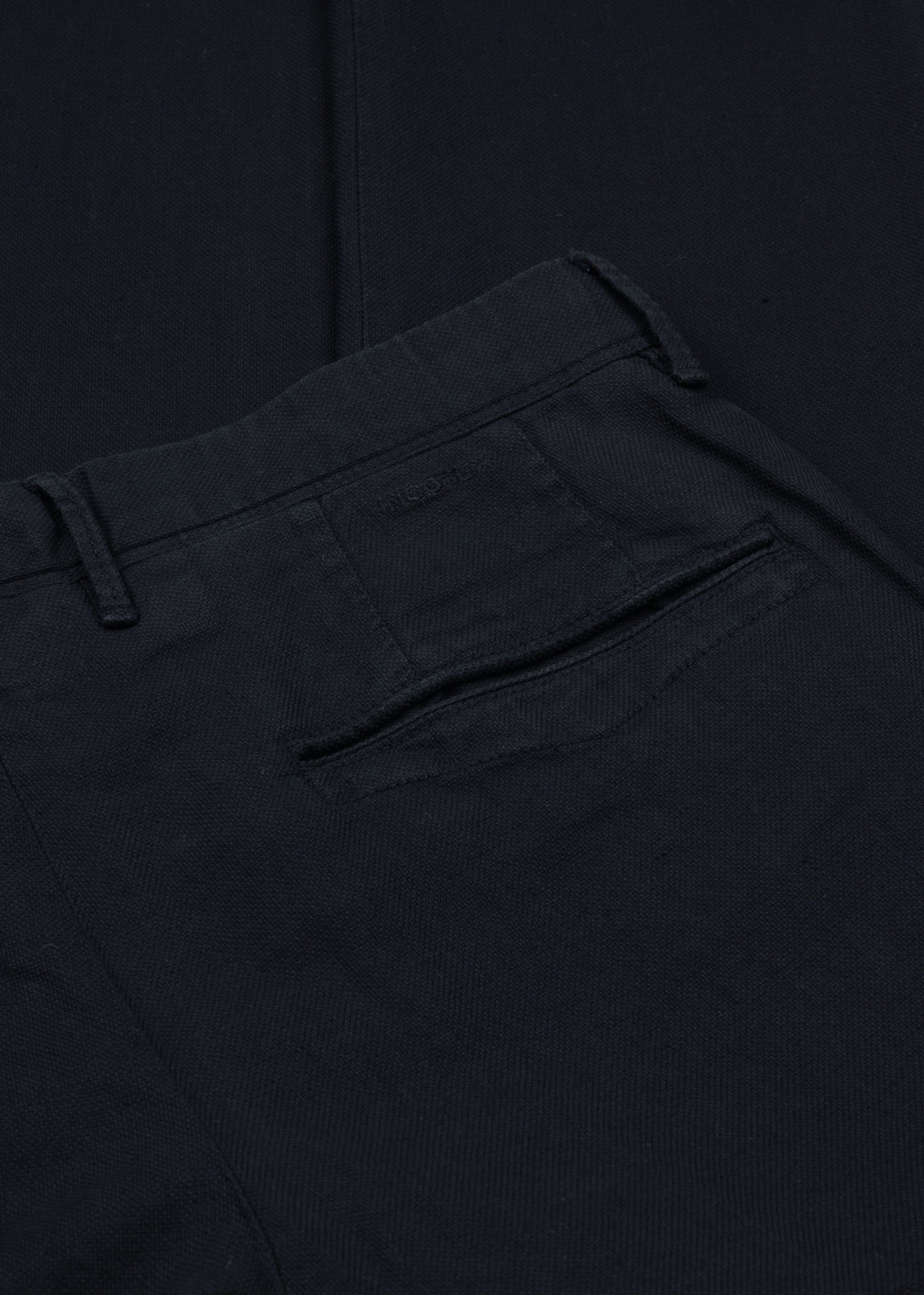 Structured trousers by Incotex, basket weave, belt loops, button and zip fly, creases, side pockets, and welt back pockets.