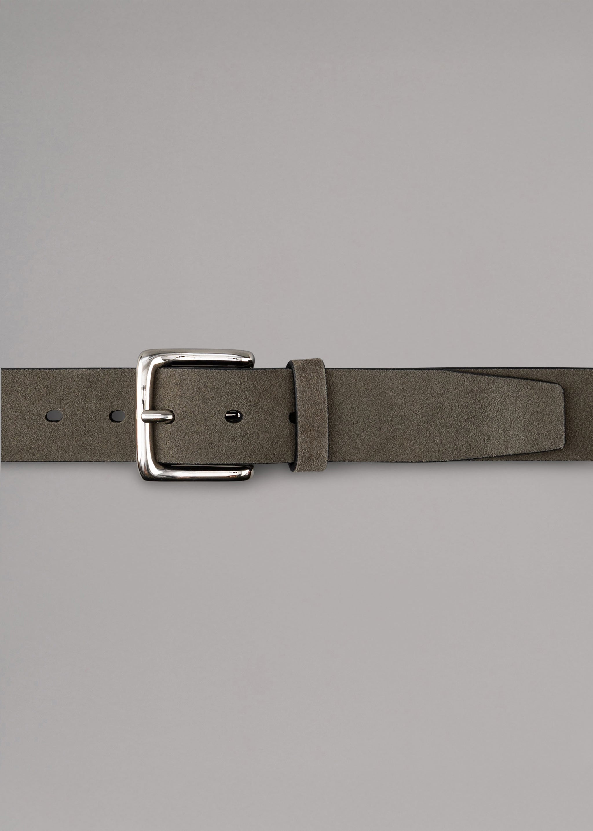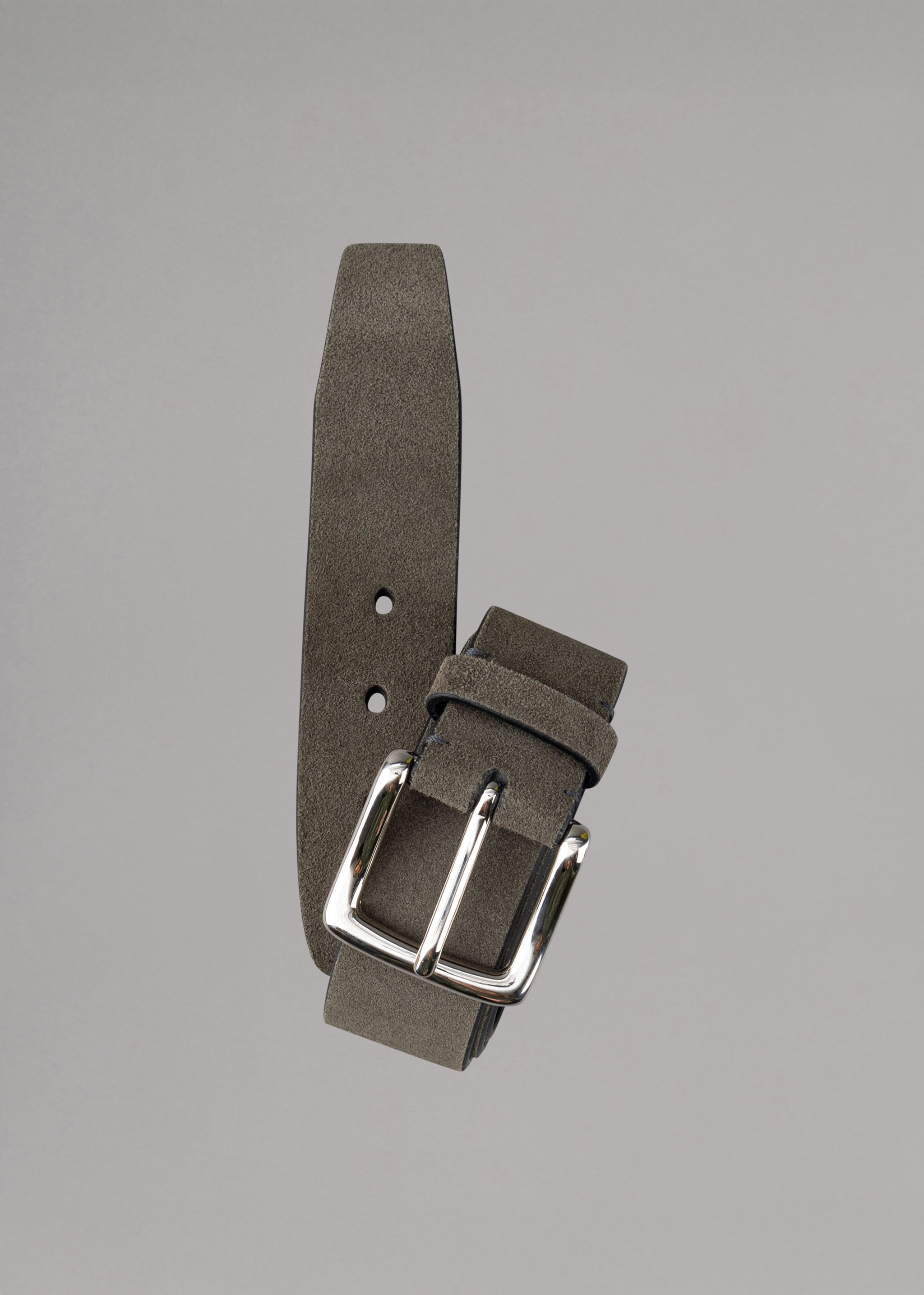 Suede belt by Slowear, silver buckle, smooth leather back.