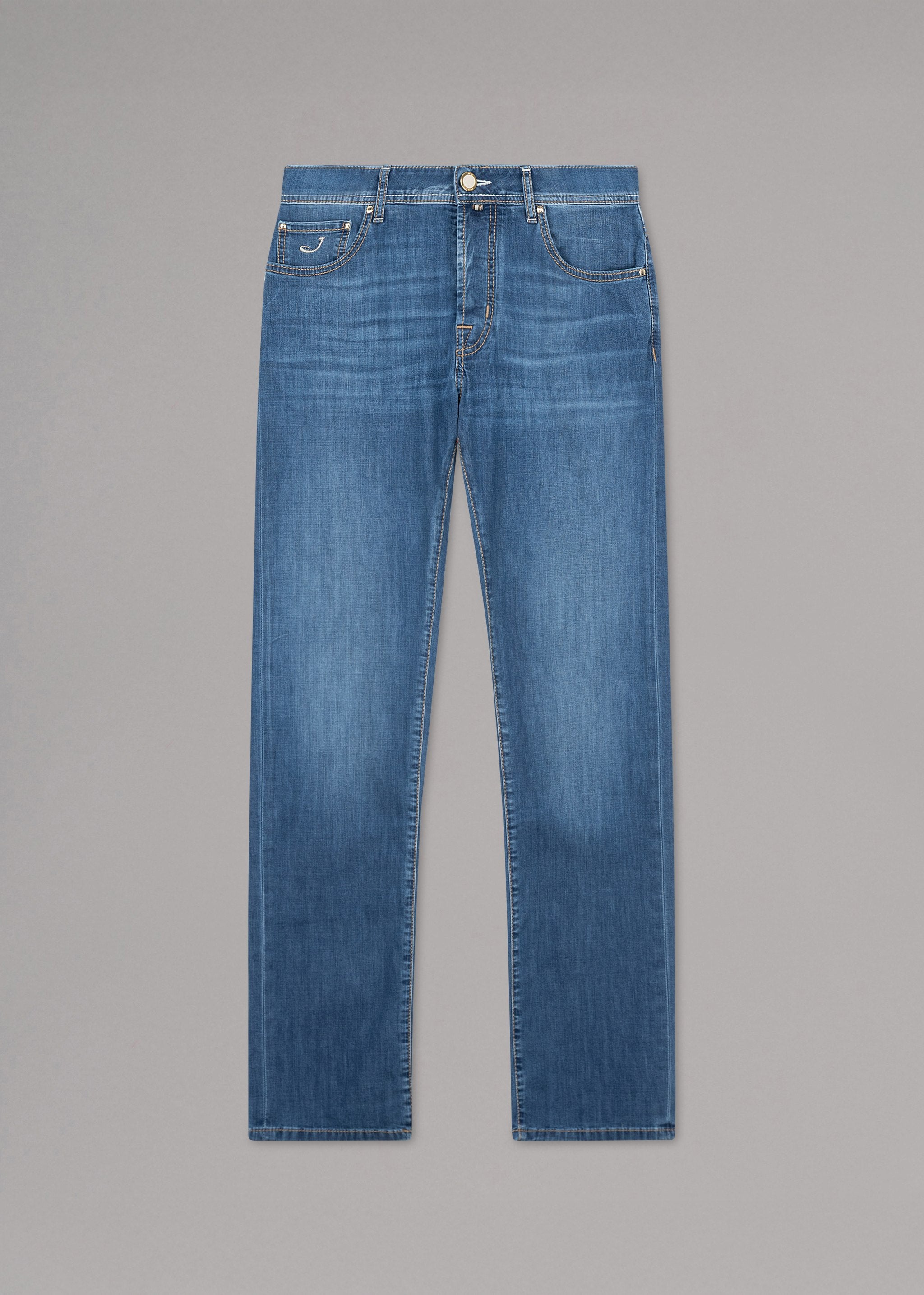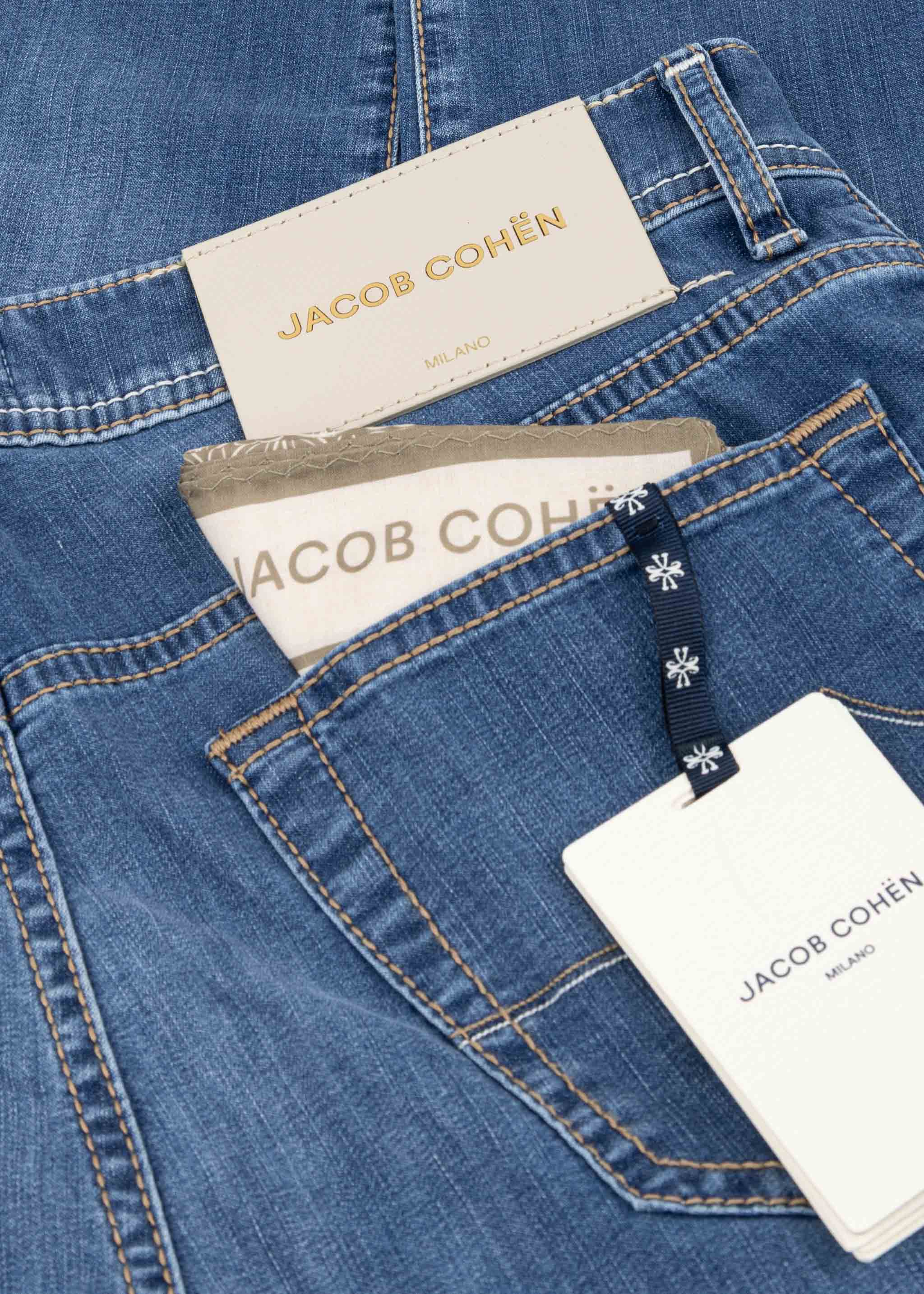Lightweight stretch jeans 'Bard' by Jacob Cohën, belt loops, button closure, 5-pocket style, logo patch, contrast stitching, includes bandana and spool of yarn, perfumed with the signature scent of Jacob Cohën.