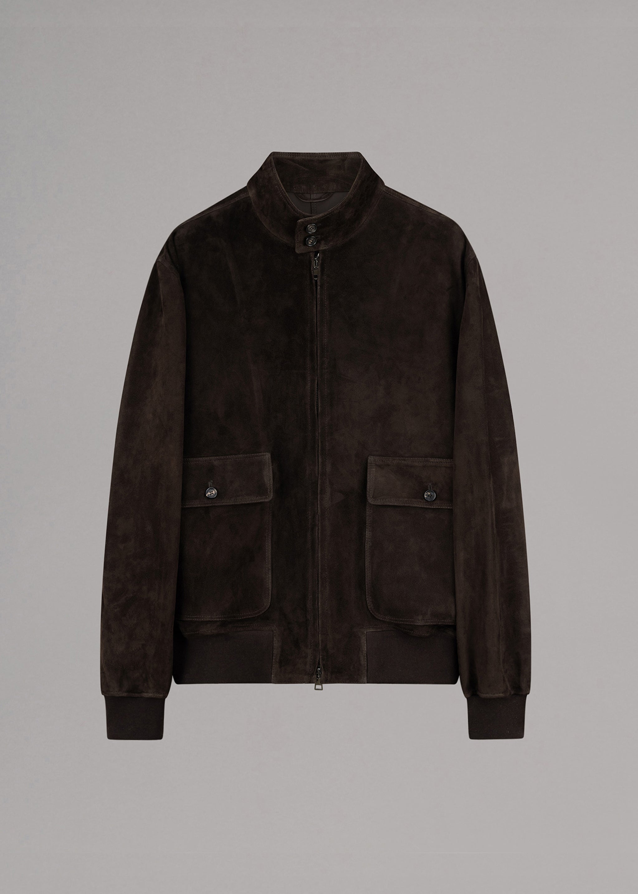 Dark brown suede jacket by Rifugio, funnel neck, two front buttoned flap pockets, two-way zip fastening, ribbed trims, unlined.