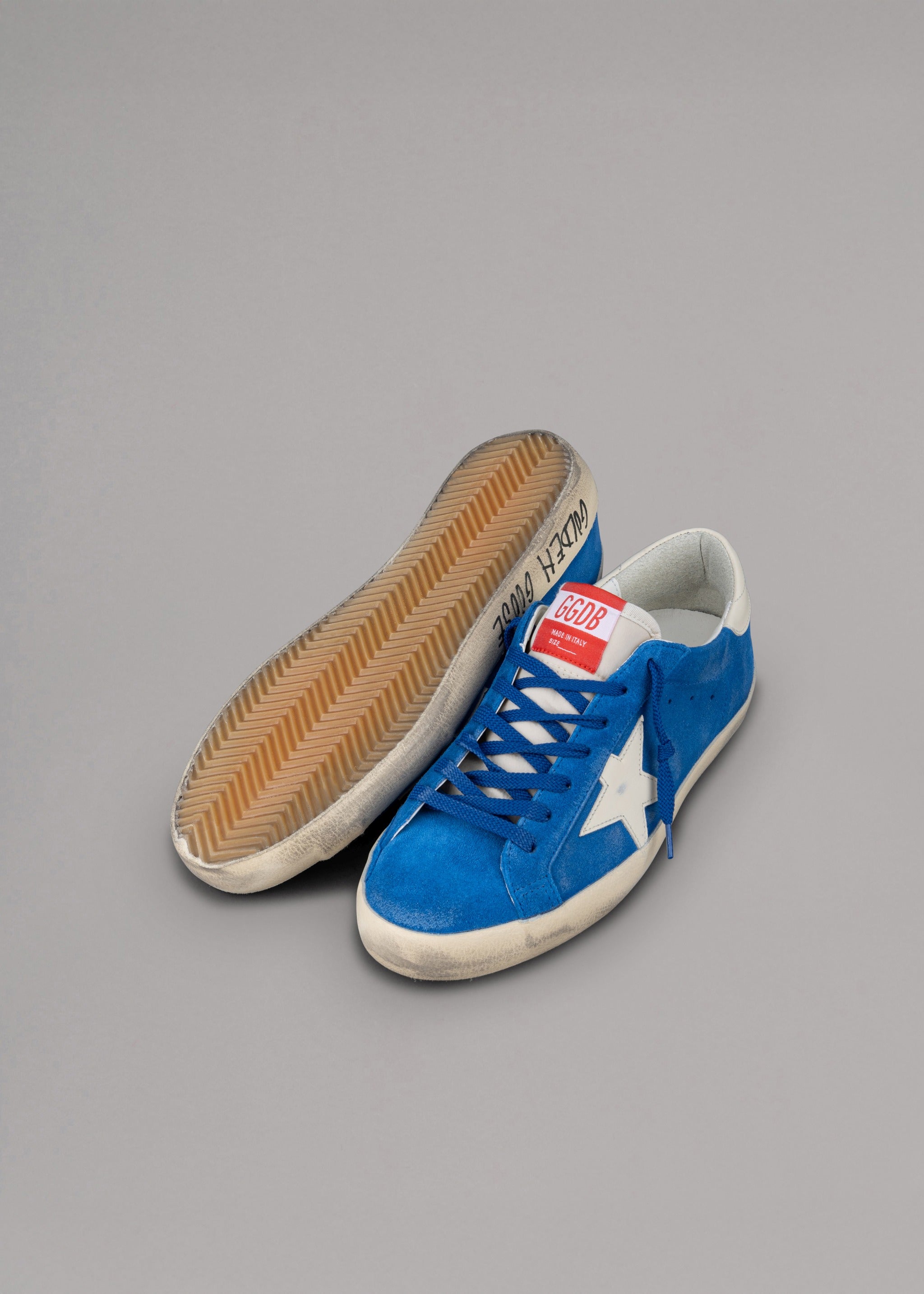 'Super-Star' sneakers by Golden Goose in suede, 'Golden Goose' lettering, vintage treatment.