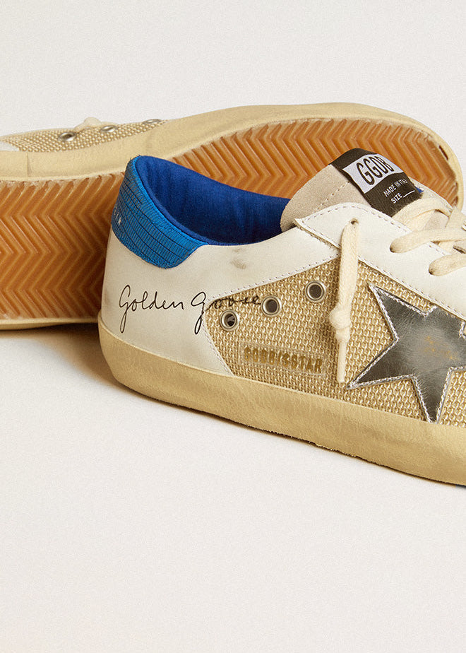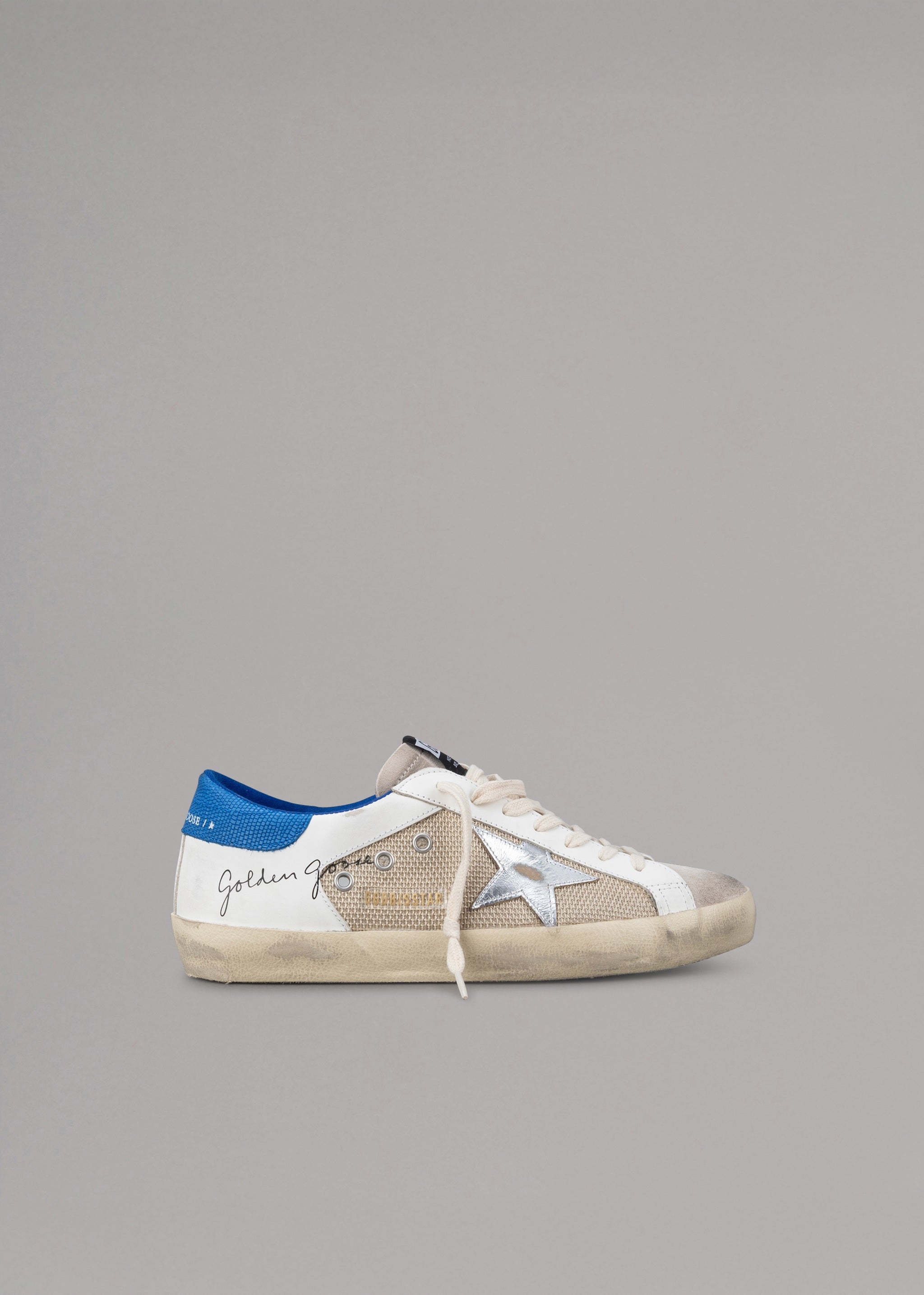 Golden Goose 'Super-Star' sneakers in smooth leather and canvas, blue heel counter, lettering, vintage treatment.