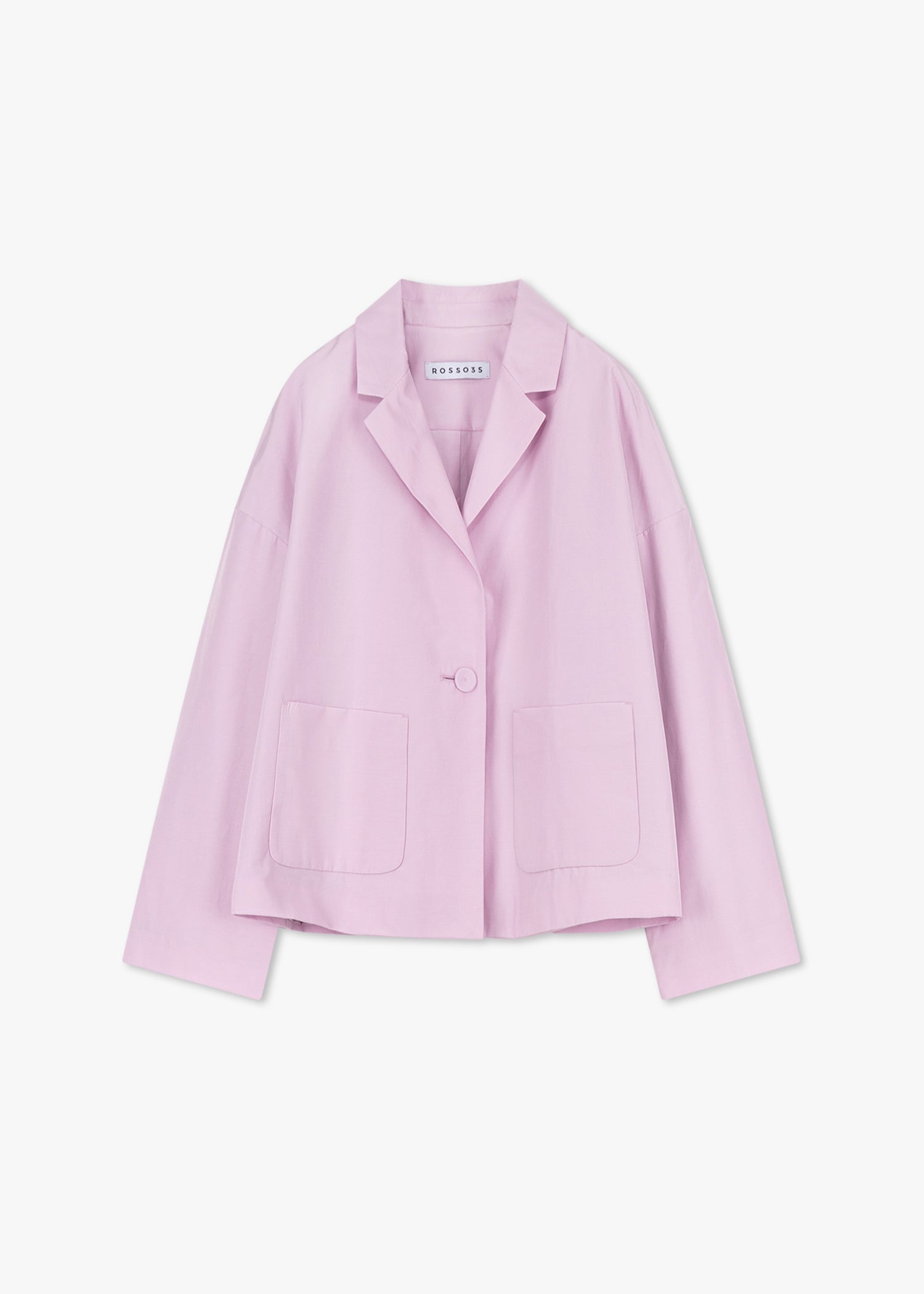 Short blazer from Rosso 35 in shimmering taffeta, with a falling lapel, dropped shoulders, shortened sleeves, two patch pockets, straight hem, and lined finish.