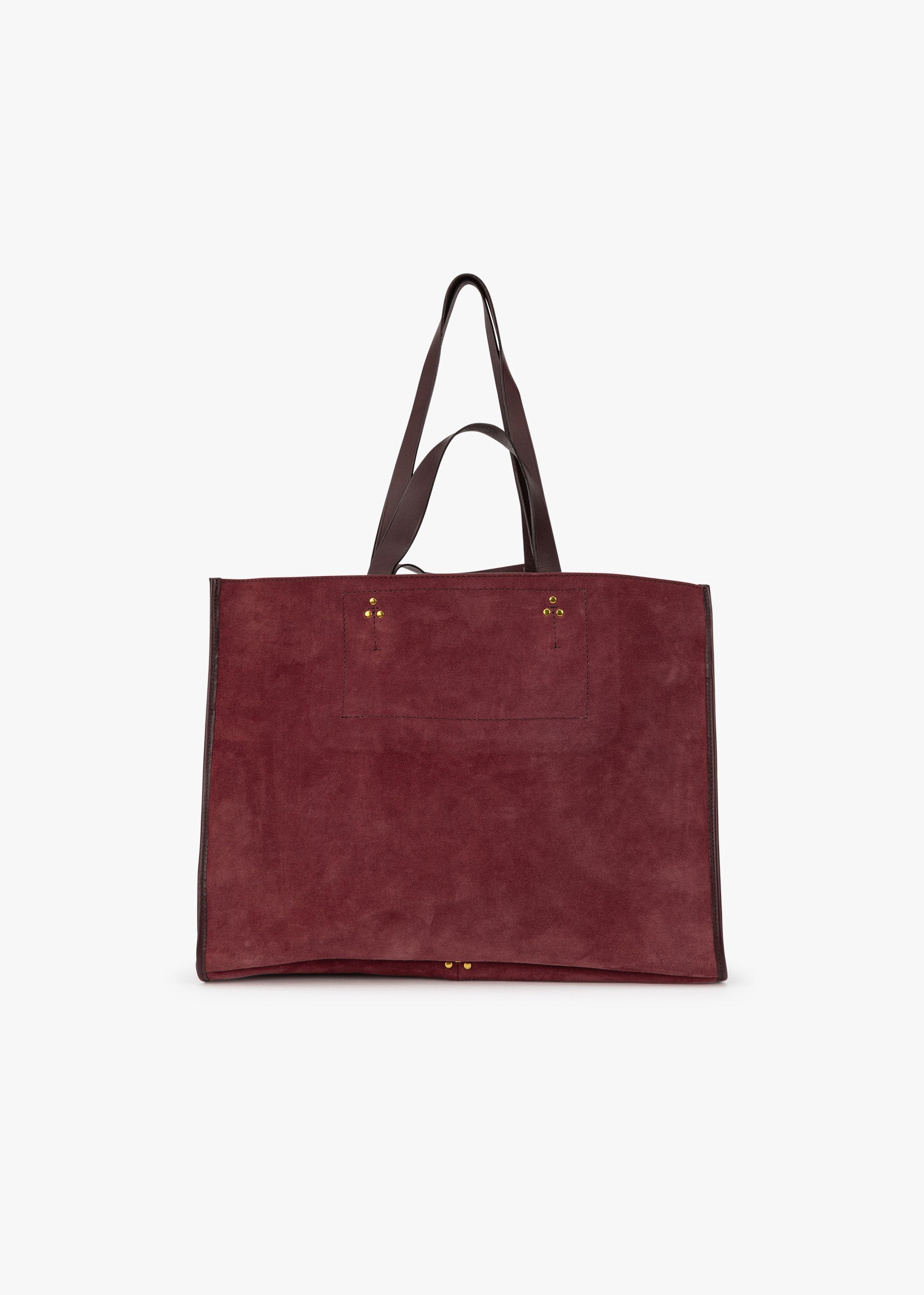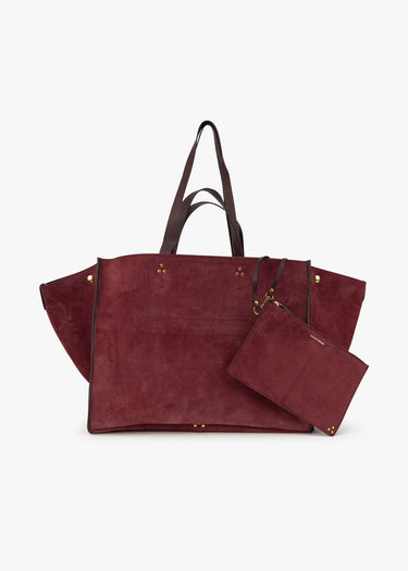 Large suede bag by Jerome Dreyfuss, two short handles, two long shoulder straps, removable pochette, closes with a snap fastener on a small leather strap.