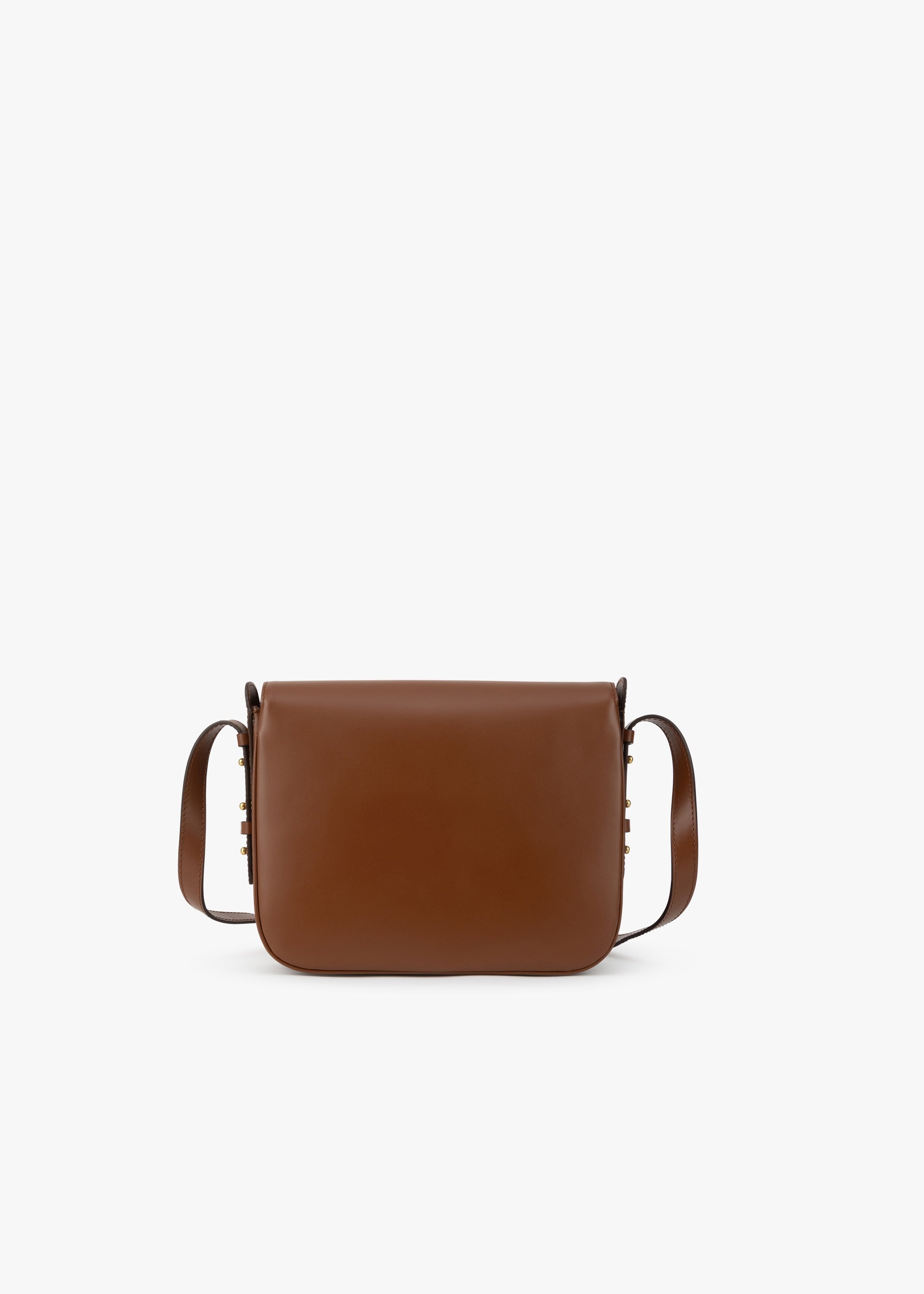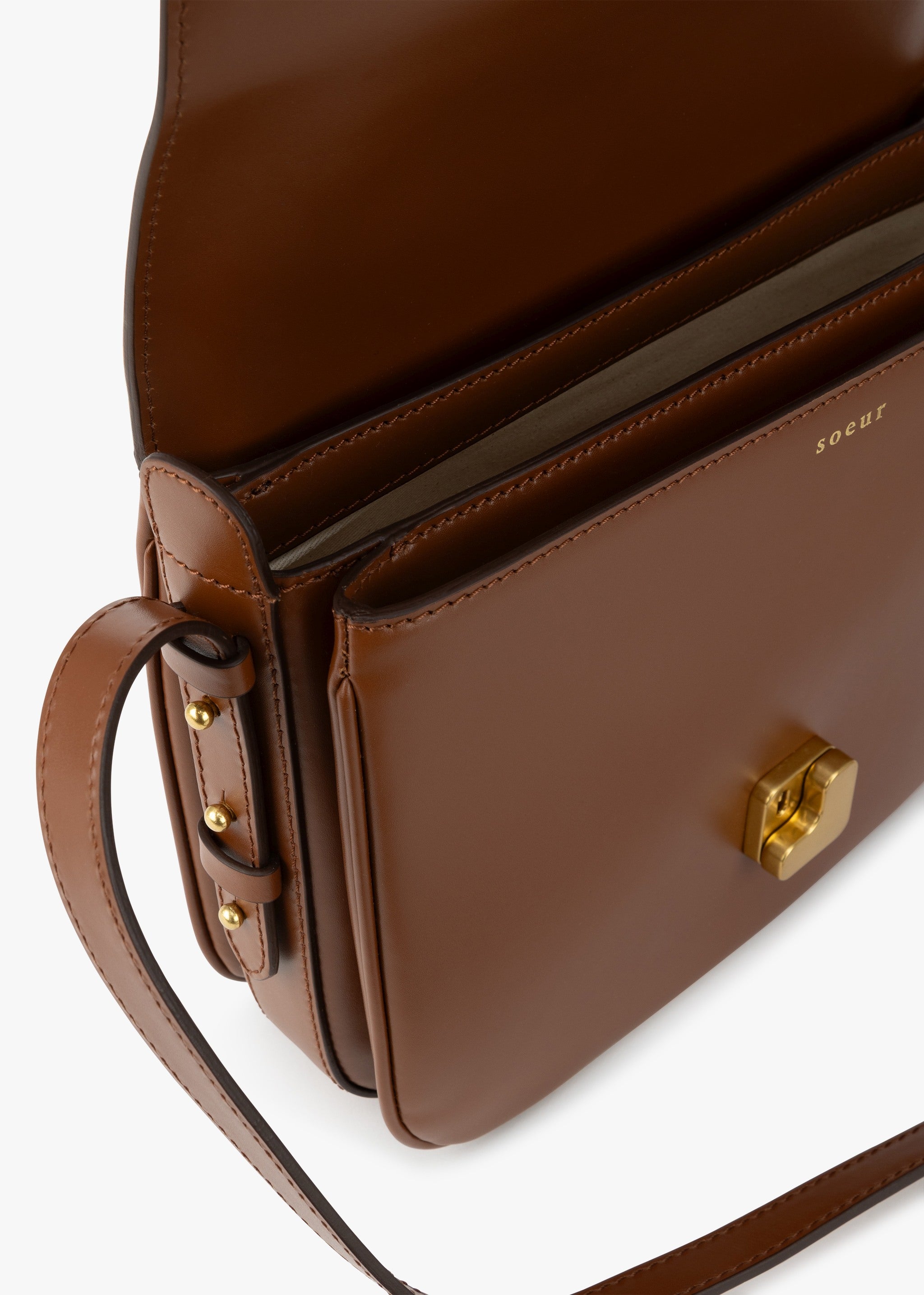 Shoulder bag by Soeur with adjustable leather strap, one zipped compartment, three interior pockets, cotton lining, front flap with gold monogram closure, gold metal fittings.