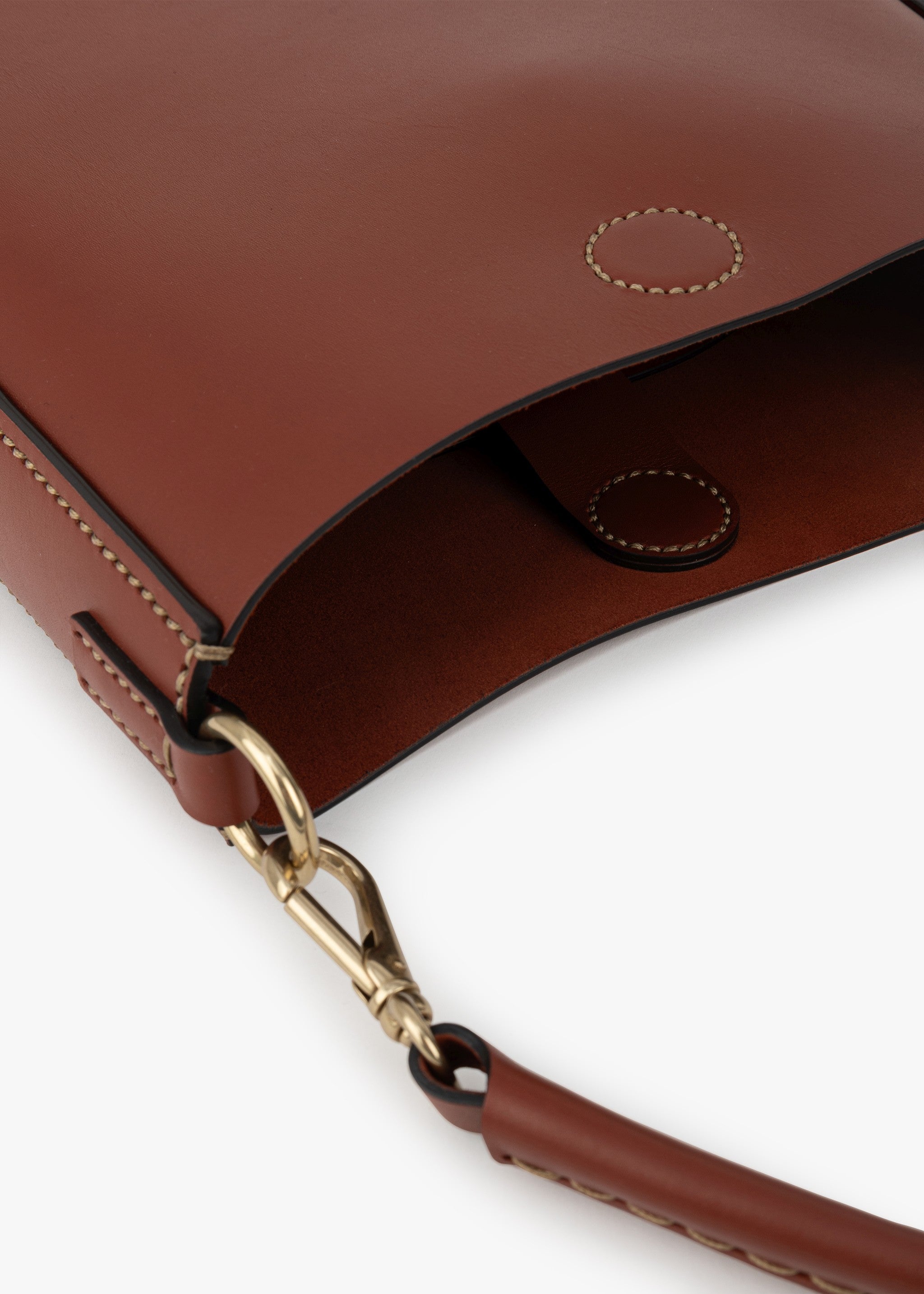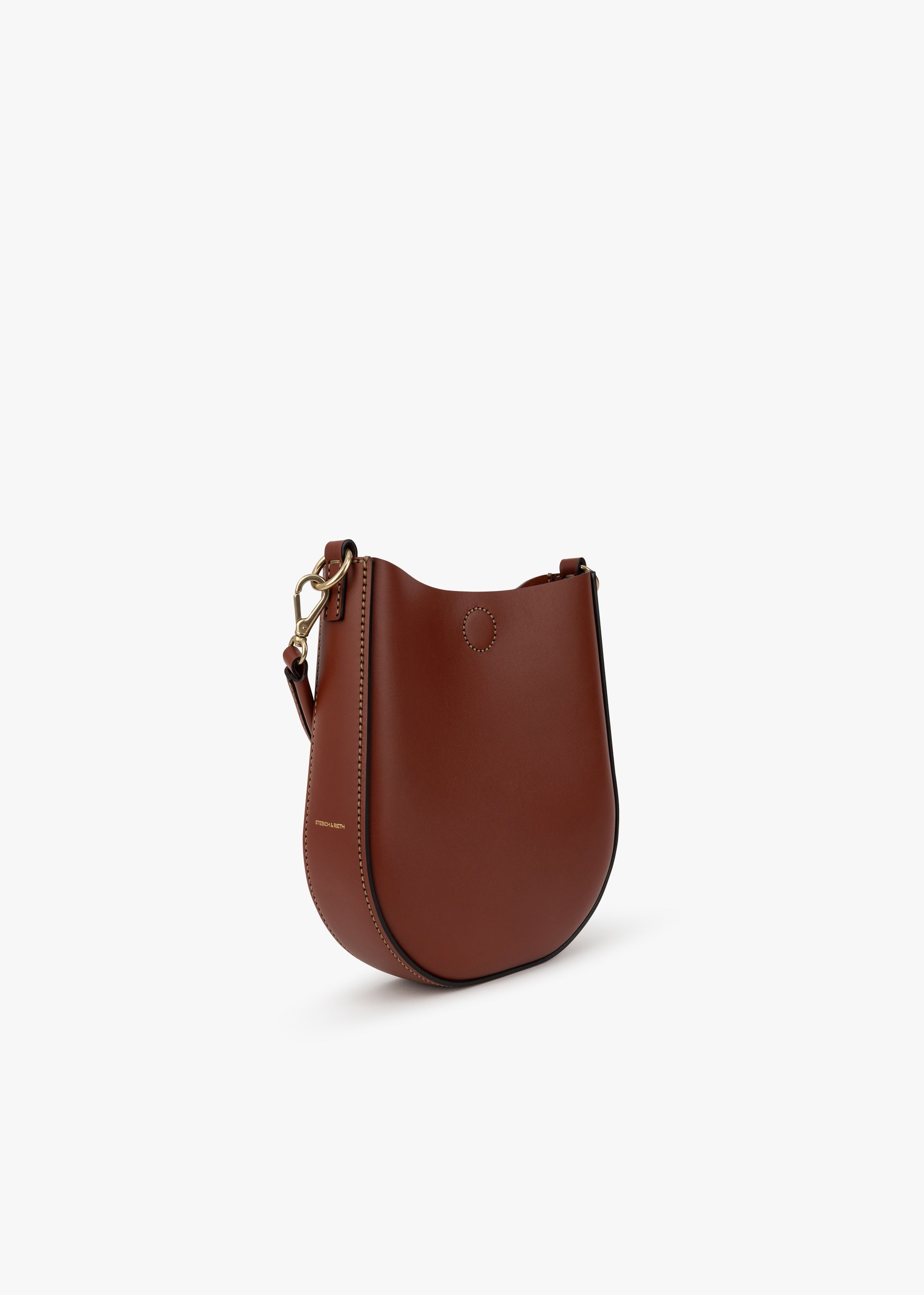Semi-circular bag 'Loop' by Stiebich + Rieth made of soft cowhide leather, magnetic closure, short hand-stitched handle and long shoulder strap with brass carabiners, hand-stitched details, one inside pocket, hand-stitched.