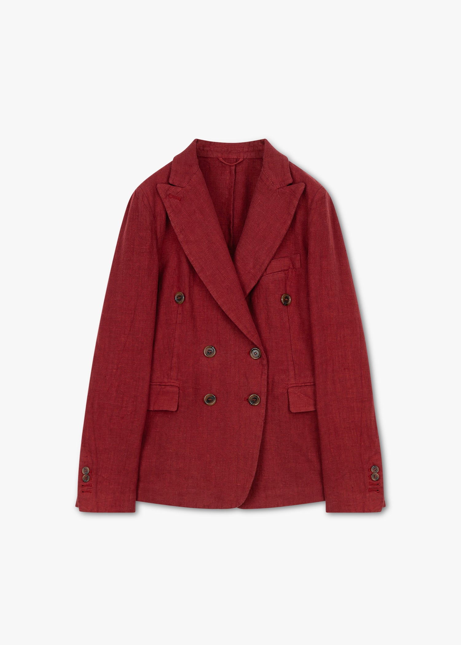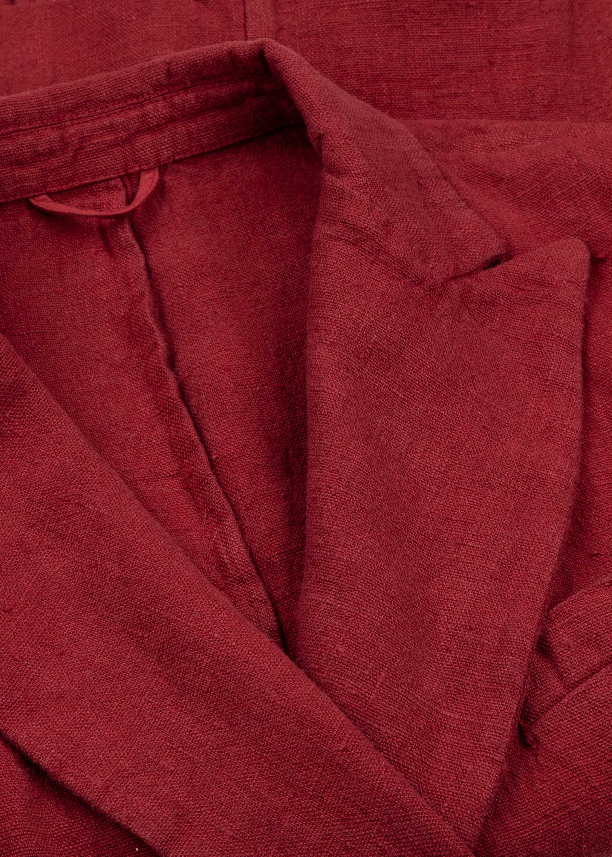 Structured linen blazer 'Lauren' by Kiltie, featuring a peaked lapel, one chest pocket, two flap pockets, long sleeves with buttoned cuffs, a straight hem with walking slits, and an unlined finish.