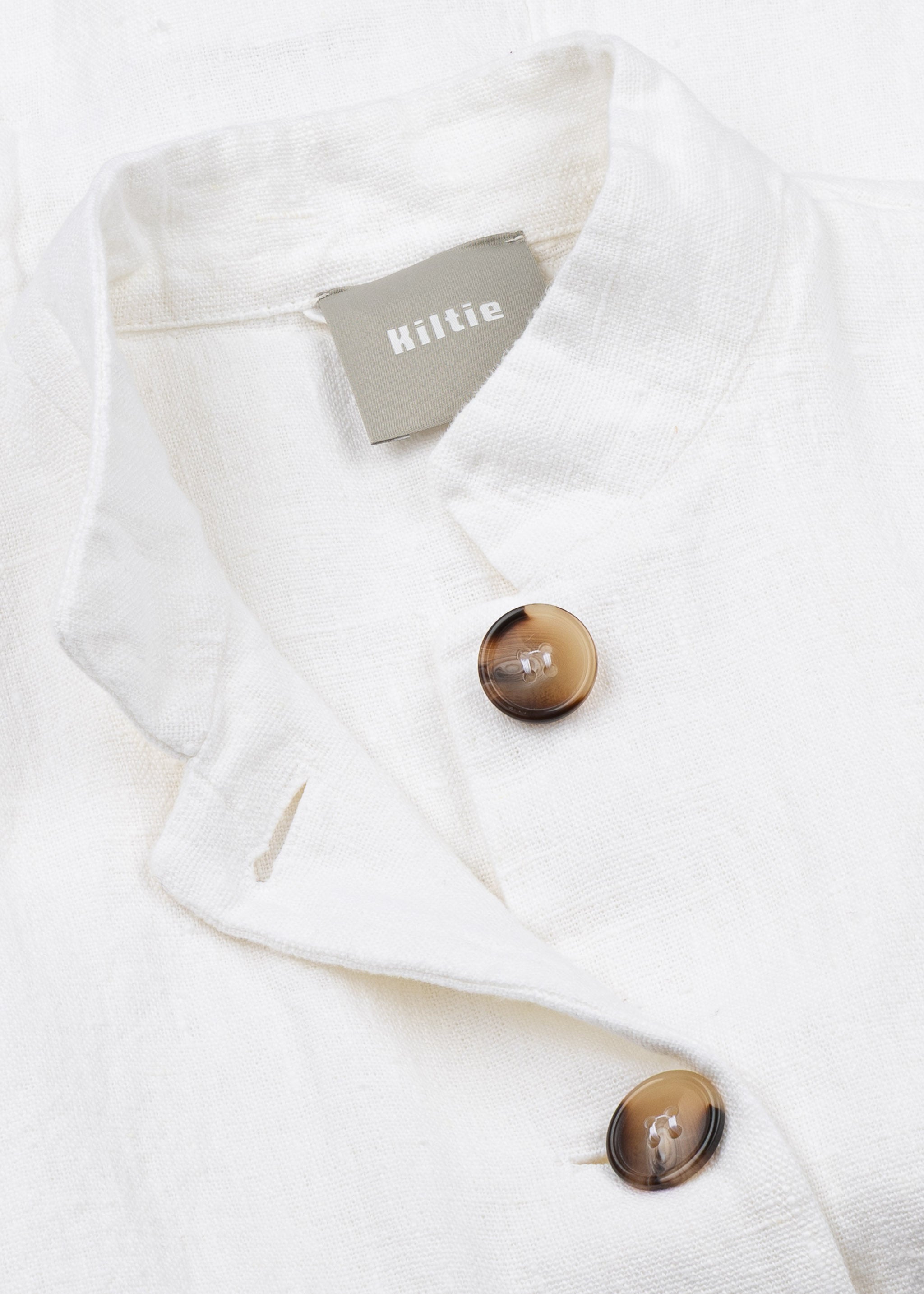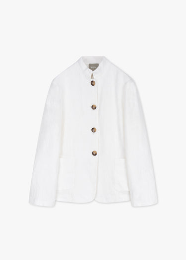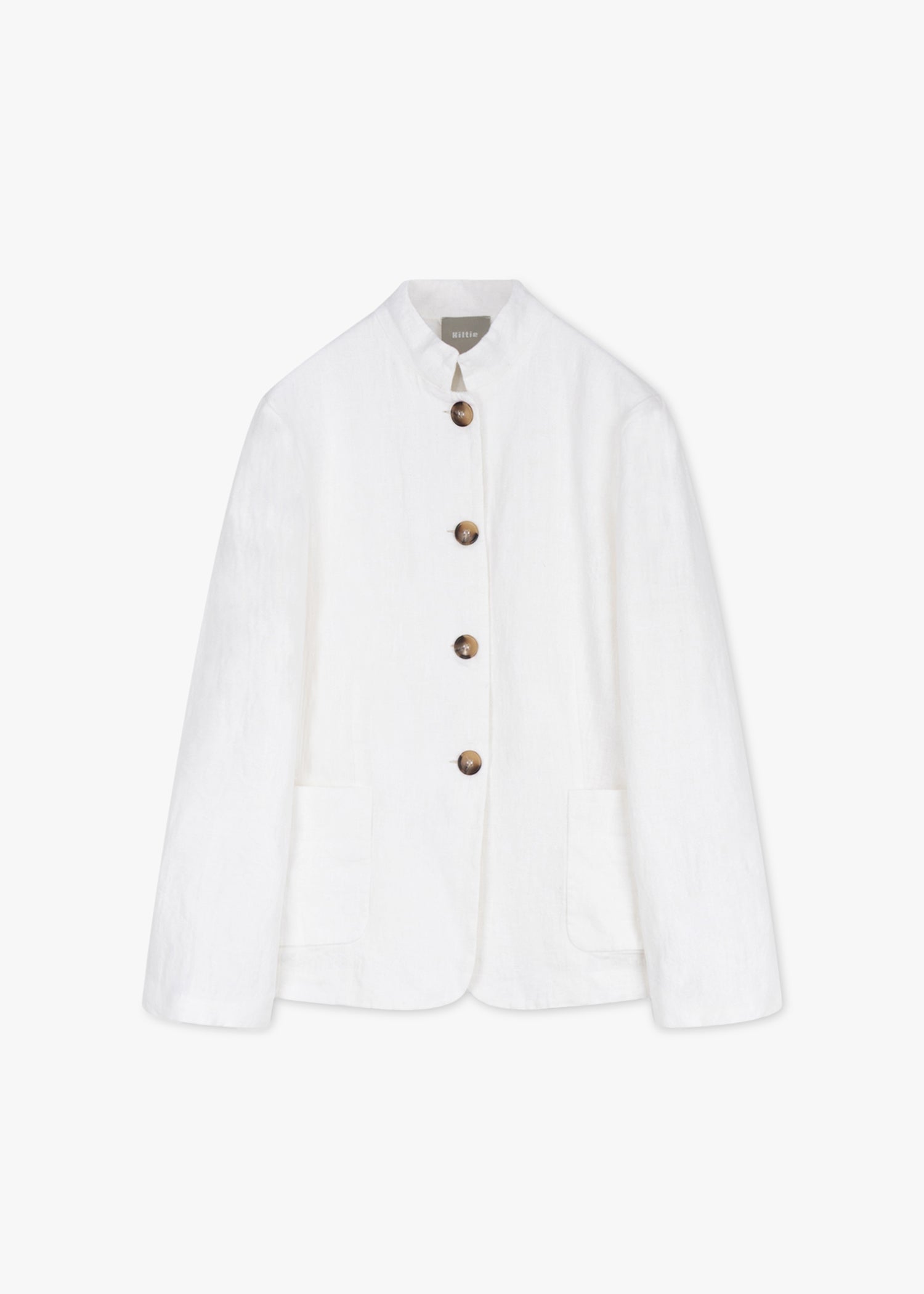 Tailored Guru Jacket 'Ginevra' by Kiltie in linen, stand-up collar, shortened sleeves with side slits, full button placket, two patch pockets, straight hem, unlined construction
