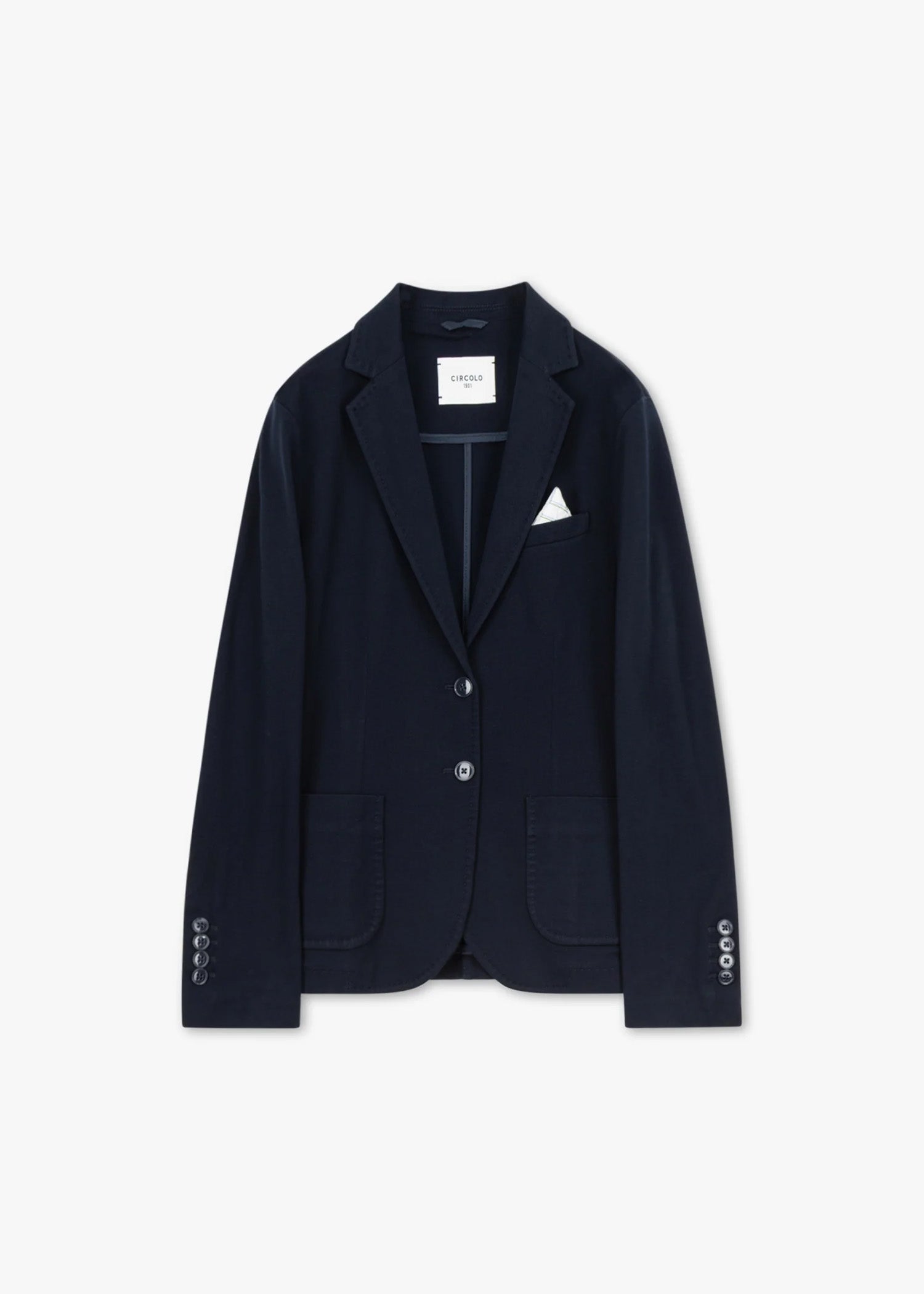 Slim blazer by Circolo 1901 made of lightweight cotton, notched lapel, long sleeves with buttoned cuffs, one breast pocket with sewn-in pocket square, two flap pockets, darts in the front and back, decorative seams, slightly rounded hem, stretch fabric, unlined.