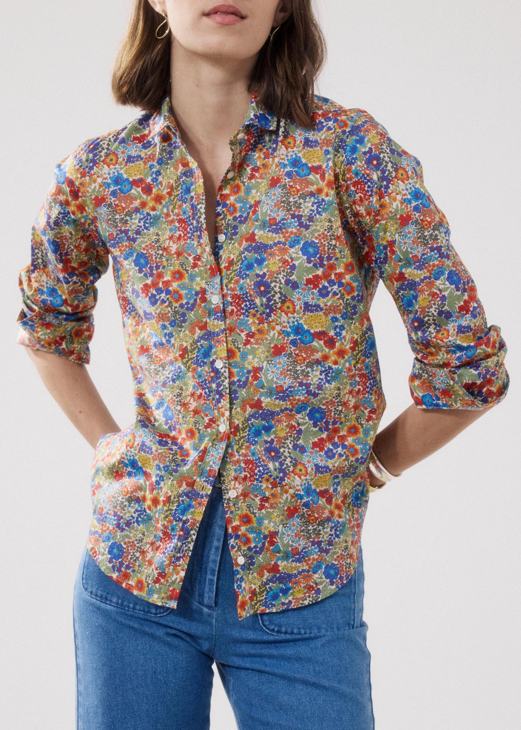 Floral blouse 'Corazon' by Hartford made of fine Liberty fabric, classic collar, back yoke with box pleat, full button placket, long sleeves with buttoned cuffs, rounded hem.