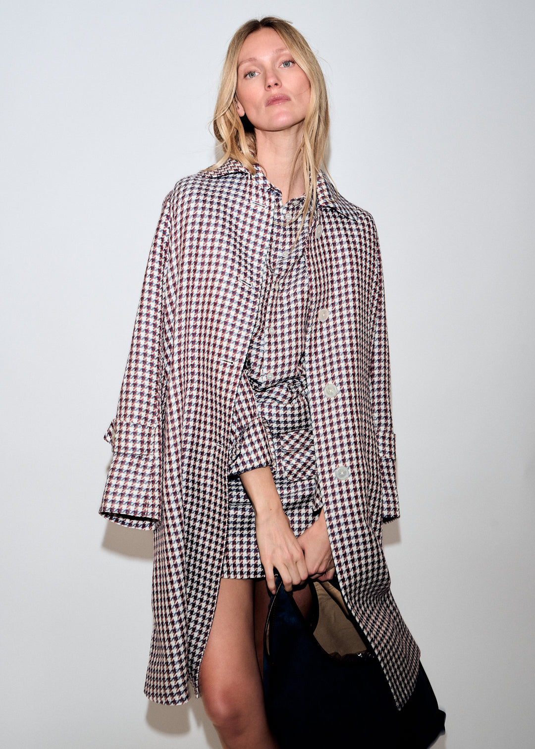 Structured coat by PiaLea made from a silk-linen blend, classic collar, long sleeves with tabs, back yoke with box pleat, full button placket, side pockets, straight hem, partially lined finish.