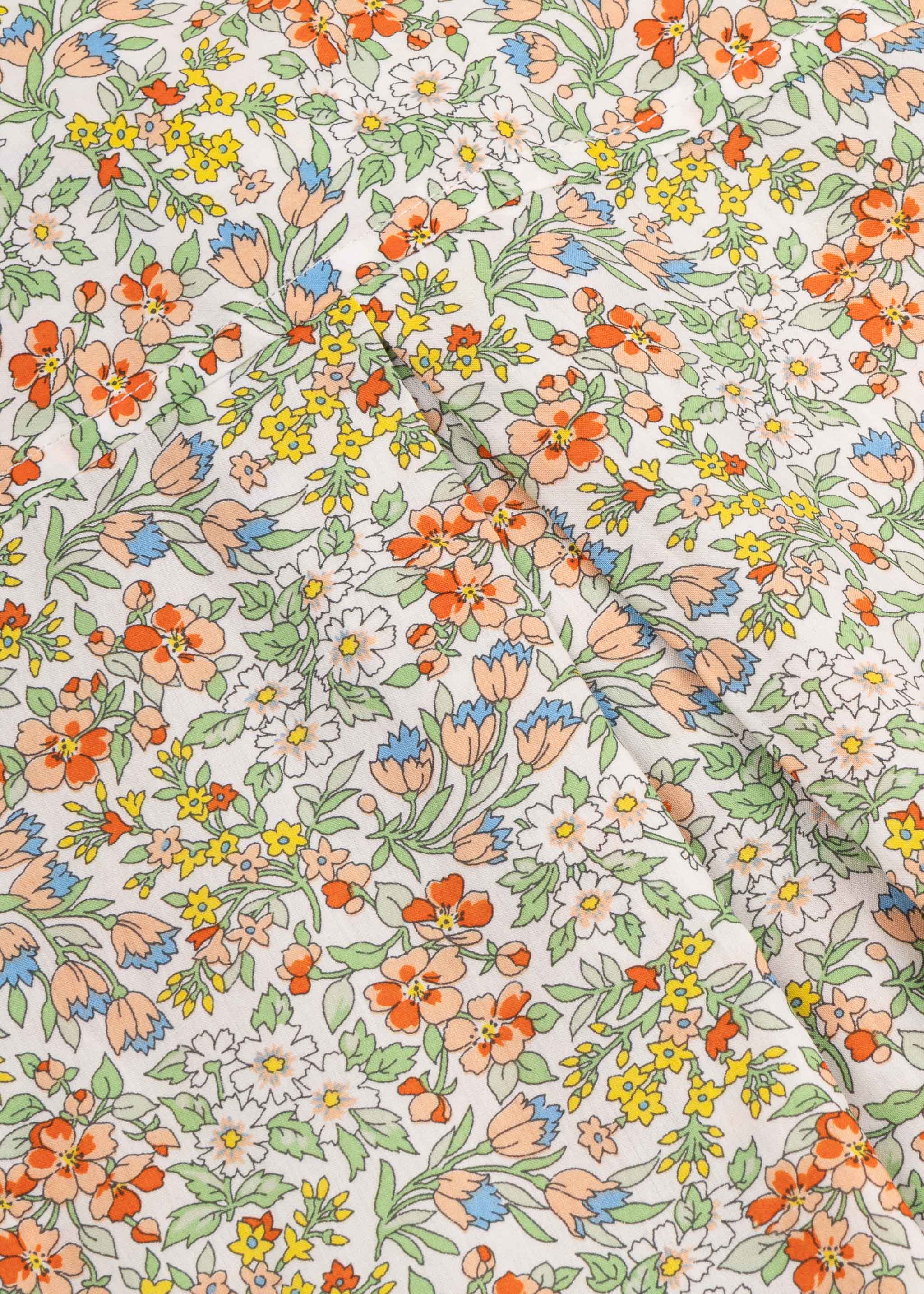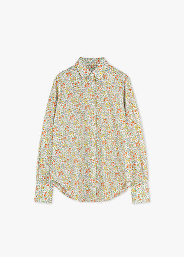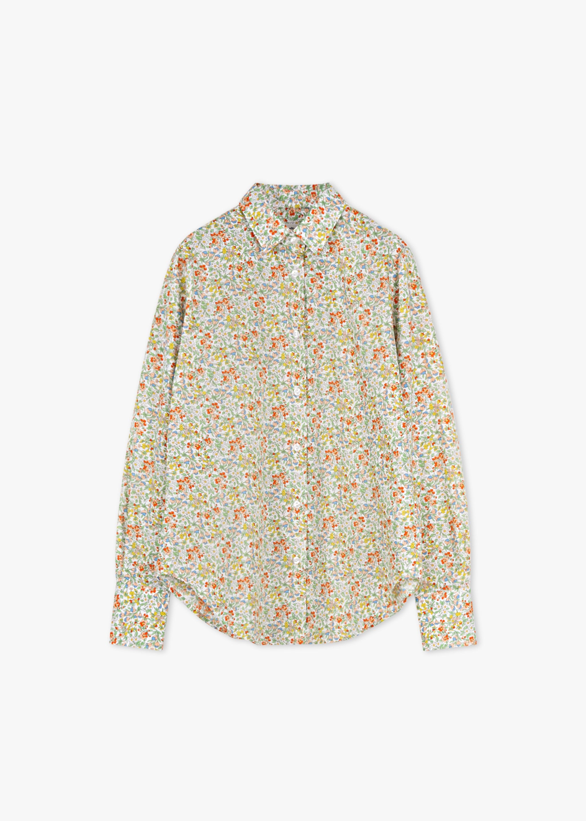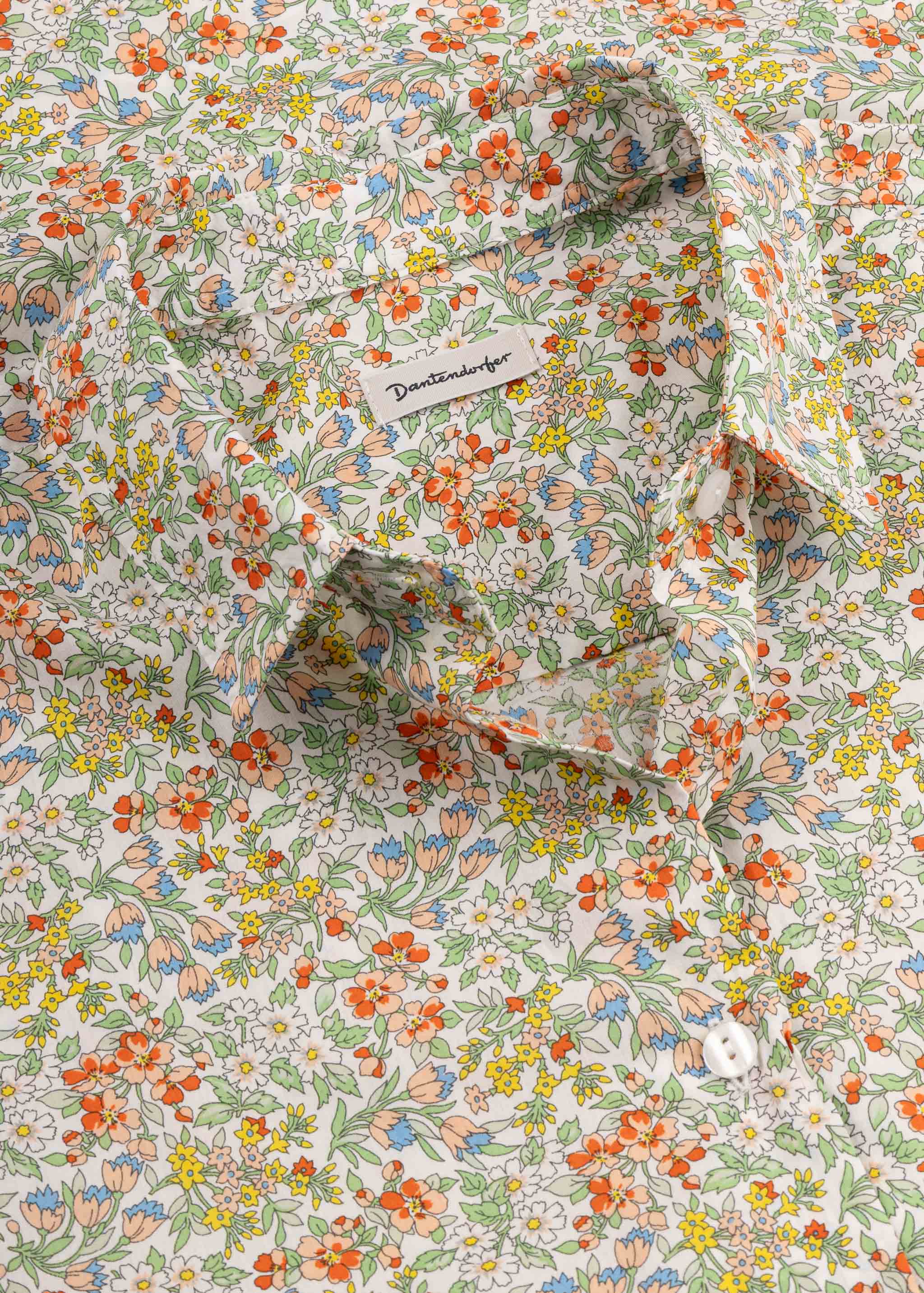 Floral blouse by Dantendorfer made of fine Liberty fabric, classic collar, full-length mother-of-pearl button placket, long sleeves with buttoned cuffs, back yoke with box pleat, rounded hem.