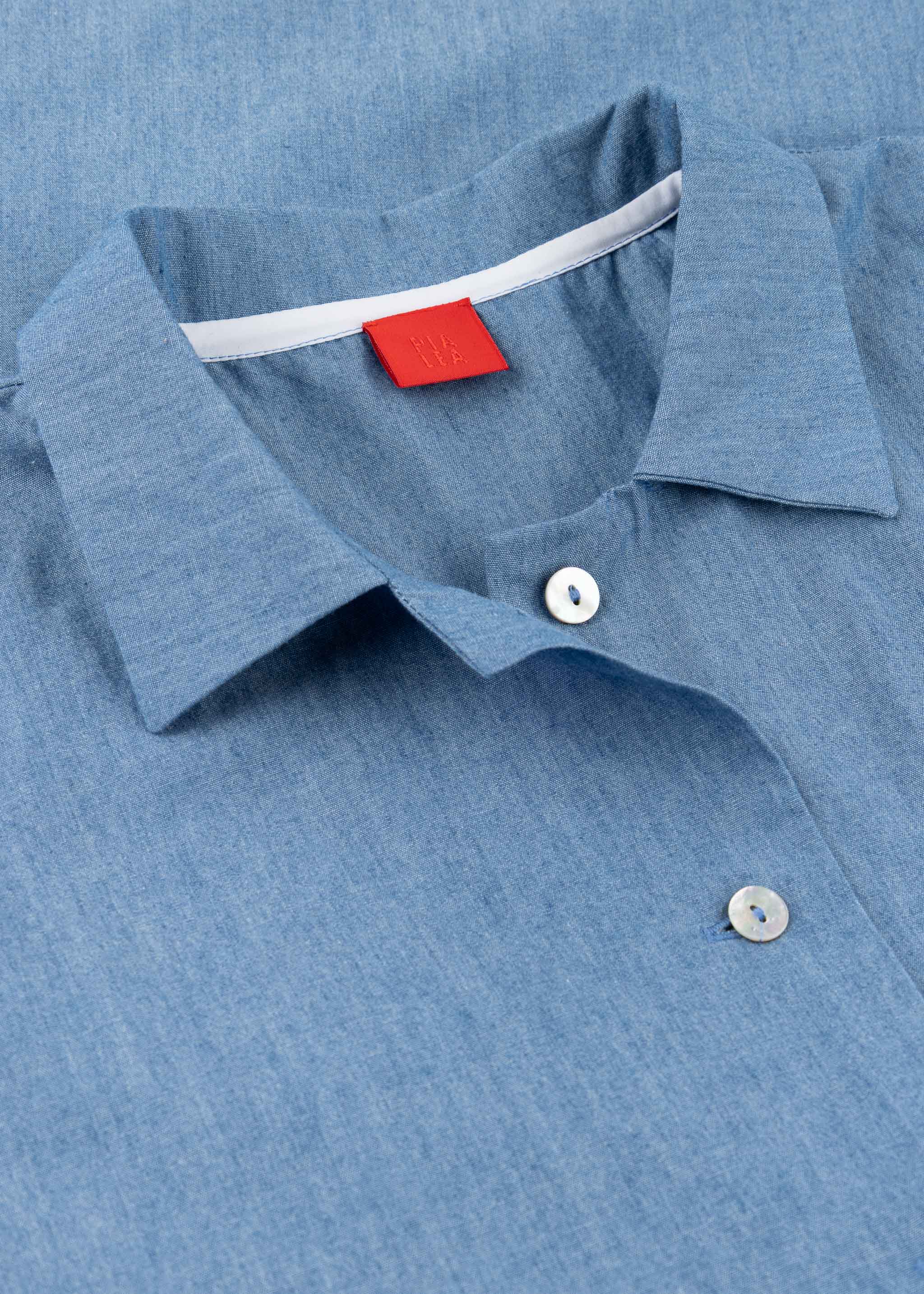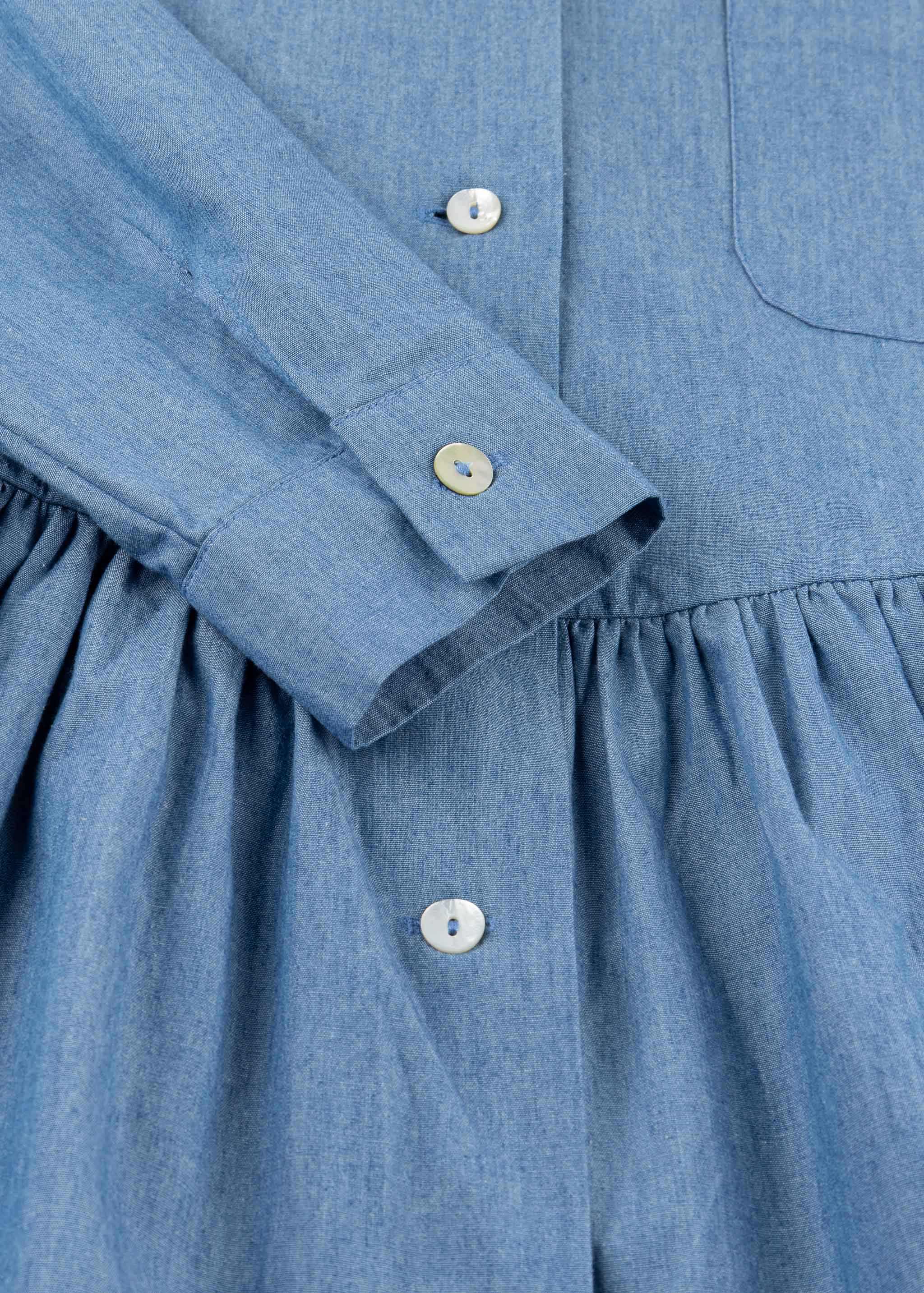 Loose dress 'Marta' by PiaLea made of fine cotton, classic collar, slightly dropped shoulder, shortened sleeves with button cuffs, full button placket, one breast pocket, skirt with pleats, side pockets, straight hem.