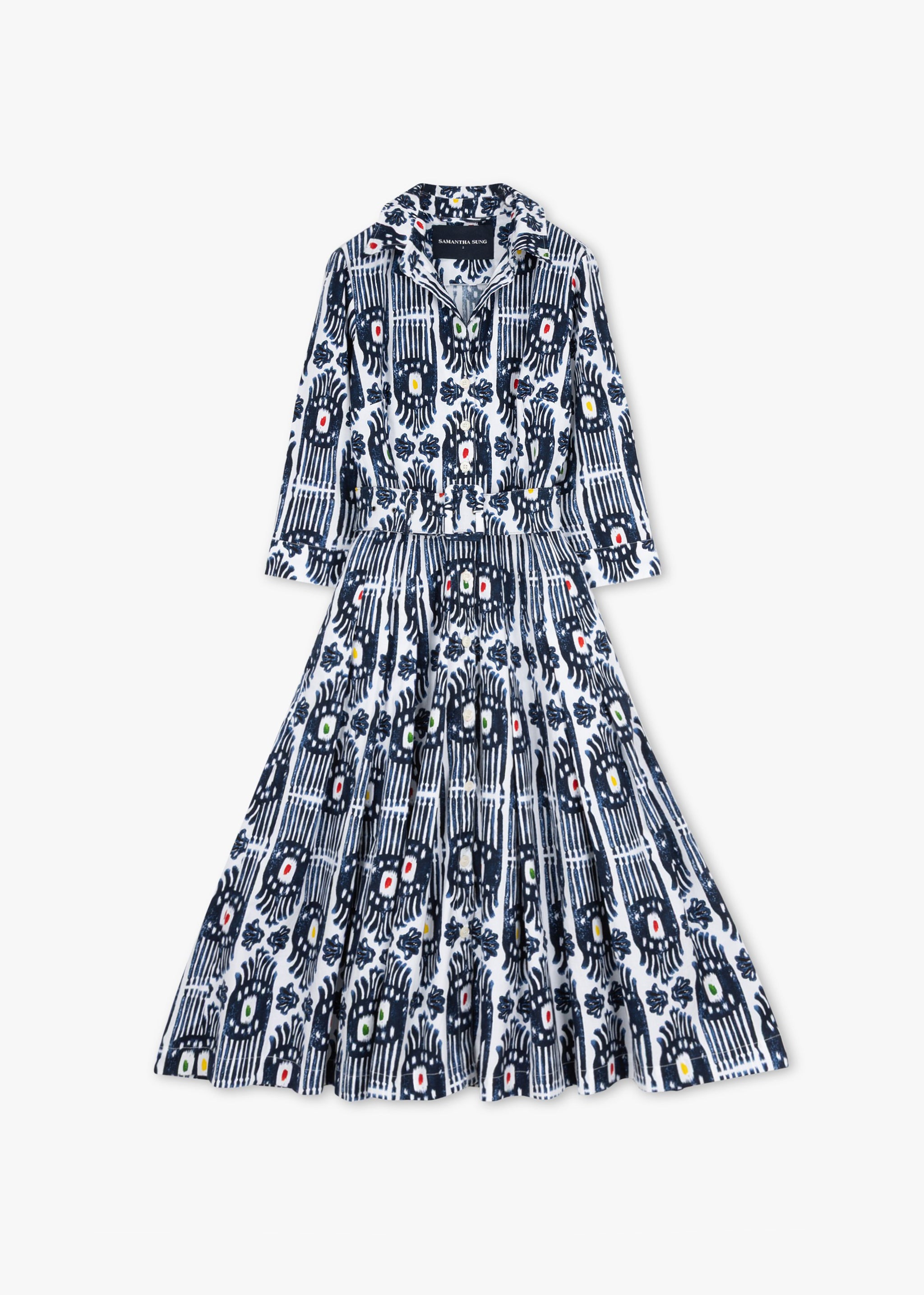 Patterned midi blouse dress 'Audrey Ikat' by Samantha Sung made of cotton with stretch, classic collar, full button placket, 3/4 sleeves with buttoned cuffs, pleated skirt, side pockets, includes waist belt, straight hem.
