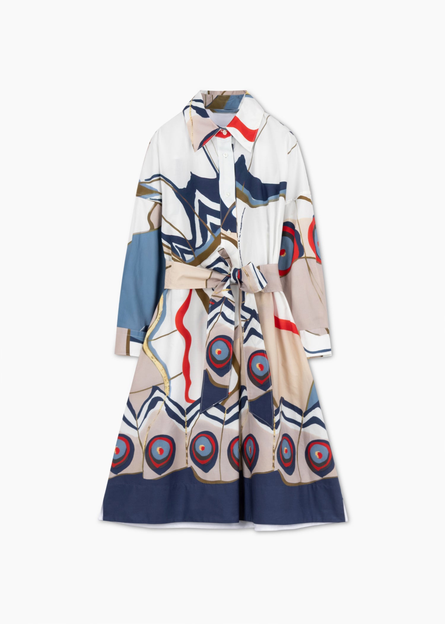 Patterned midi blouse dress 'Ekatery' by Sara Roka made of cotton, classic collar with button placket, dropped shoulders, 3/4 sleeves with buttoned cuffs, back yoke with box pleats, side pockets, detachable waist belt, straight hem.