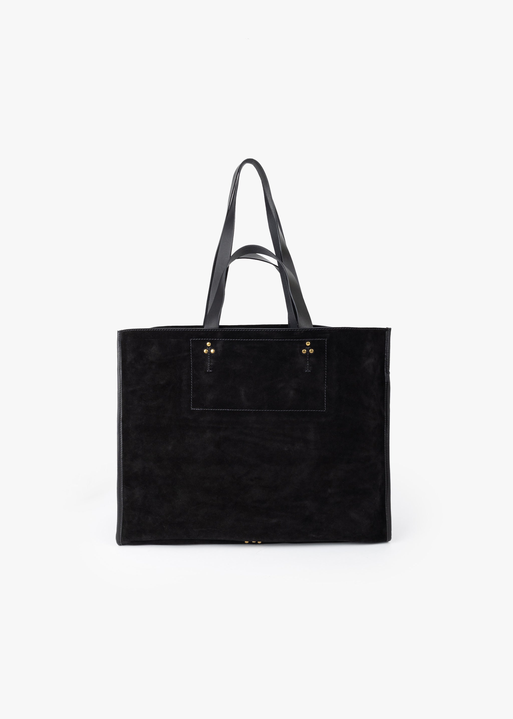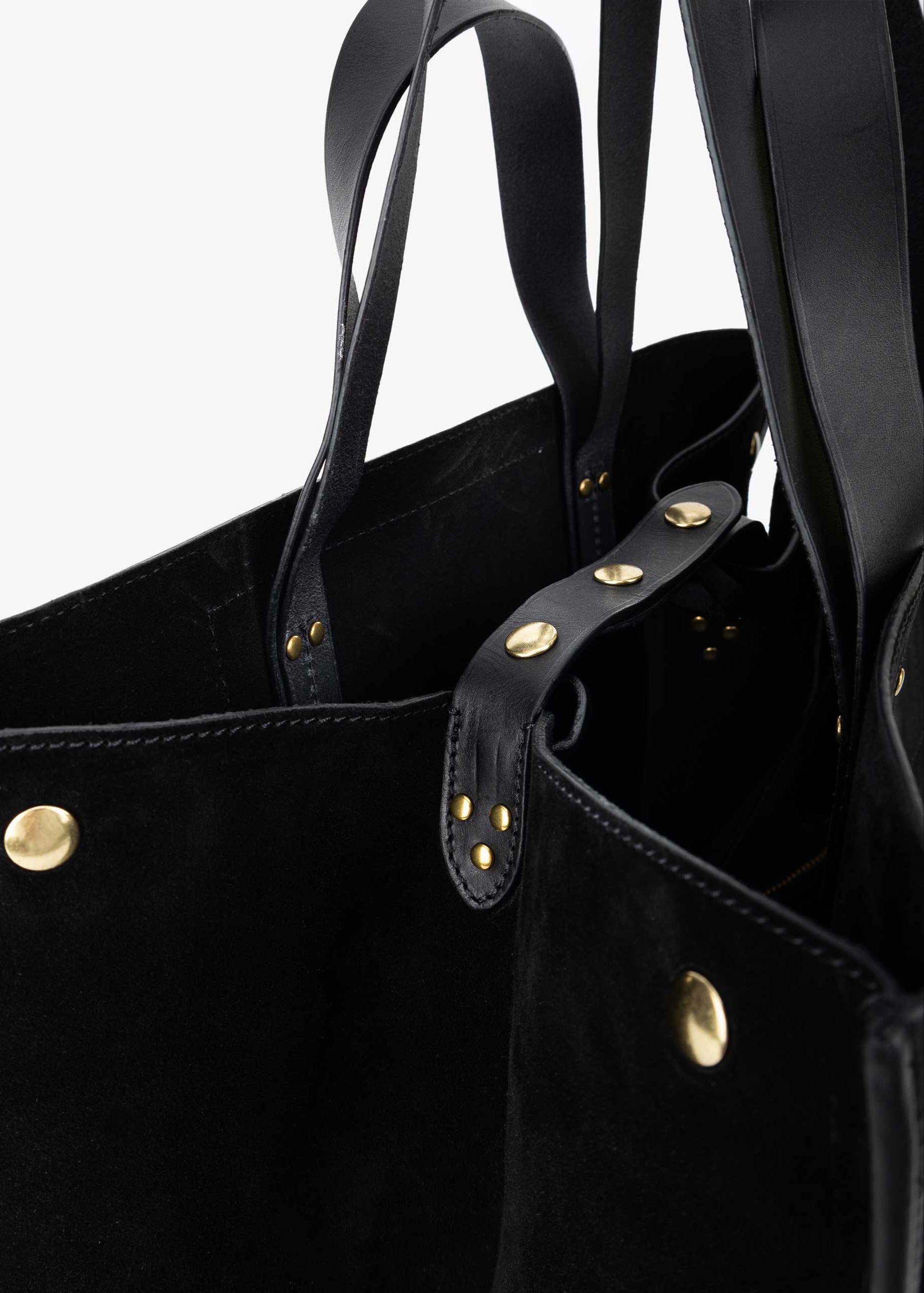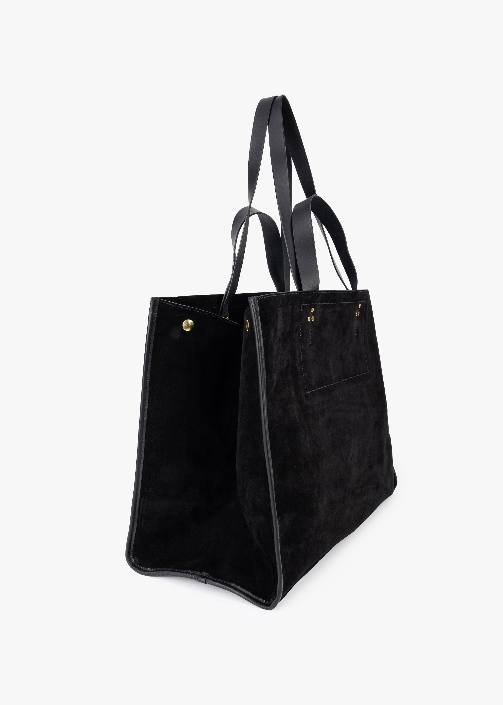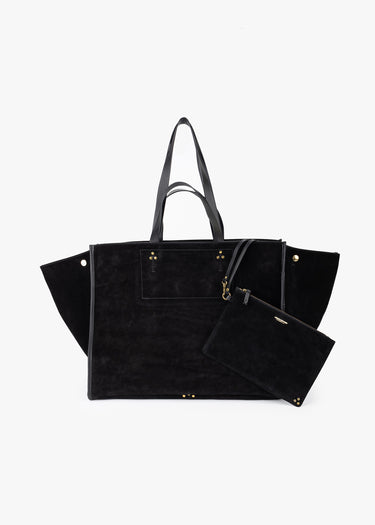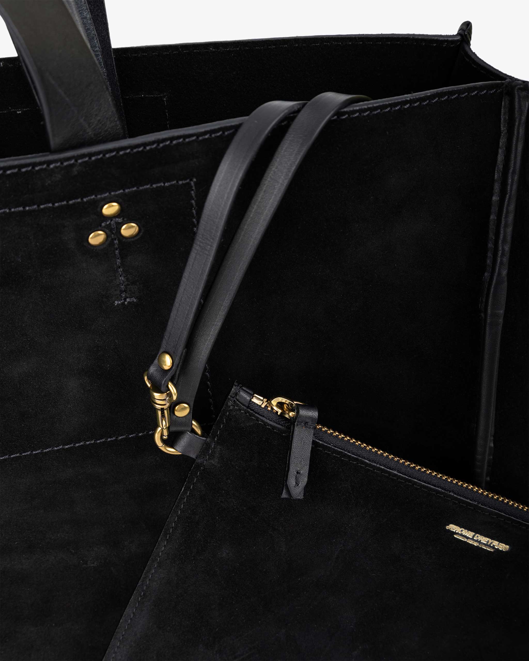 Suede leather bag by Jerome Dreyfuss, two short handles, two long shoulder straps, removable pochette, closes with snap fastener on a small leather strap.