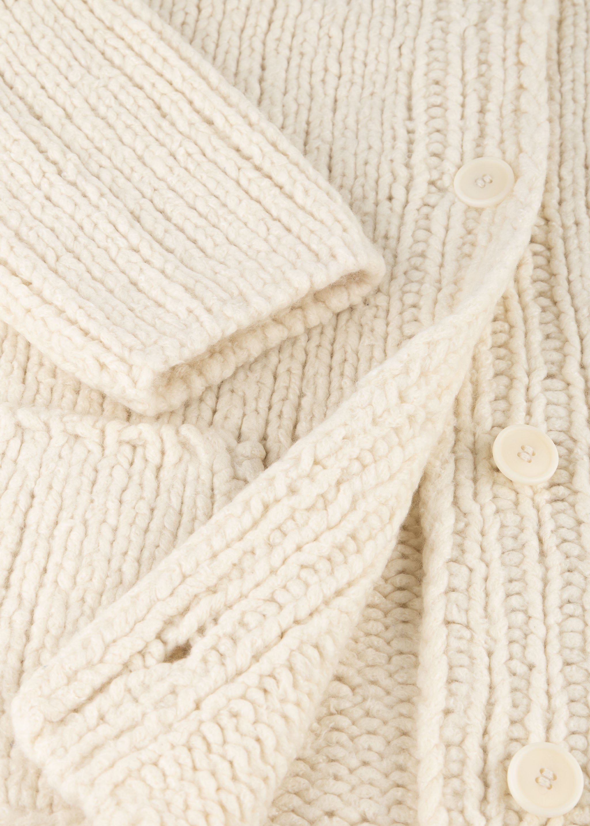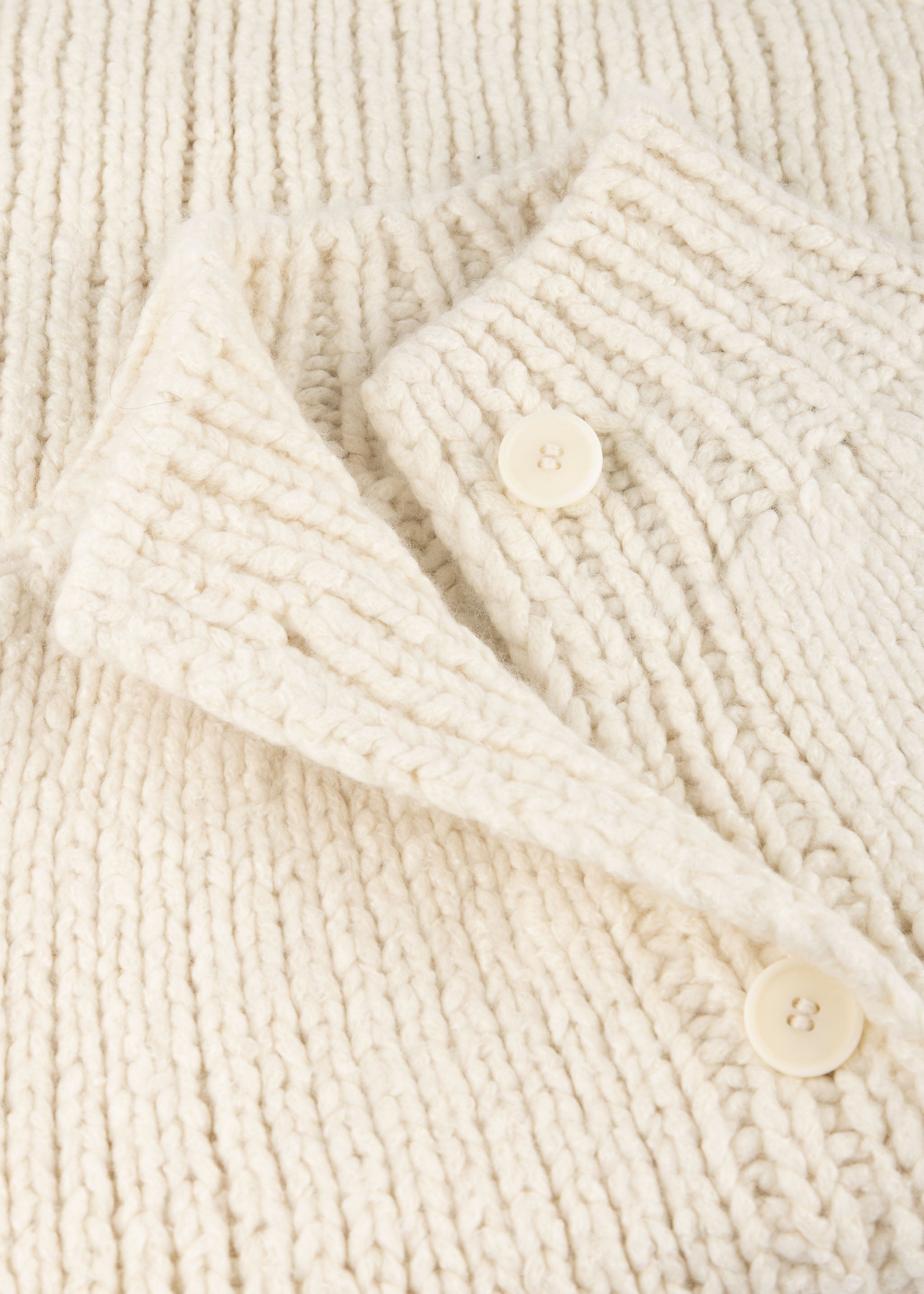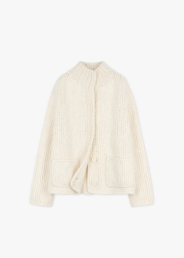 Hand-knitted cardigan by Wommelsdorff made from a fine cashmere-silk blend, textured knit, stand-up collar, button placket, dropped shoulders, long sleeves, two patch pockets, straight hem.