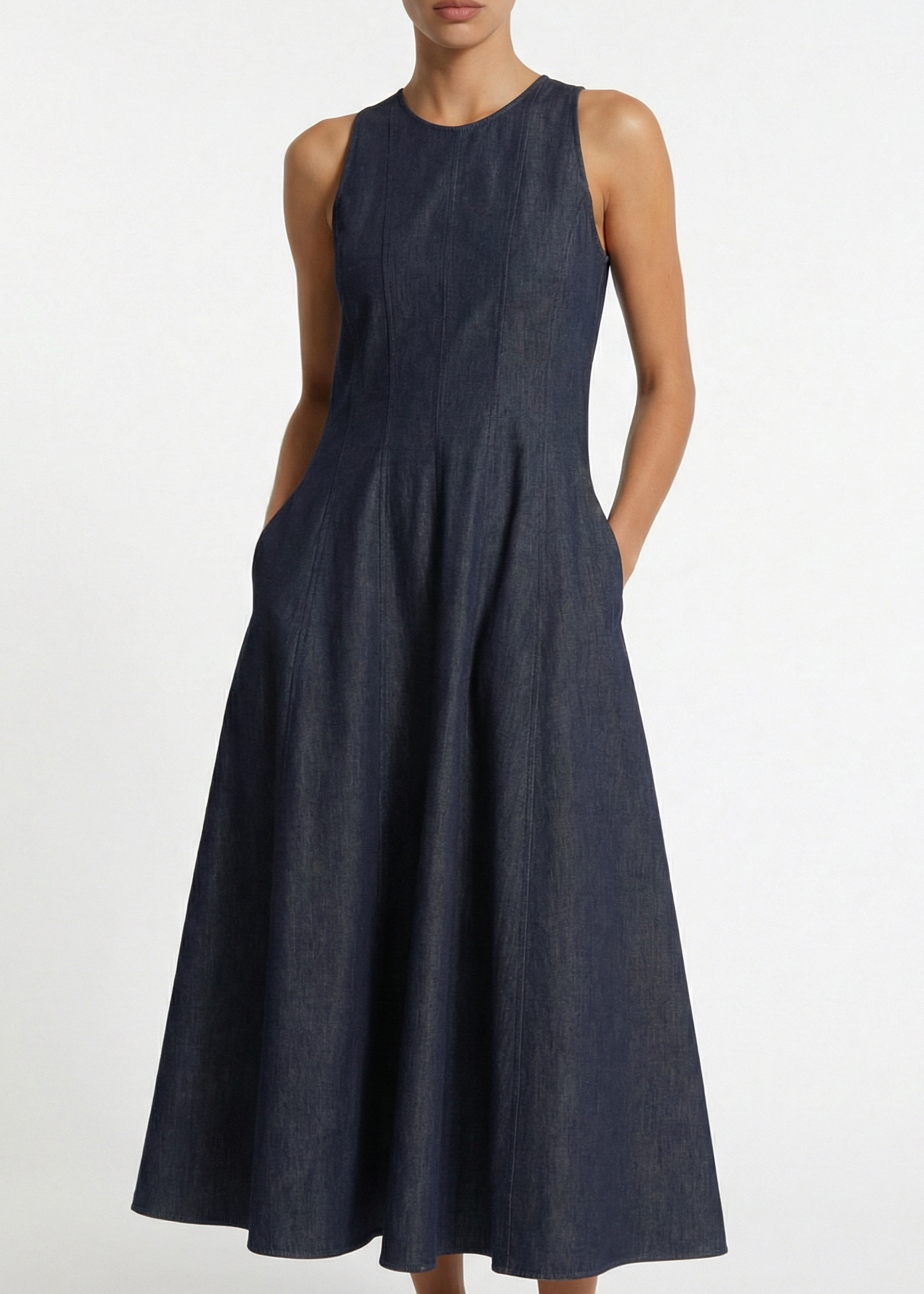Fitted dress 'Monsen' by Antonelli made from a soft cotton-linen blend in a denim look, round neckline and concealed zipper at the back, side pockets, straight hem.