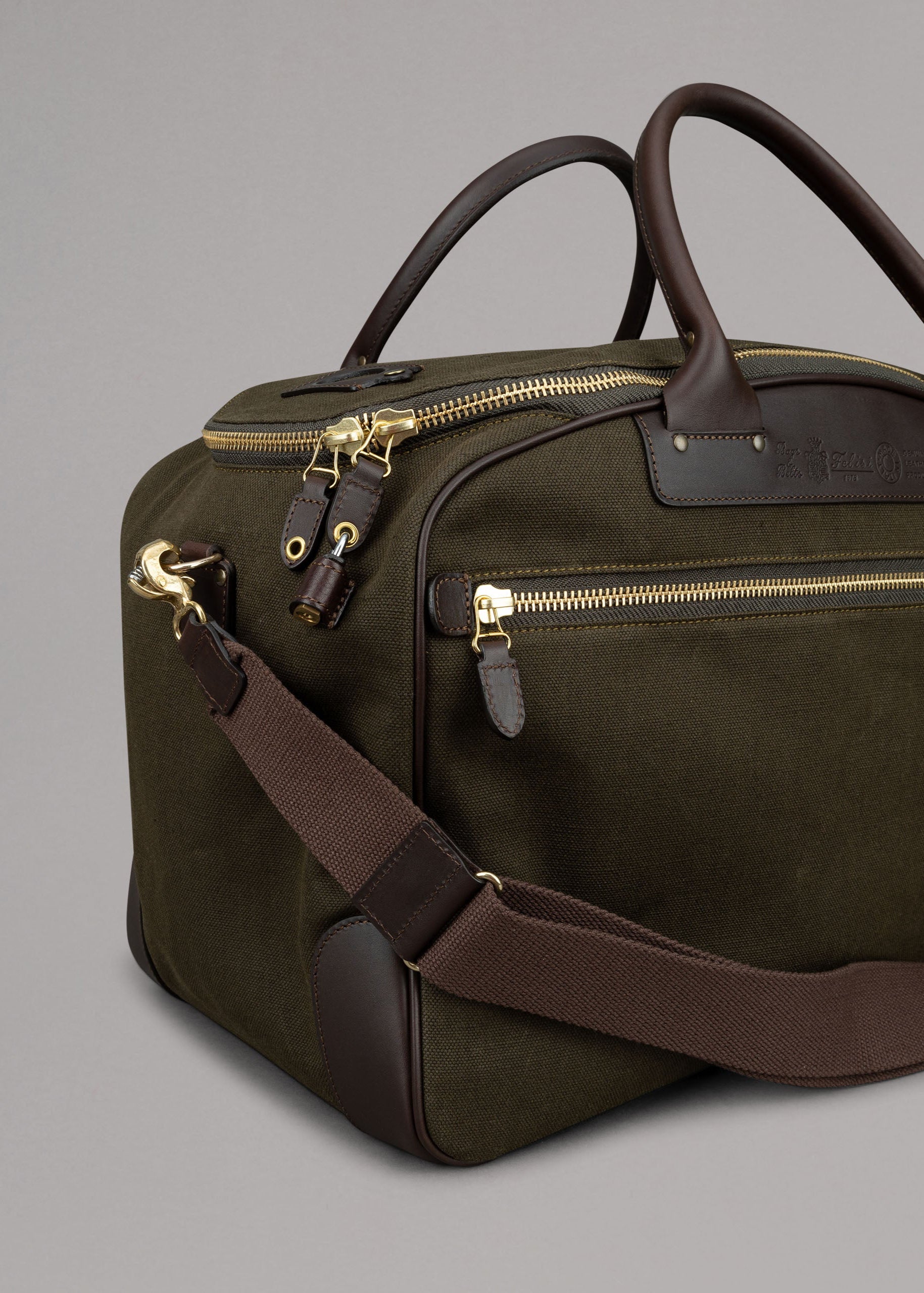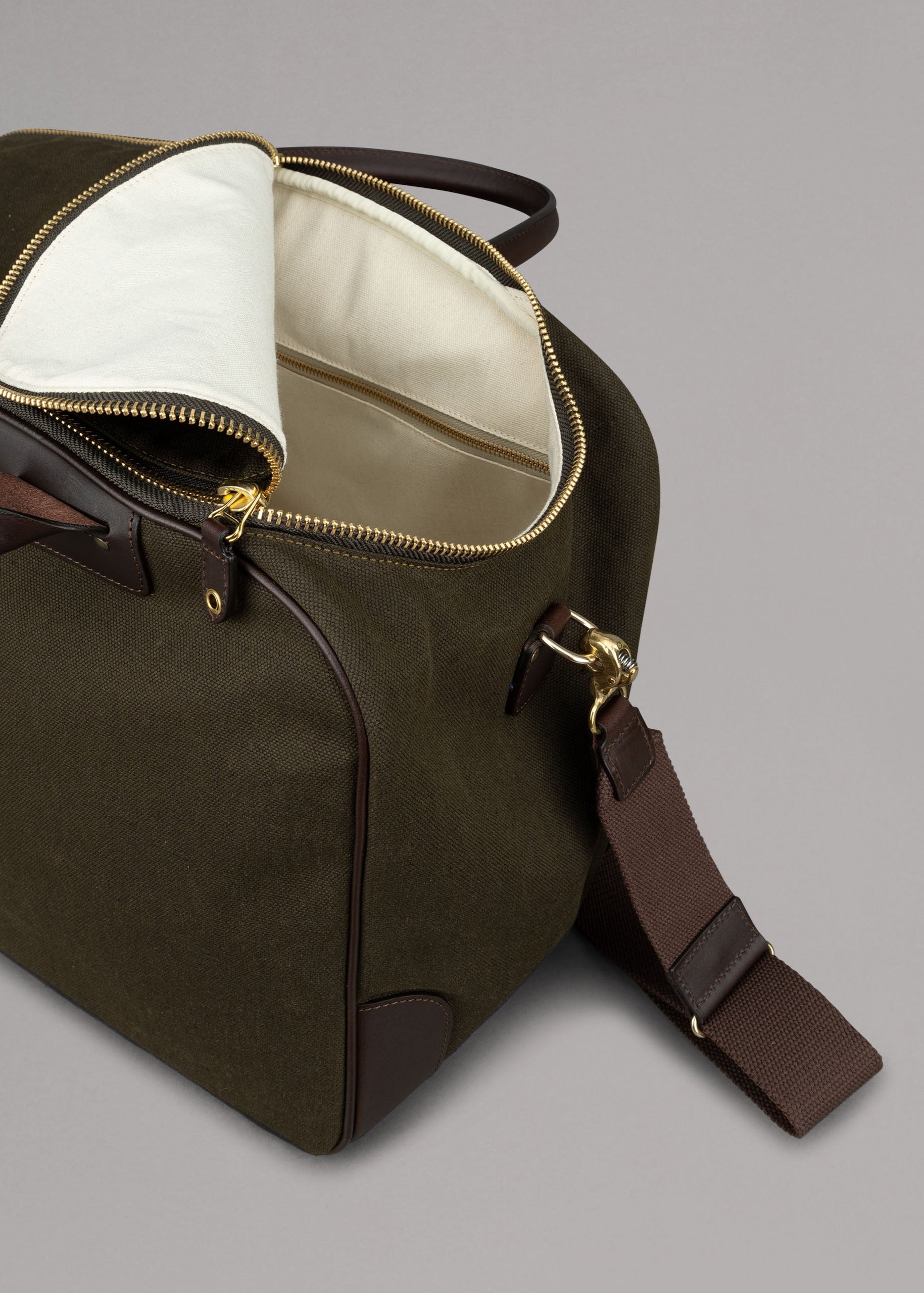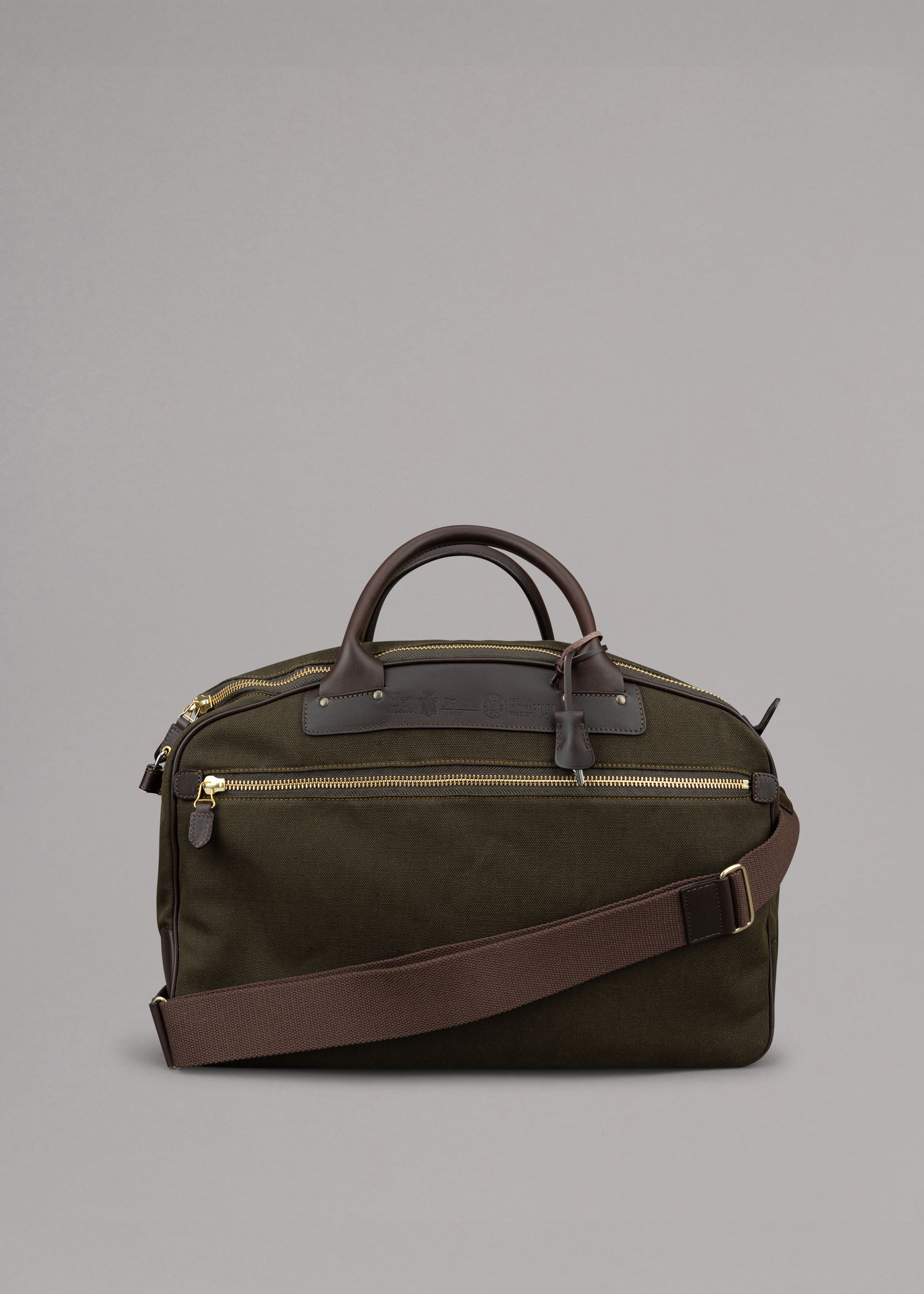 Felisi travel bag made of sturdy cotton canvas with dark brown leather trim, two zippered interior pockets, an adjustable cotton shoulder strap, a lock and key with a dark brown "vacchetta" leather cover, a sewn-on name tag, and brass details.