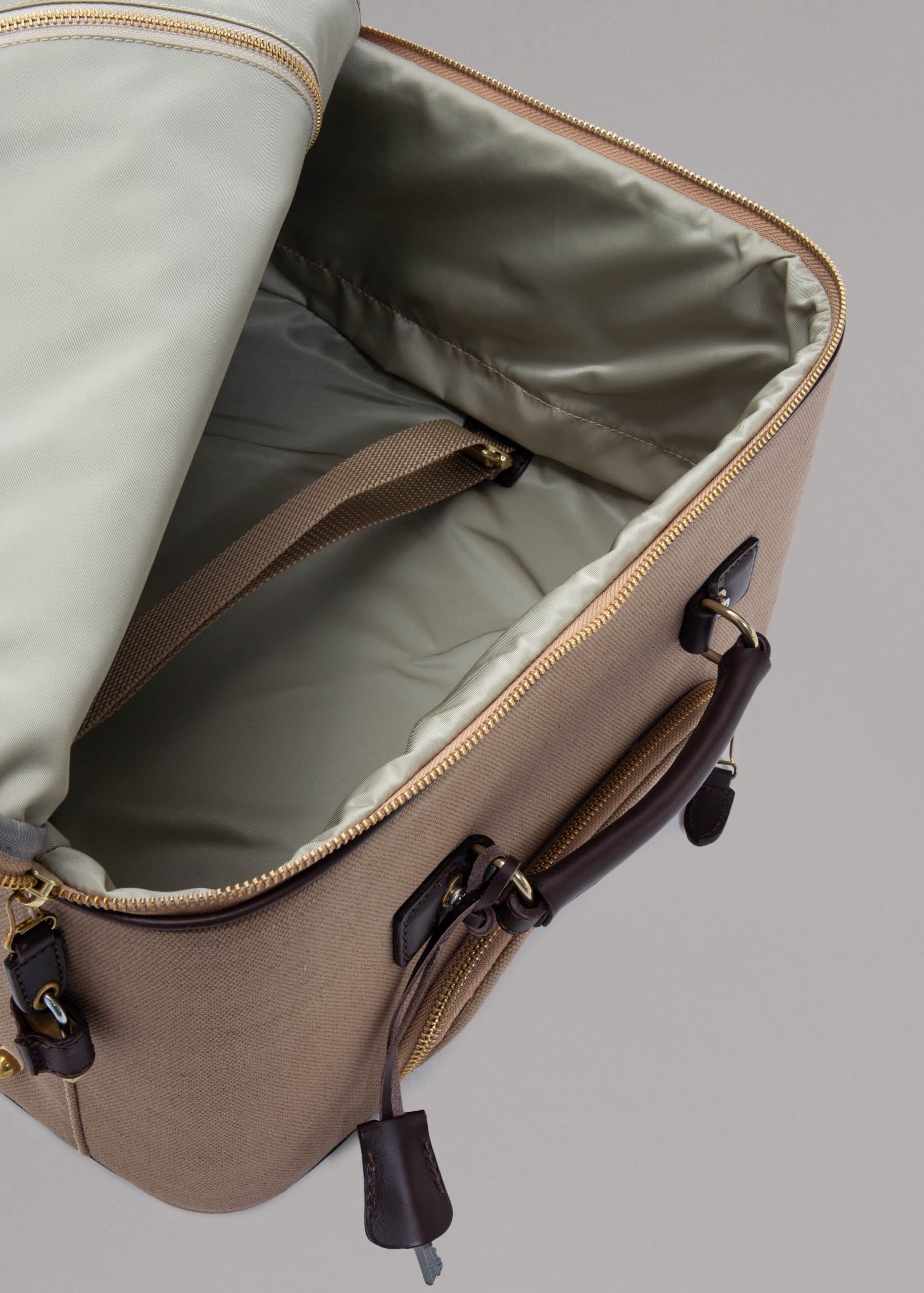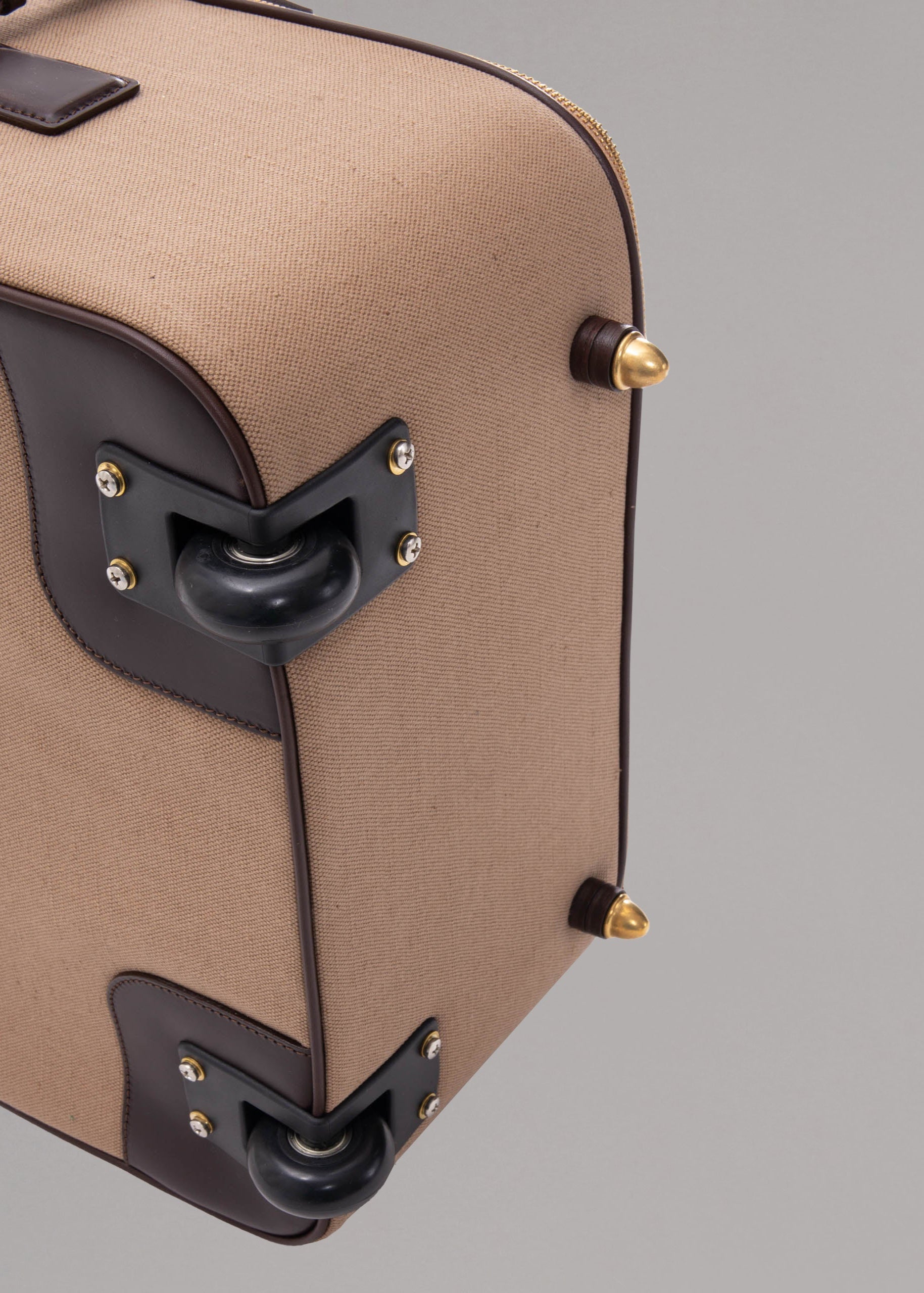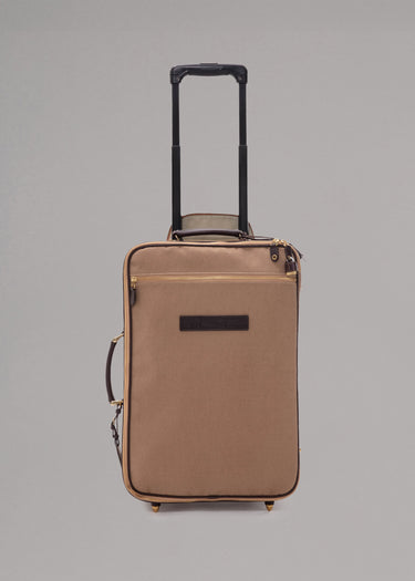 Trolley by Felisi, large storage compartment with two straps and a pocket with zip, an outside pocket, extendable and size-adjustable metal handle with zip pocket for stowing, brass lock with key, two leather handles & two wheels.