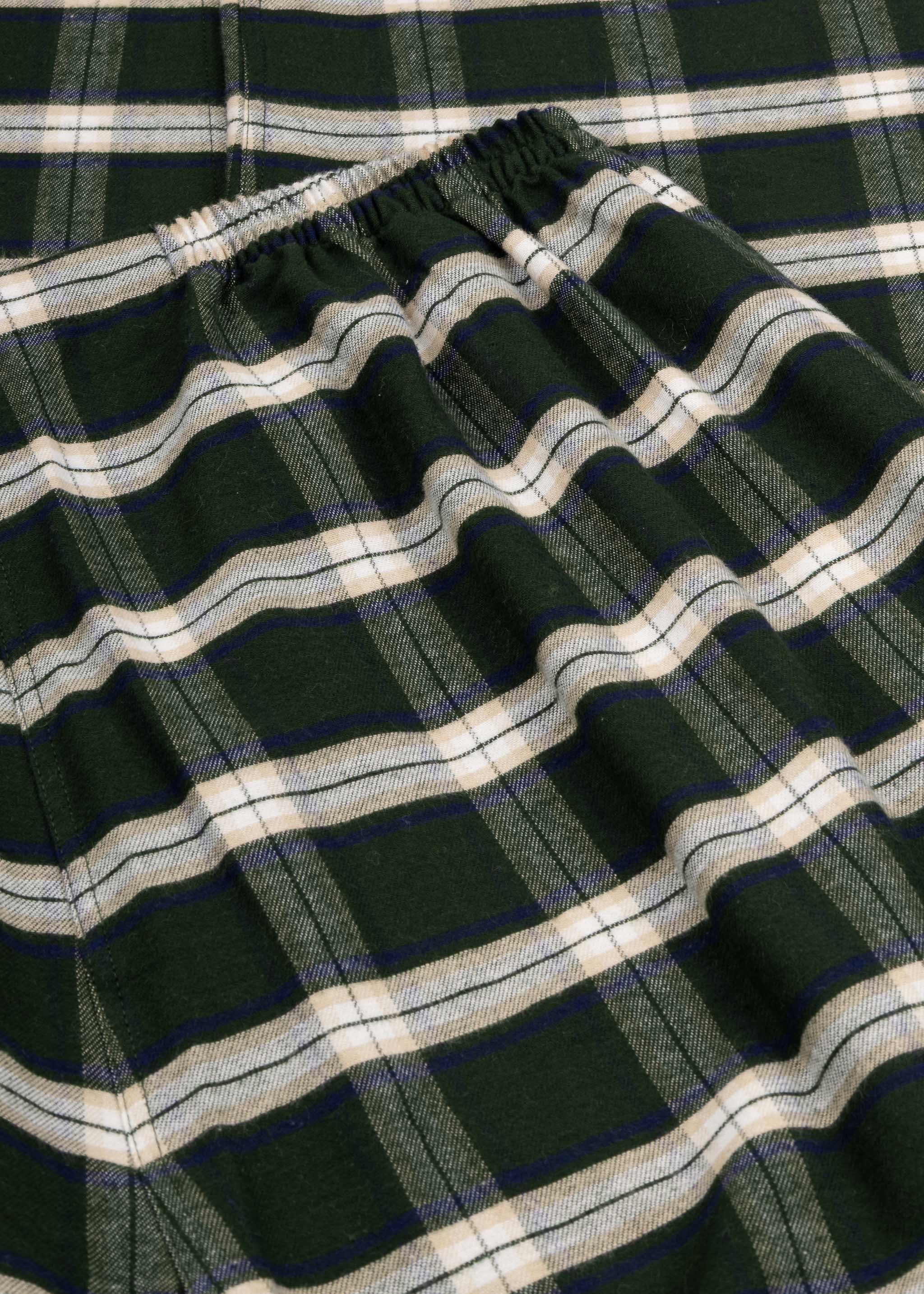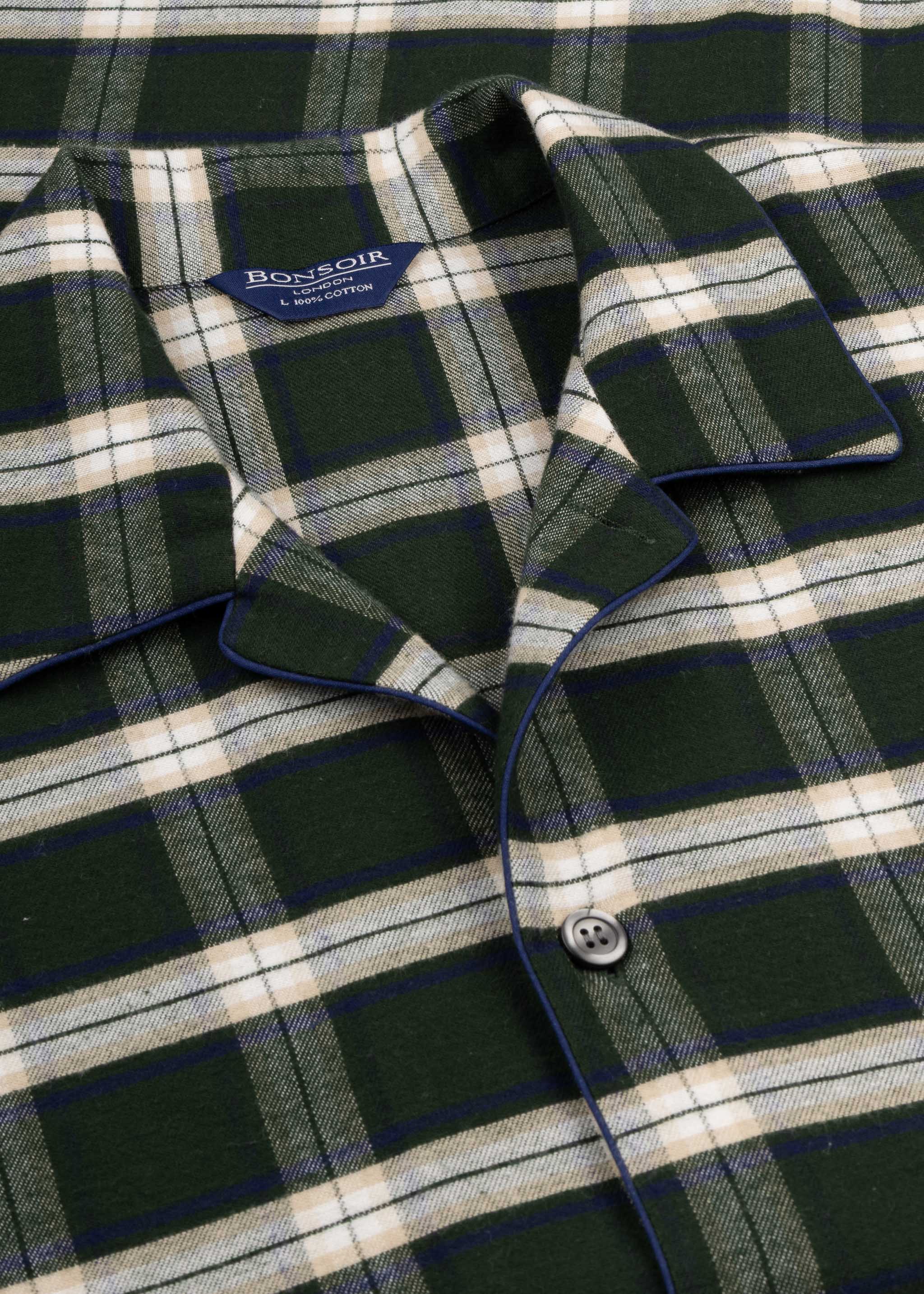 Bonsoir's 'Holtwood' checked flannel pajama set in brushed cotton, featuring a classic collar, three patch pockets, full button placket, straight hem, and trousers with elasticated waistband and button closure.