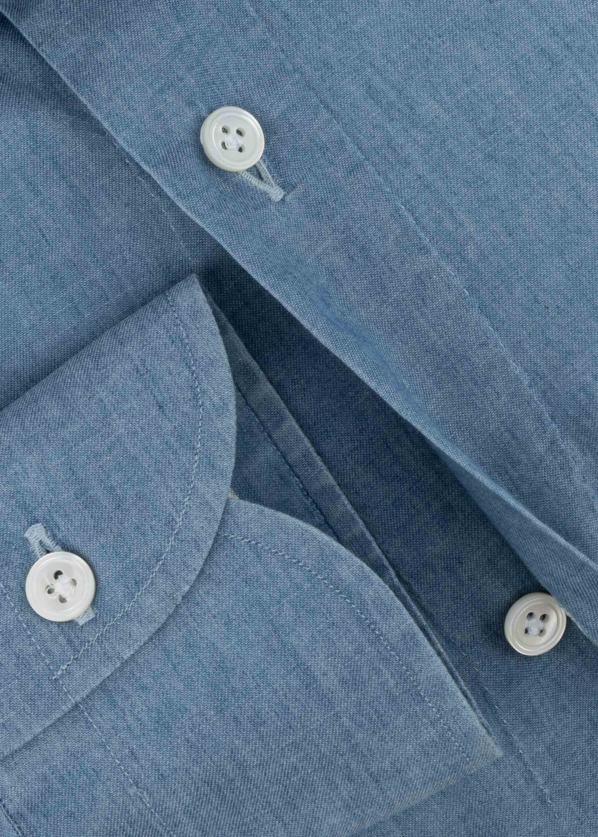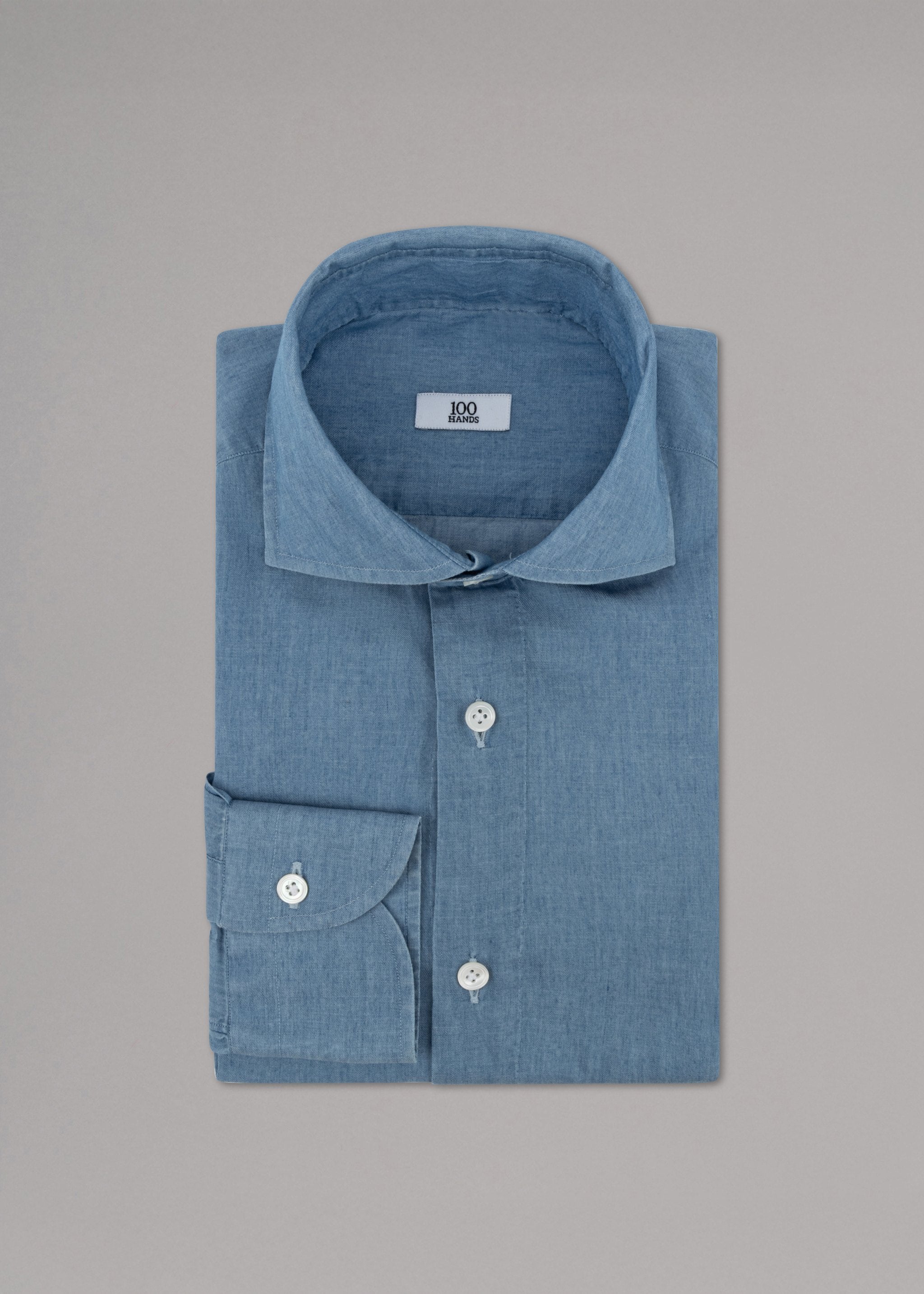 Denim shirt 'Shiller' by 100 Hands made of soft cotton, pointed collar, full mother-of-pearl button placket, long sleeves with buttoned cuffs, darts in the back, rounded hem.